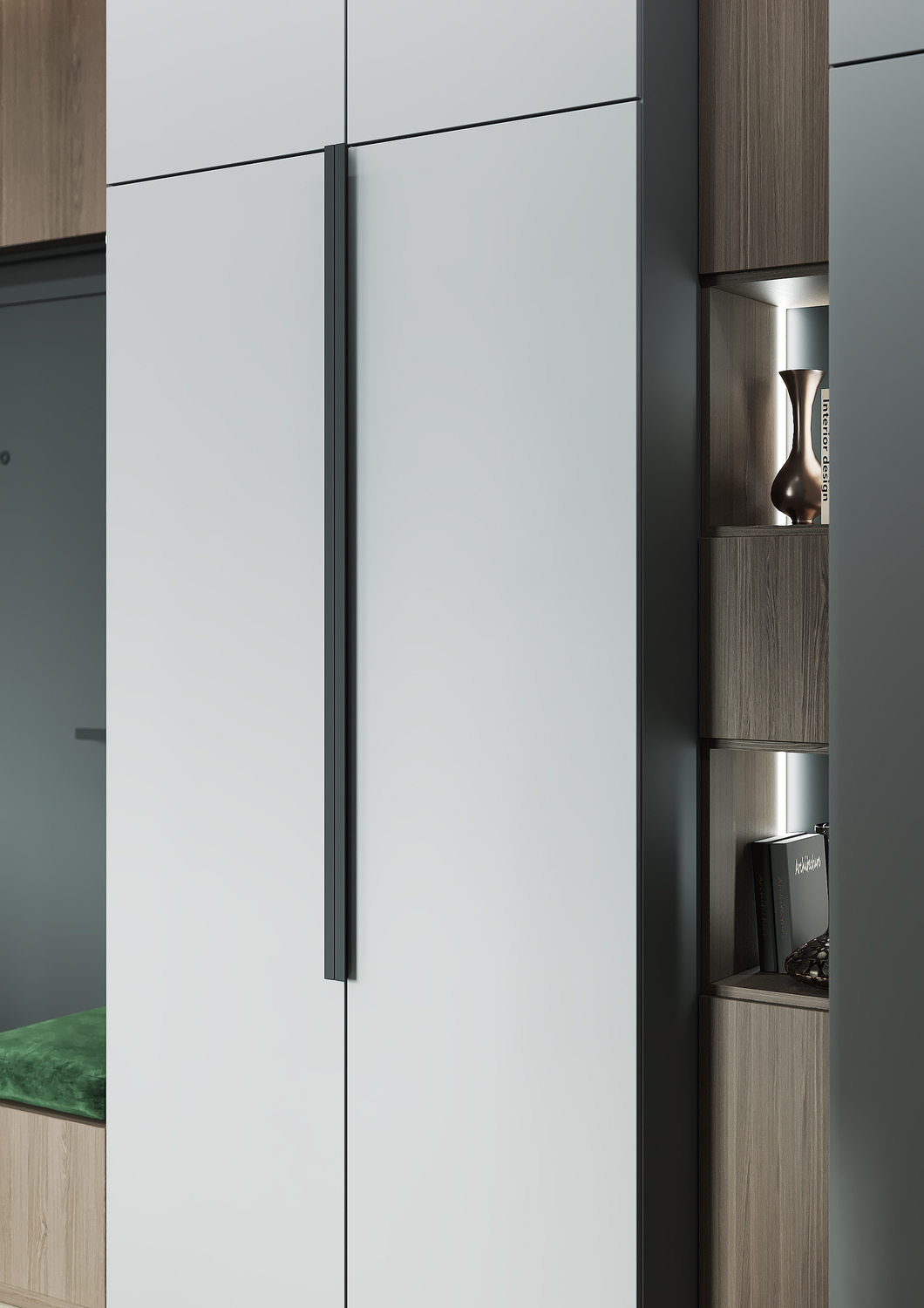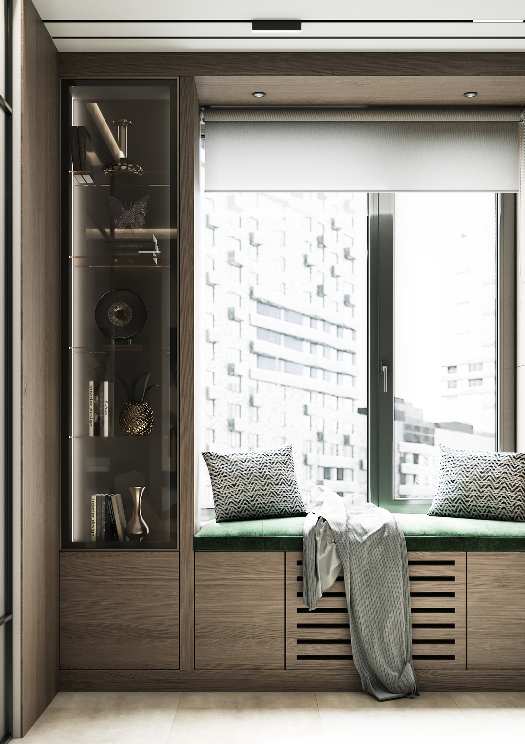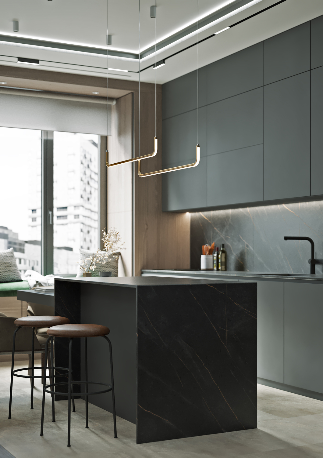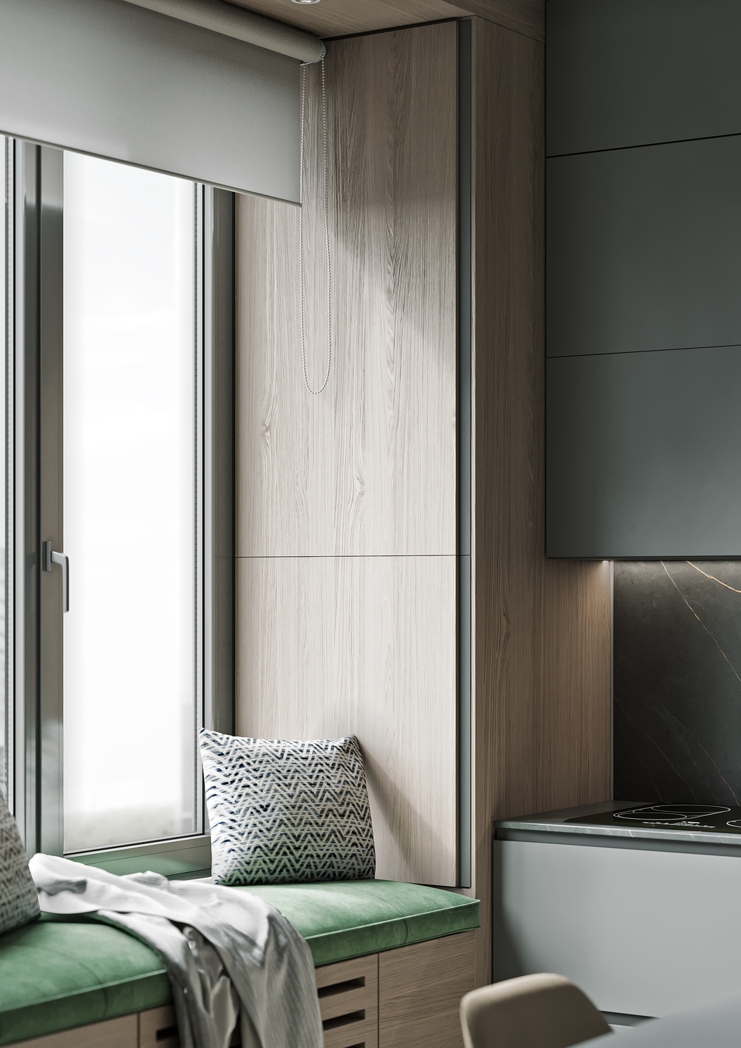 Удлиненный подоконник с мягкой оливковой обивкой и небольшими подушками — прекрасное место для встречи красивейших закатов и восходов. Или как минимум комфортного ожидания вкусного кулинарного шедевра в исполнении одного из домочадцев.
