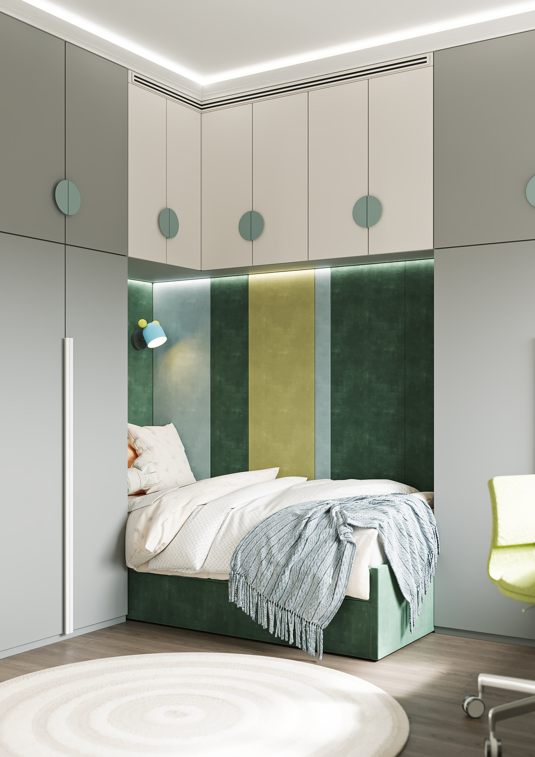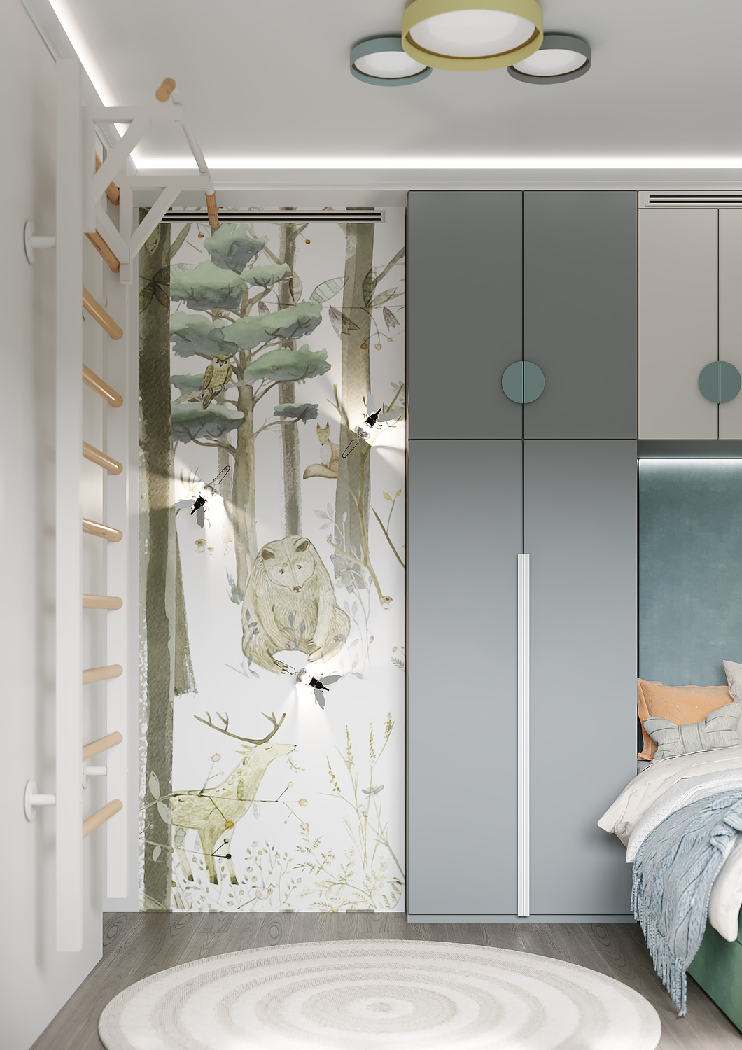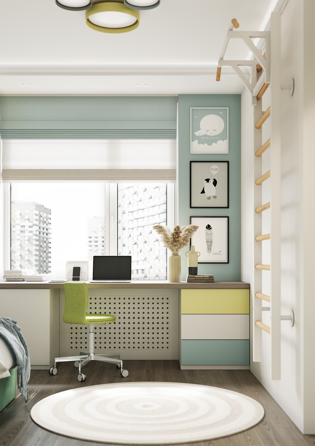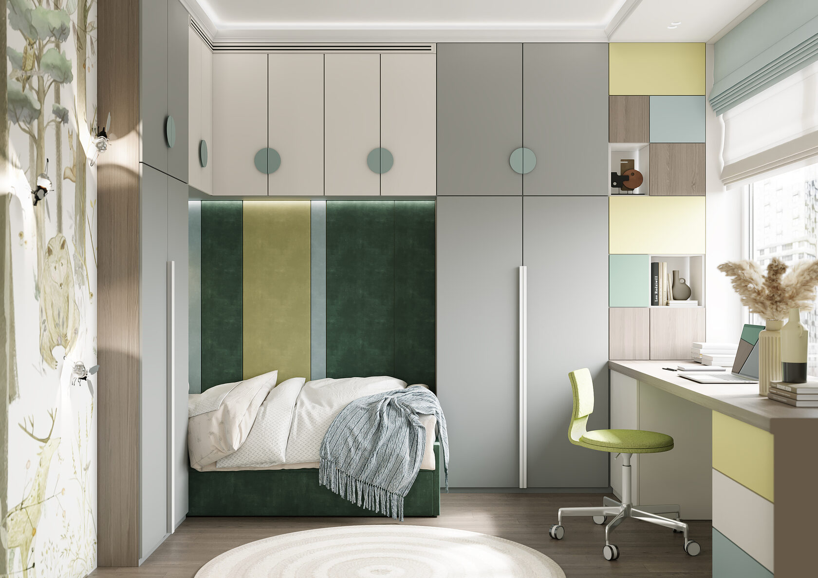 Дизайн детской комнаты — это милое отражение лесной сказки, которая так близка ребёнку, любящему заниматься поделками и рукоделием. Притягательные велюровые панели, на стенах — затейливые, игривые светильники в виде насекомых на фоне оригинального сюжета с лесными зверями. Общее цветущее настроение подчеркивает обилие различных оттенков зеленого. Комната создаёт уютную, творческую атмосферу, а реализовать все креативные идеи ребёнок сможет за рабочей зоной с большим удобным столом, за которым открывается потрясающий вид на город.