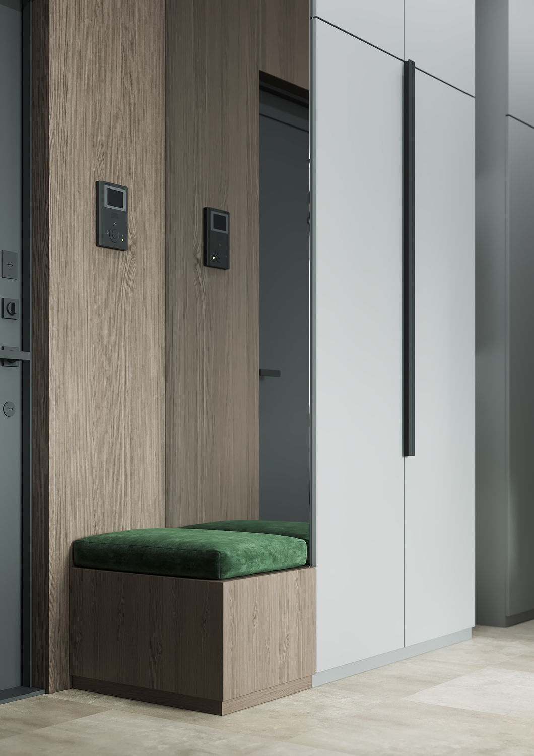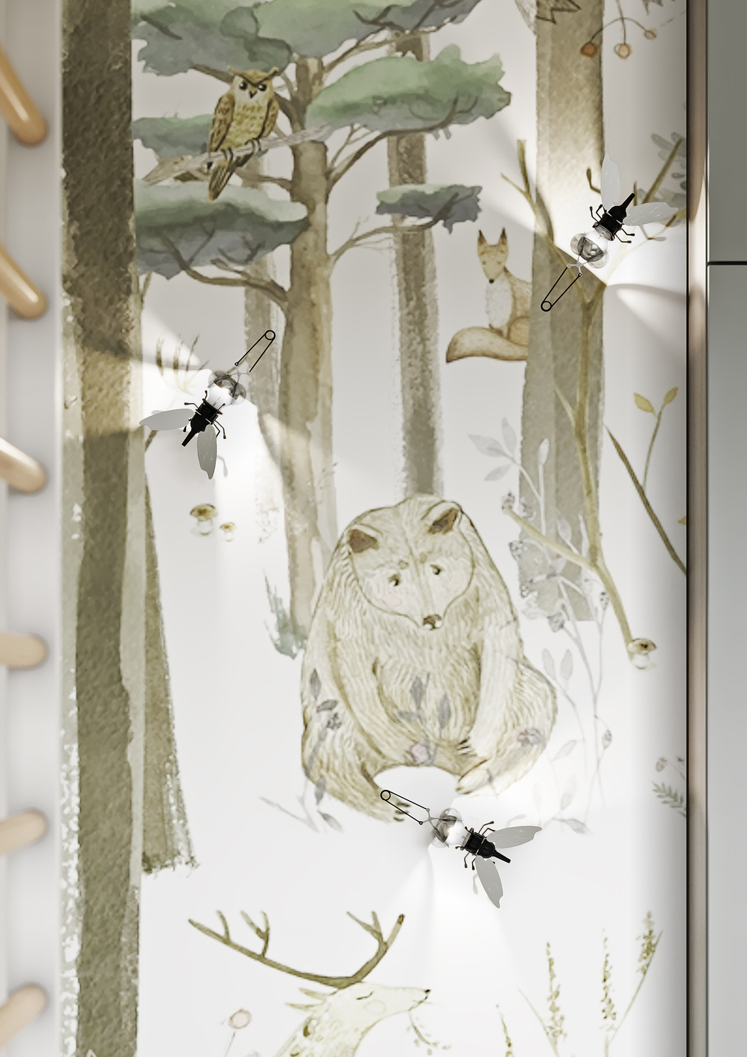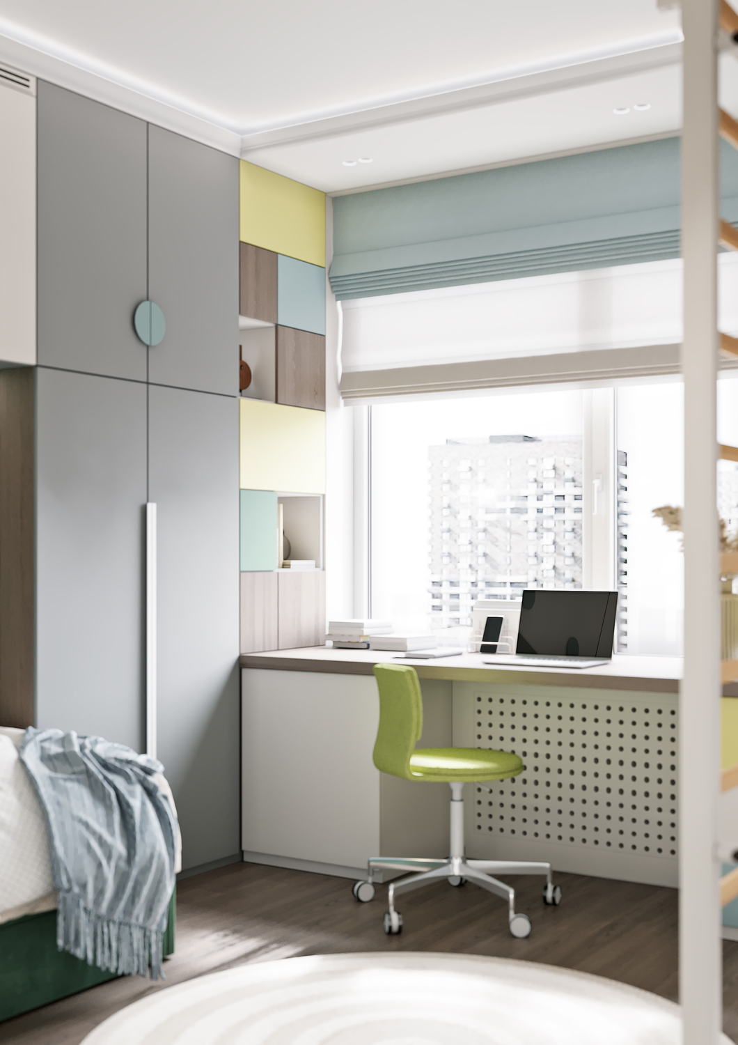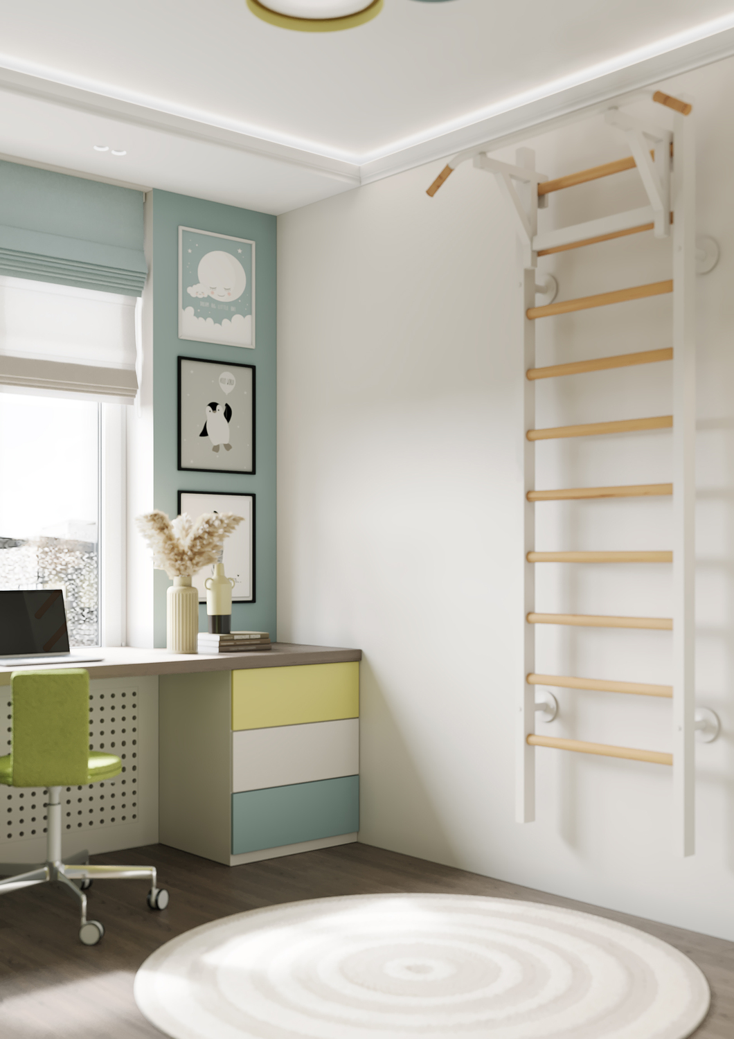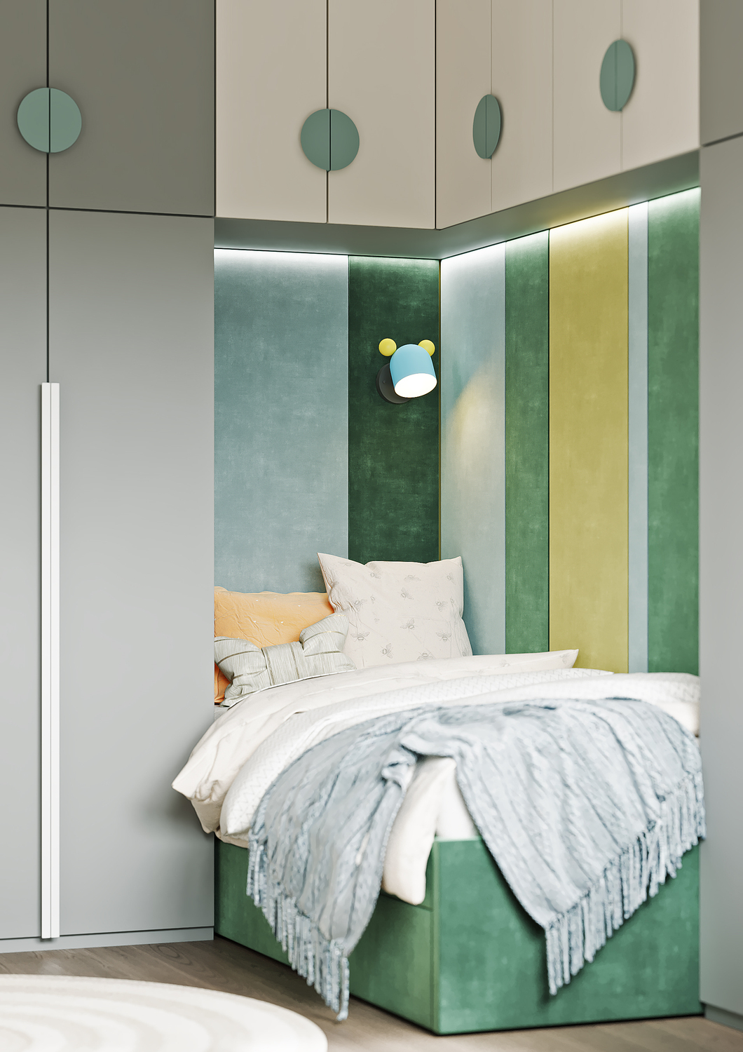 Дизайн детской комнаты — это милое отражение лесной сказки, которая так близка ребёнку, любящему заниматься поделками и рукоделием. Притягательные велюровые панели, на стенах — затейливые, игривые светильники в виде насекомых на фоне оригинального сюжета с лесными зверями. Общее цветущее настроение подчеркивает обилие различных оттенков зеленого. Комната создаёт уютную, творческую атмосферу, а реализовать все креативные идеи ребёнок сможет за рабочей зоной с большим удобным столом, за которым открывается потрясающий вид на город.