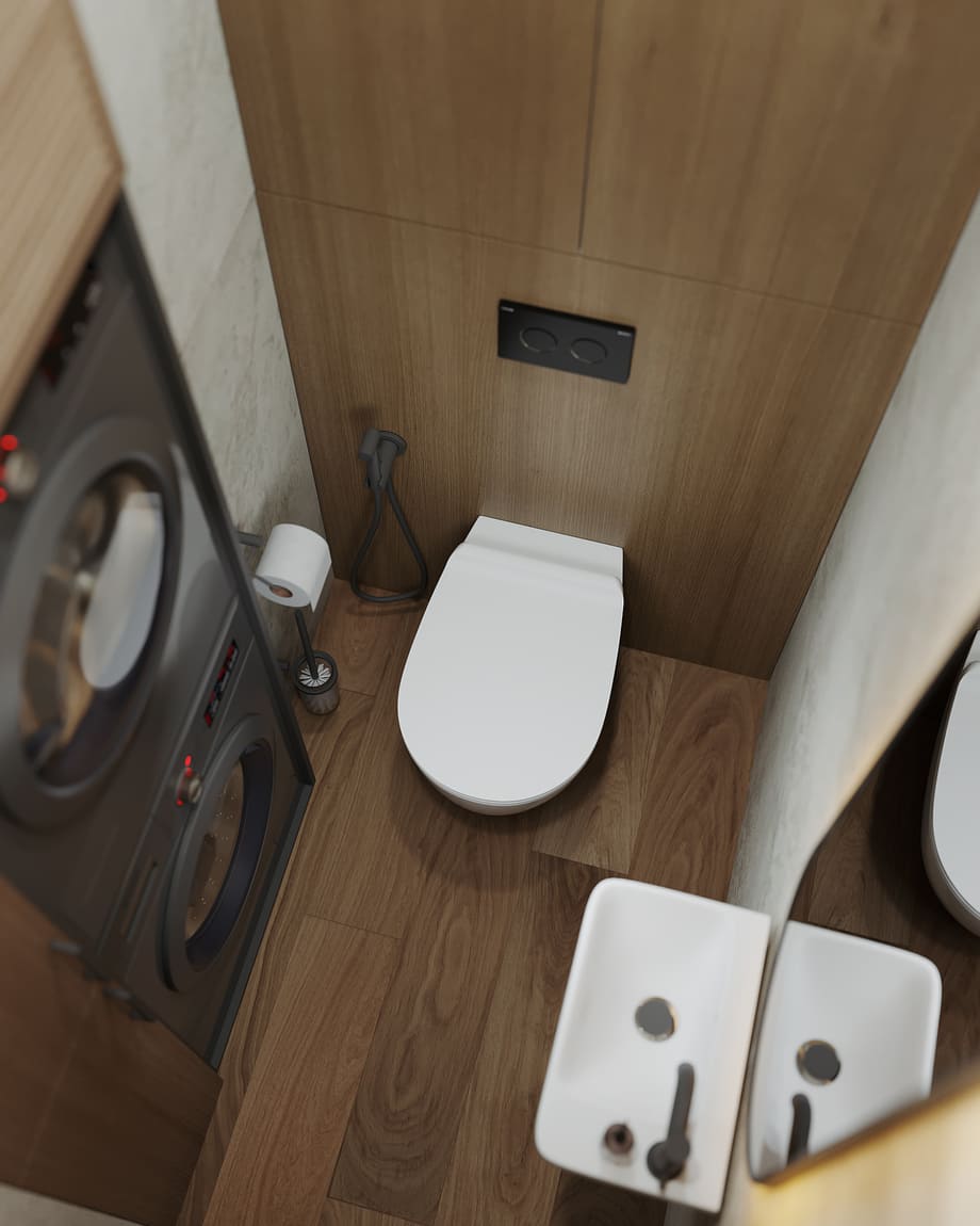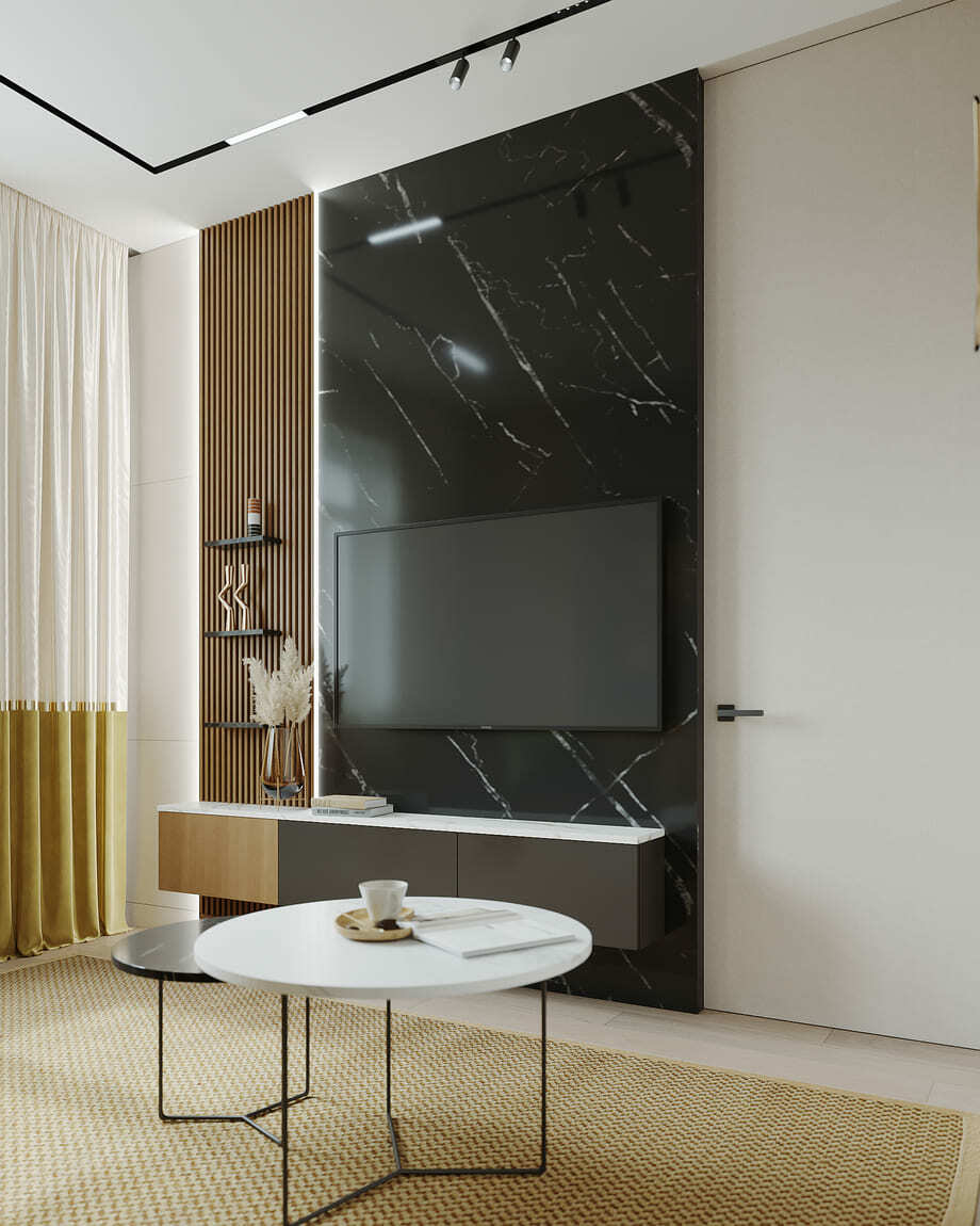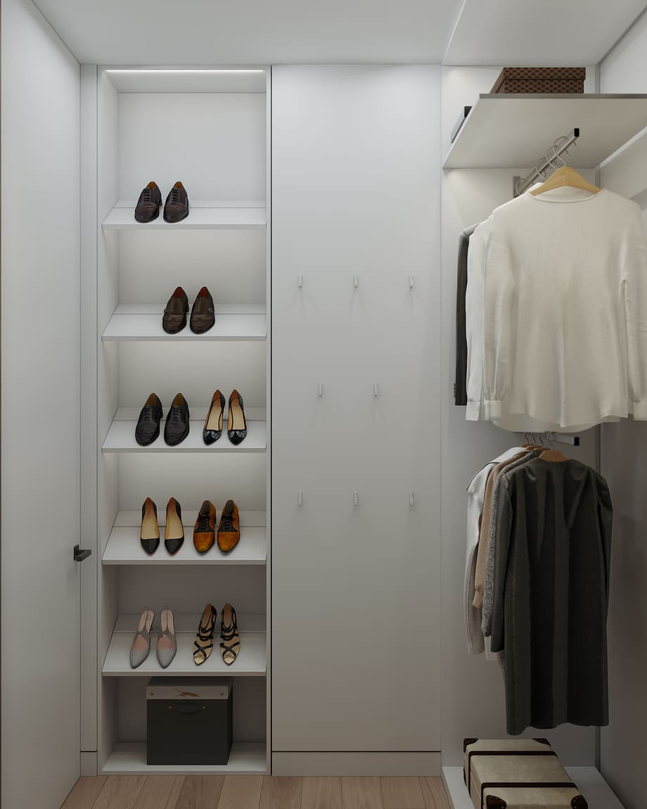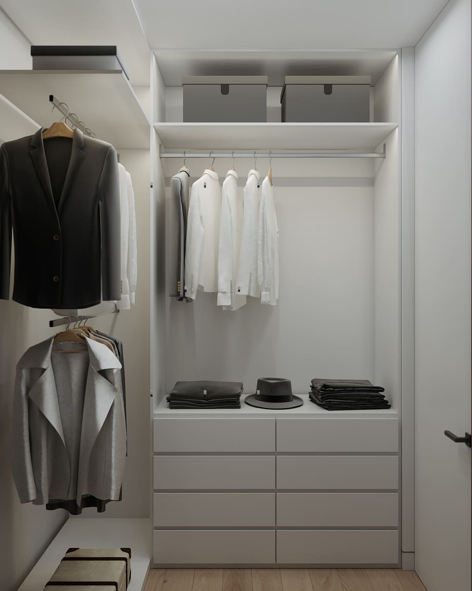Грамотные дизайнерские и планировочные решения позволили на всего 46 квадратах обустроить полноценную гостиную, кухню, спальню, парочку санузлов и даже отдельную гардеробную. Здесь столько свободного пространства, что можно хоть вещи хранить, хоть играть в прятки. Шутка.