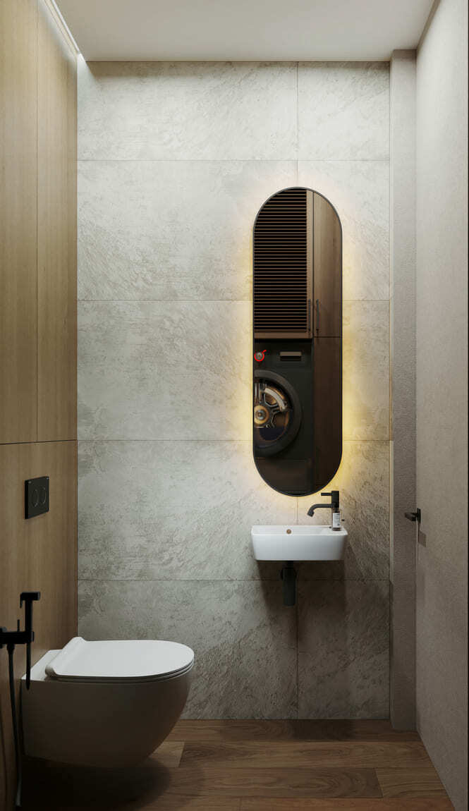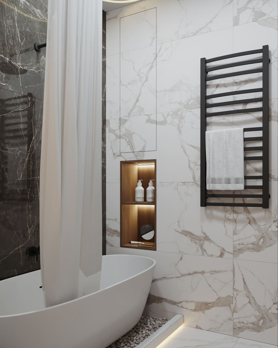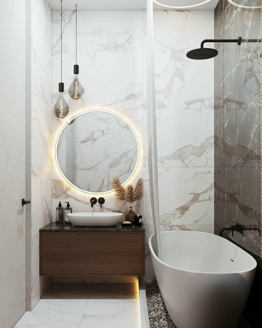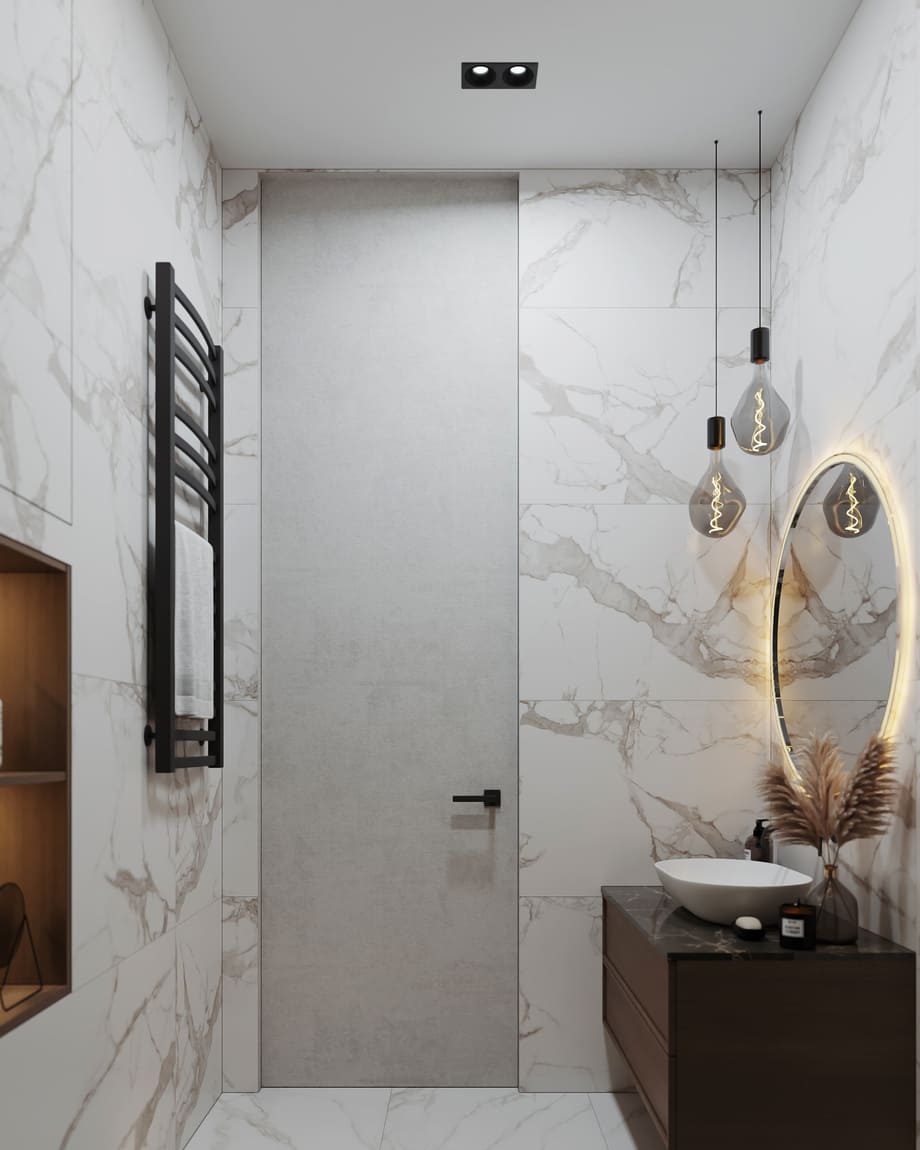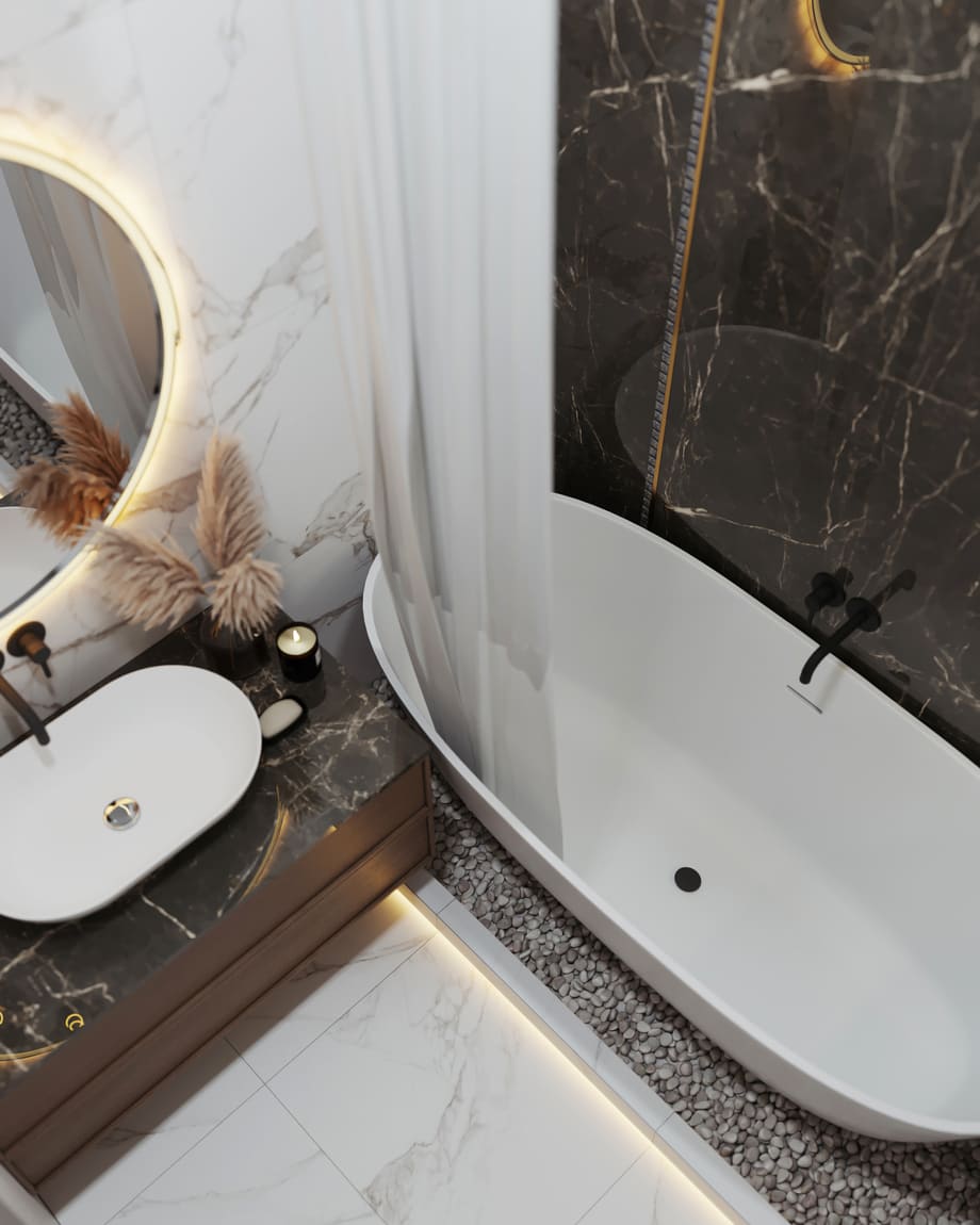 Ванная комната имеет потрясающую, в хорошем смысле «инстаграмную» ванную чашу, «пришвартовавшуюся» на мелких камешках. В купе с подсветкой и мраморной отделкой стен даёт ощущение стопроцентного «вкусного» стиля. Хоть заводи отдельный аккаунт этой ванной комнате и фоткай, фоткай, фоткай.