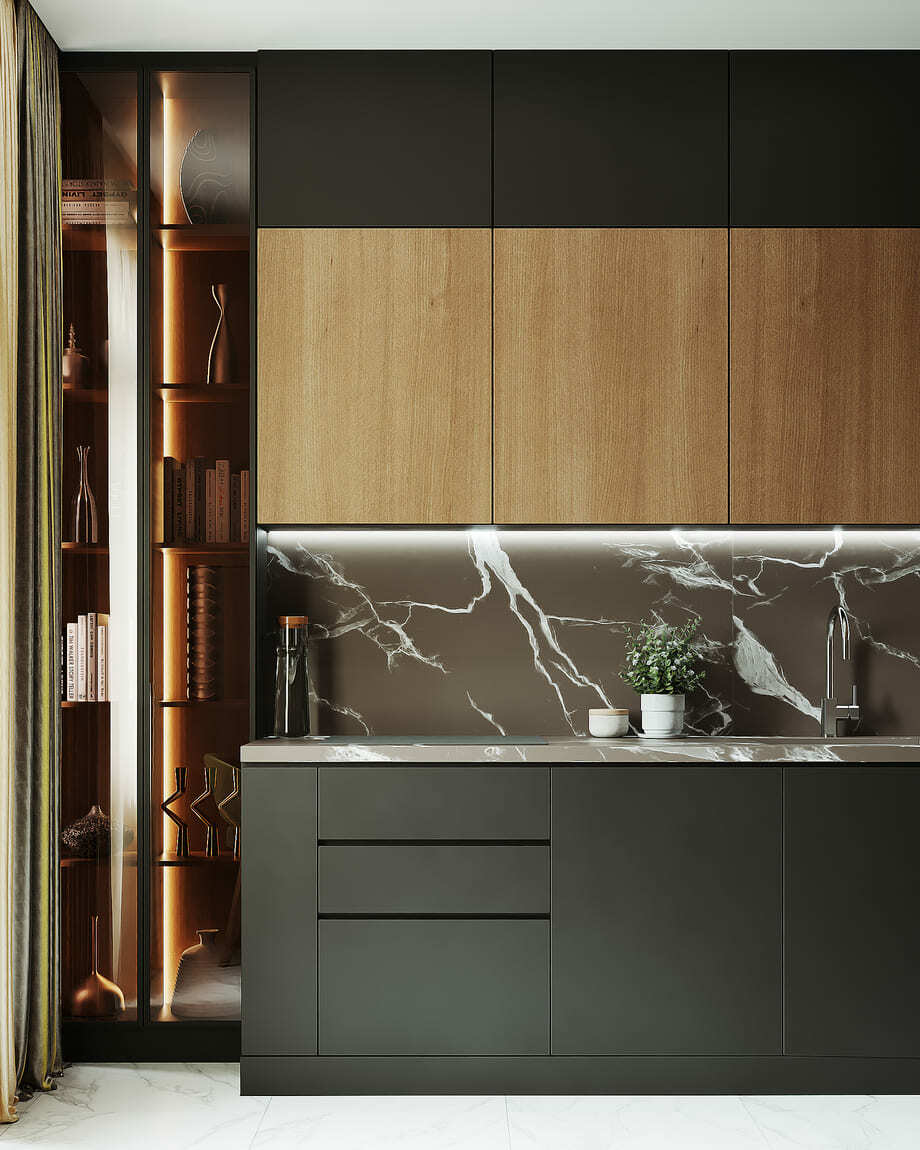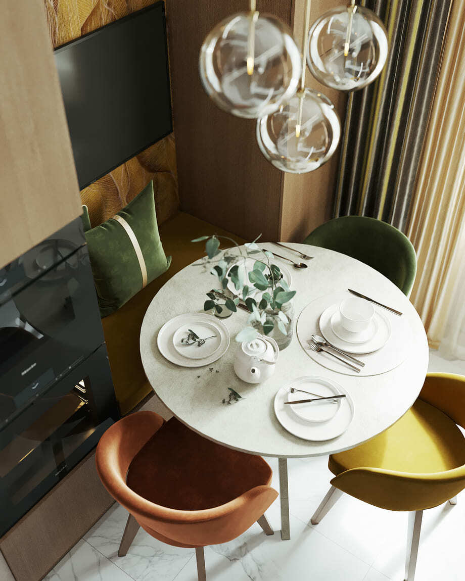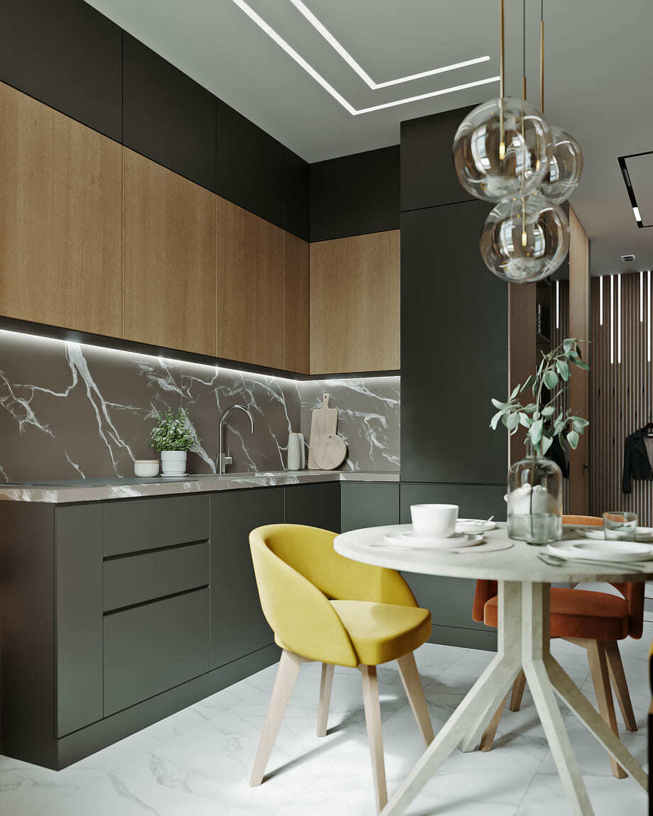 Кухня имеет уютную обеденную зону со столиком и винными, лимонно-бежевыми стульями, которые шикарно смотрятся на фоне минималистичной отделки основной фурнитуры.