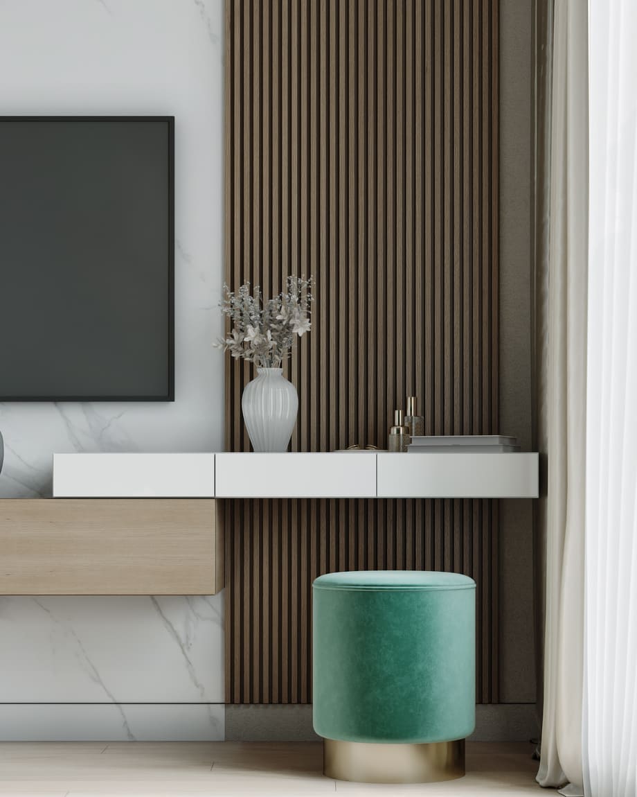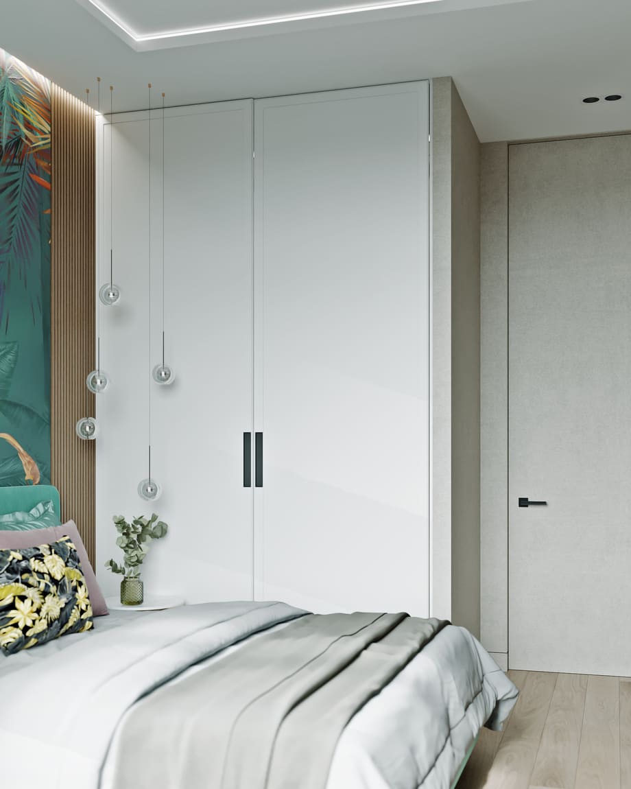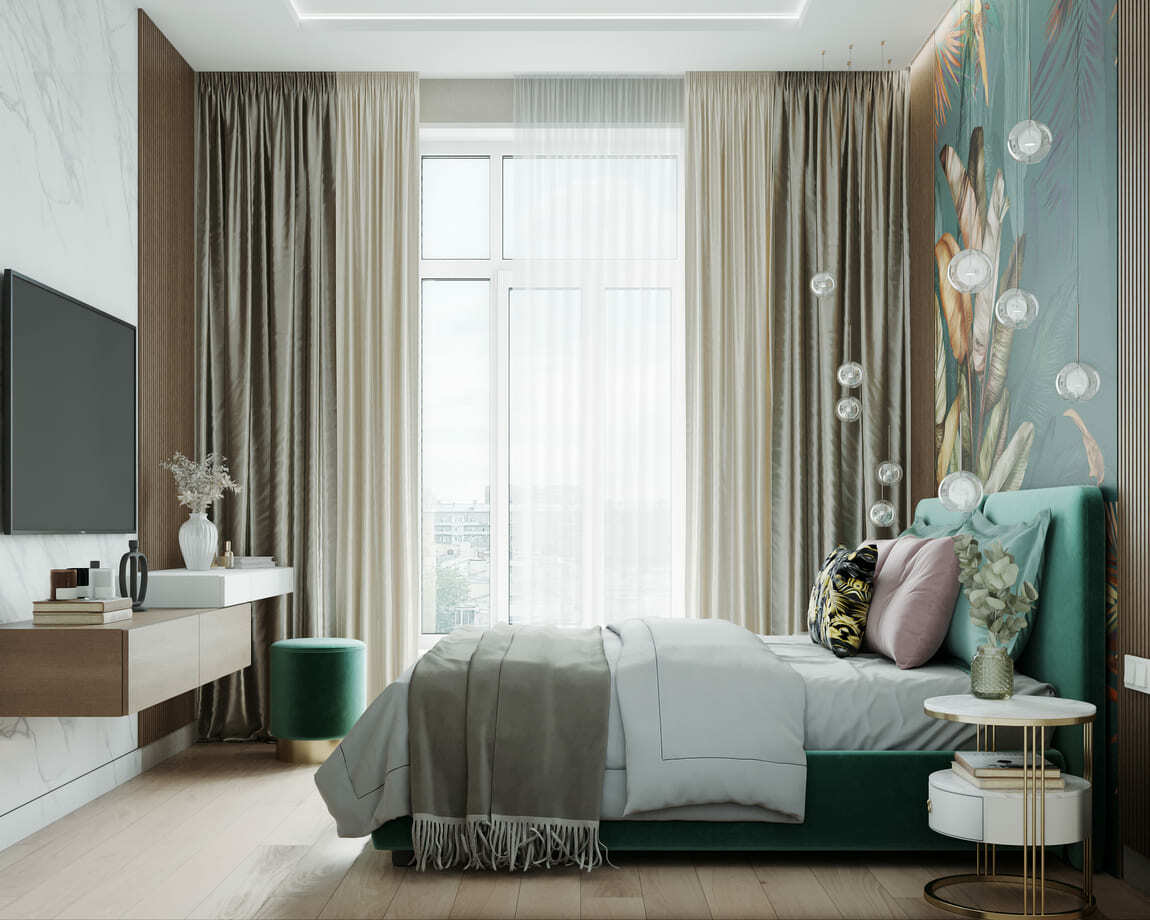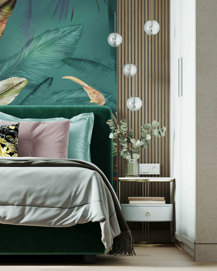 Наконец, спальня — наша самая главная находка. Доминирующие зеленые, изумрудные, бирюзовые тона привносят ощущение, что ты находишься в вечноцветущем саде. А панно на стене с оригинальным сюжетом из пышных банановых пальм только удваивает данный эффект.