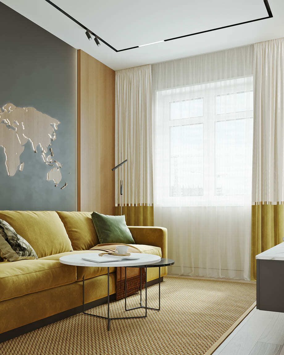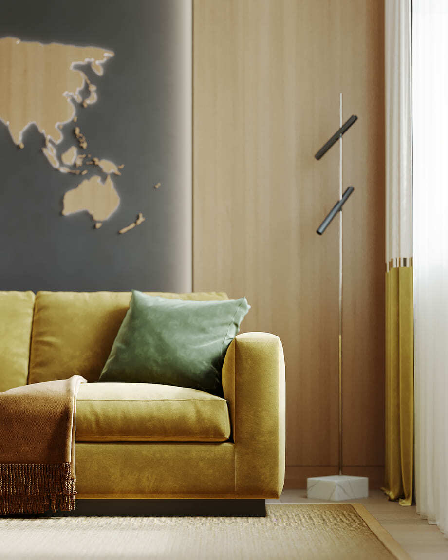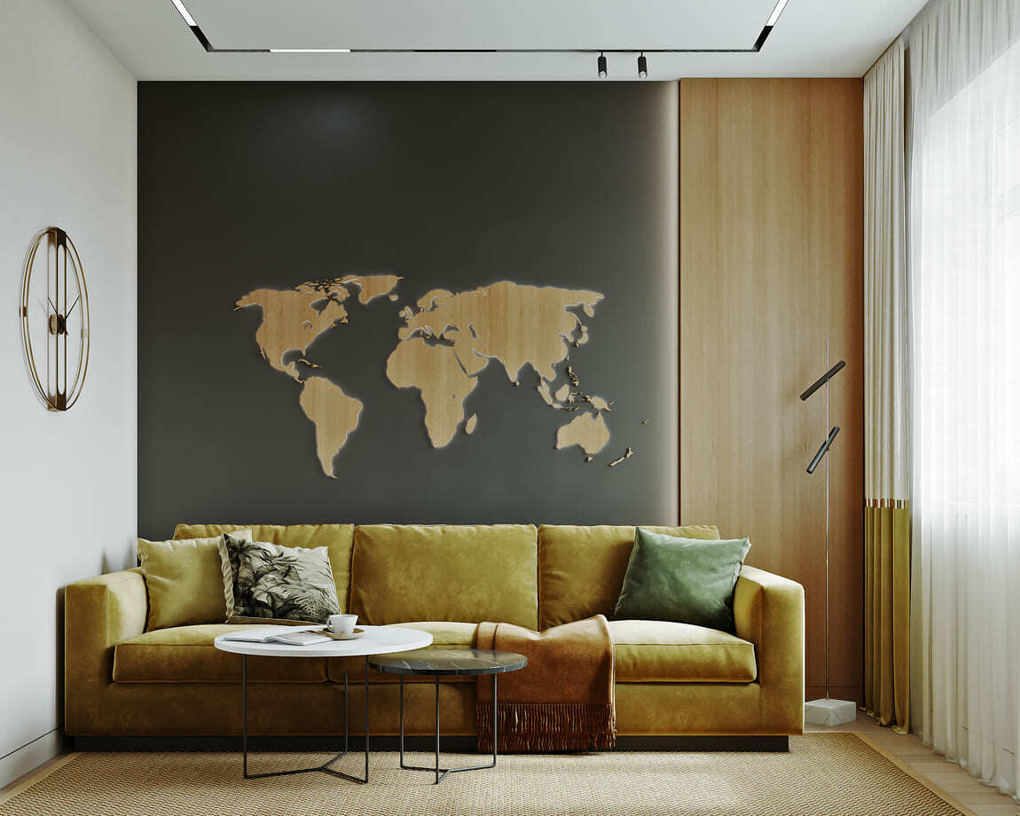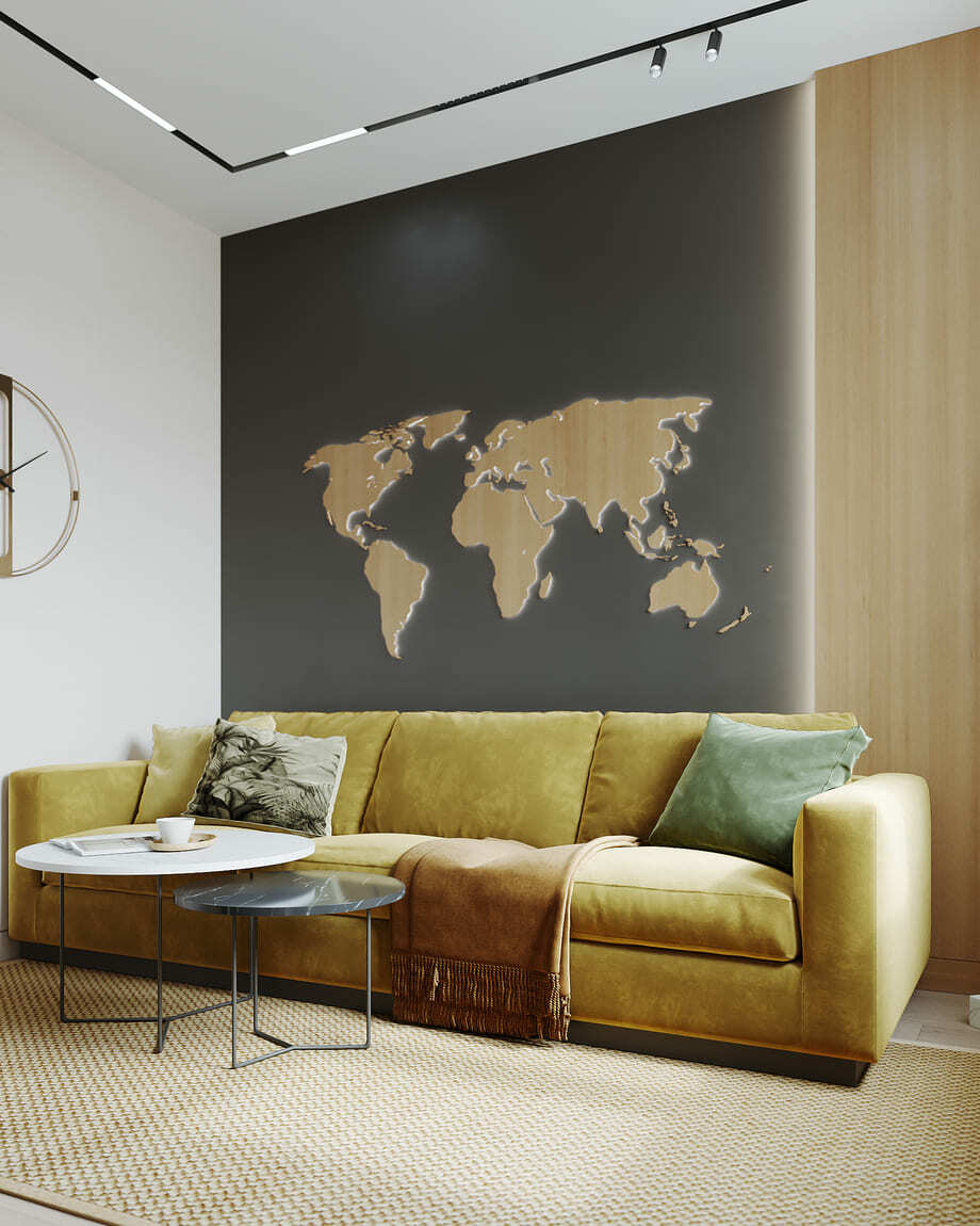 Центральным акцентом в гостиной является бежевые диван с отлично вписывающейся картой мира на стене позади. Отличное место, чтобы пофантазировать на тему будущего спонтанного (и не очень) путешествия.