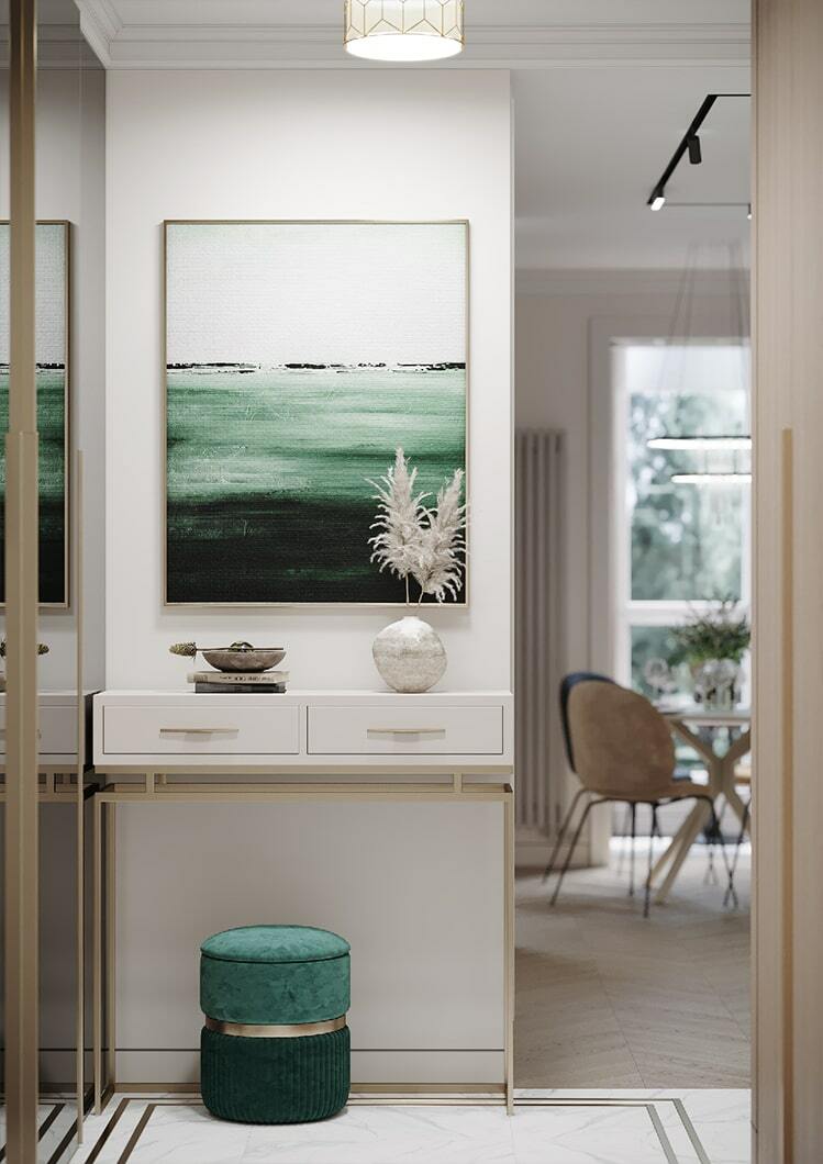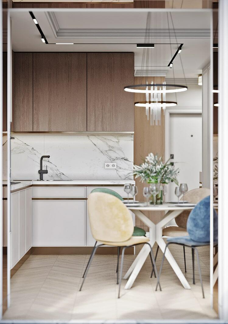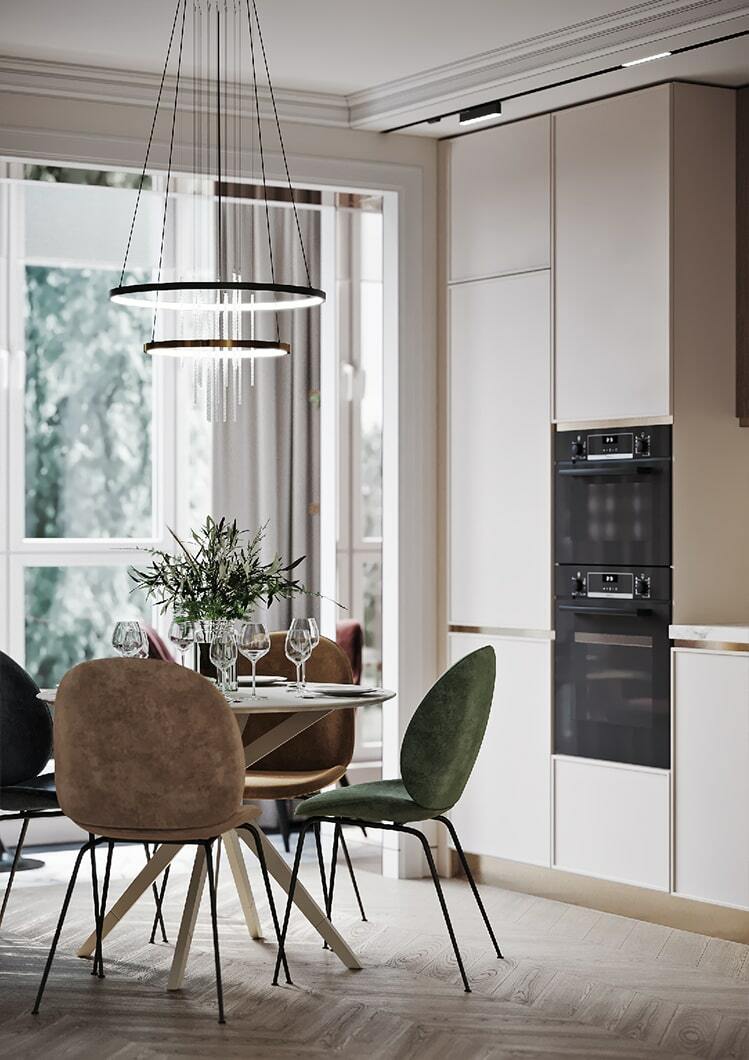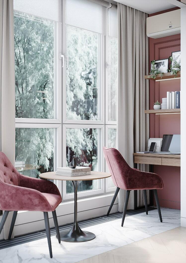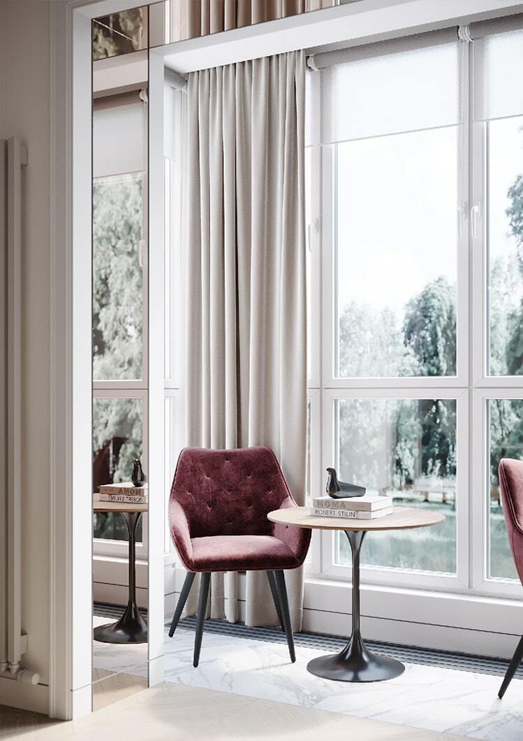 По-новому пространство «дышит» и благодаря грамотному расположению зеркал, которые создают дополнительную перспективу. Отражая свет и цветущую картинку за окном, зеркала, кроме того, формируют ощущение, что вы находитесь в тихом саду на рассвете. Нельзя не упомянуть элегантное рабочее место, которое мы организовали на светлой лоджии с панорамными окнами. Лоджия совмещена с кухонной зоной и предполагает возможность, как многочасового вдумчивого рабочего процесса, так и комфортного чтения книги на фоне зеленого парка за окном.