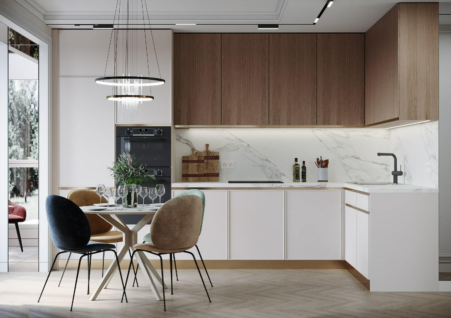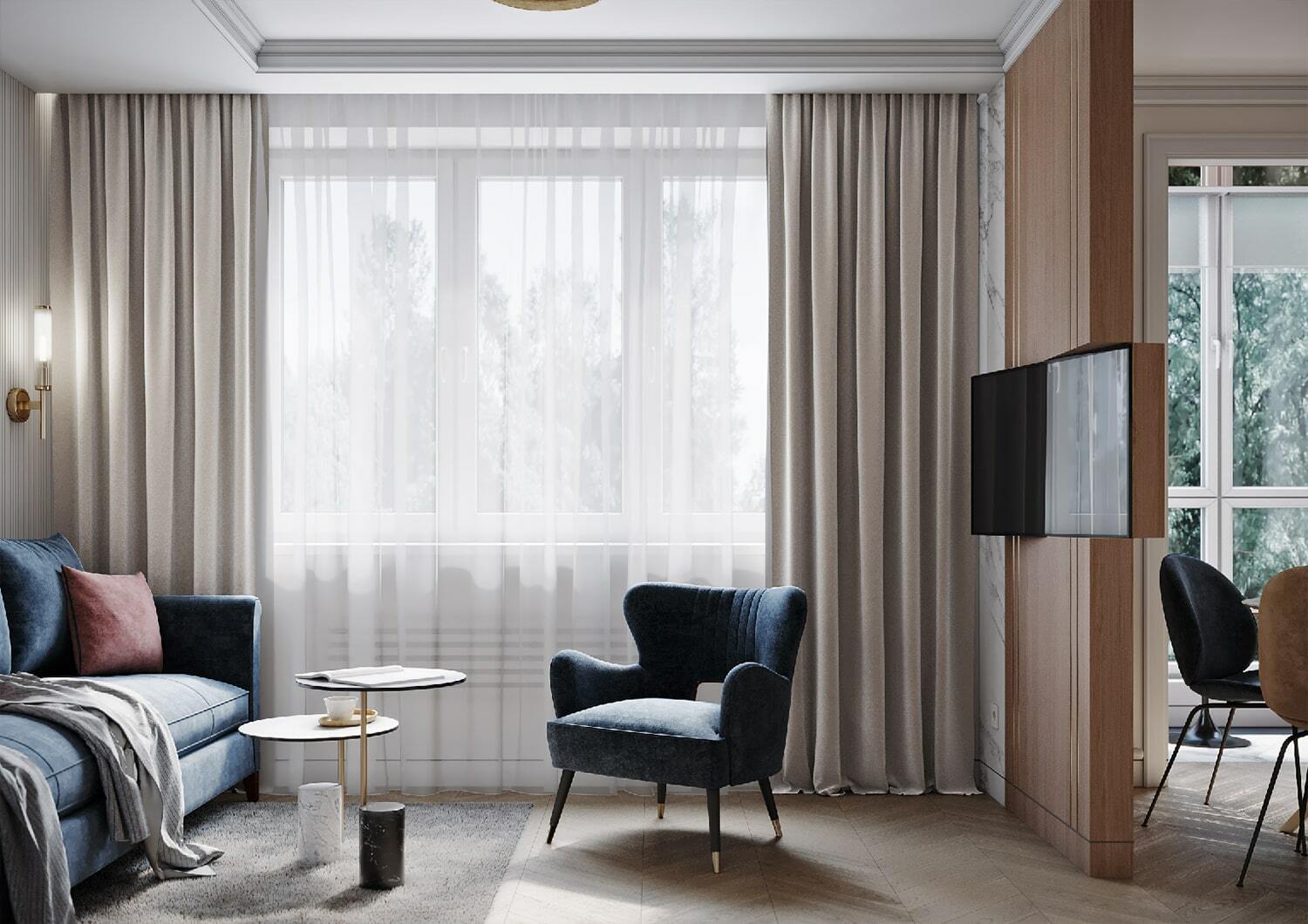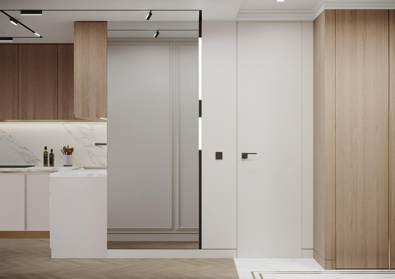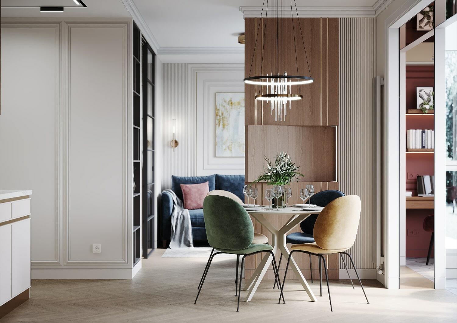 По-новому пространство «дышит» и благодаря грамотному расположению зеркал, которые создают дополнительную перспективу. Отражая свет и цветущую картинку за окном, зеркала, кроме того, формируют ощущение, что вы находитесь в тихом саду на рассвете. Нельзя не упомянуть элегантное рабочее место, которое мы организовали на светлой лоджии с панорамными окнами. Лоджия совмещена с кухонной зоной и предполагает возможность, как многочасового вдумчивого рабочего процесса, так и комфортного чтения книги на фоне зеленого парка за окном.