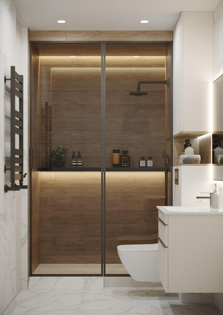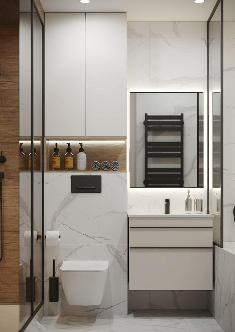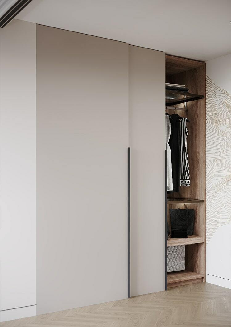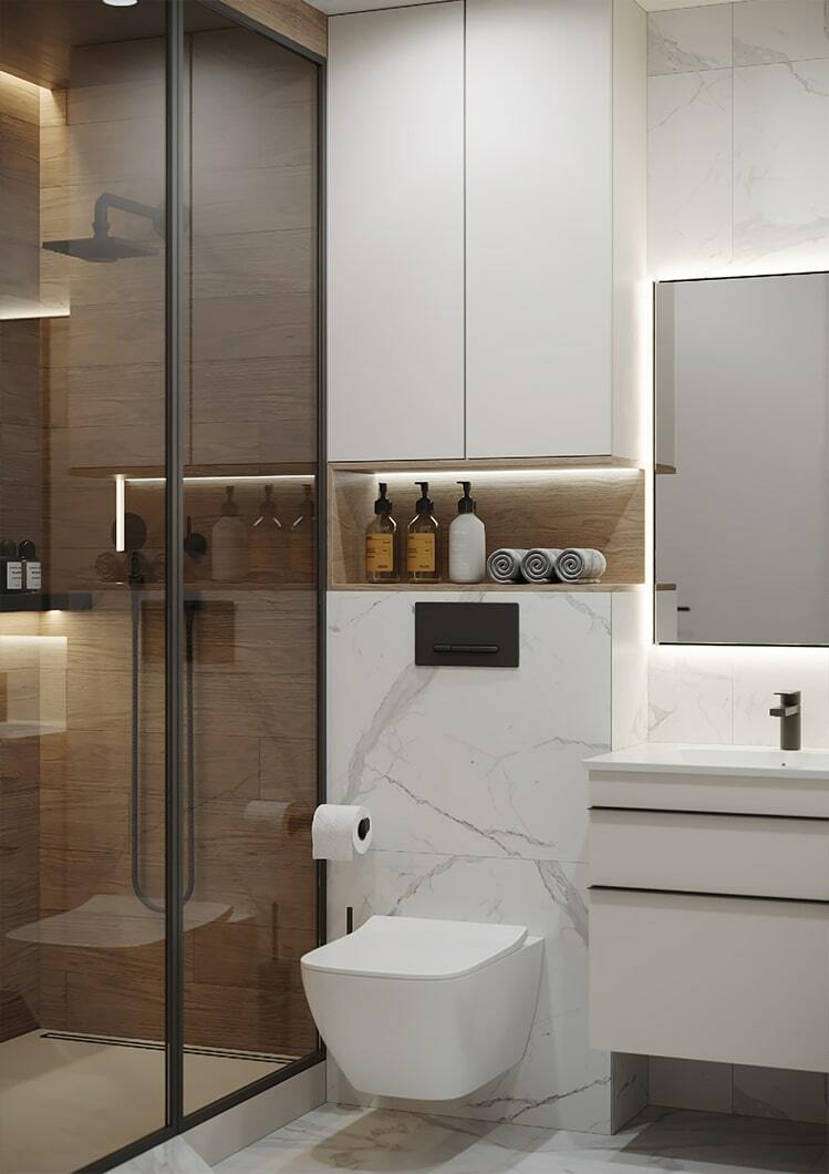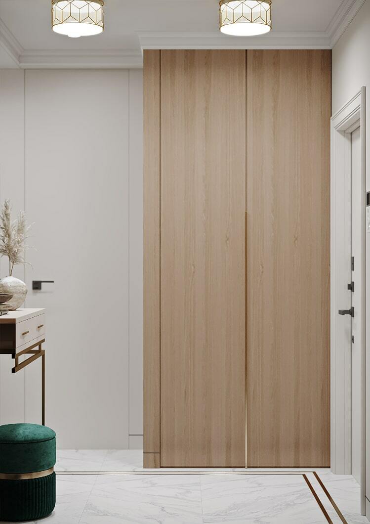 В целом, в квартире организовано много мест для хранения, есть декоративные полочки с подсветкой, два гардеробных шкафа в потолок. Так что каждый из домочадцев сможет хранить свои близкие сердцу вещи именно там, где ему максимально удобно.