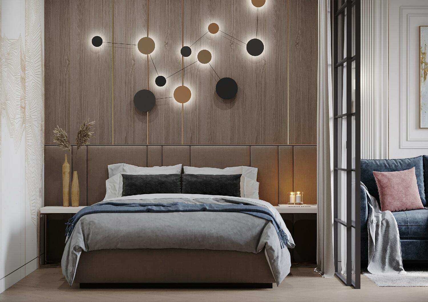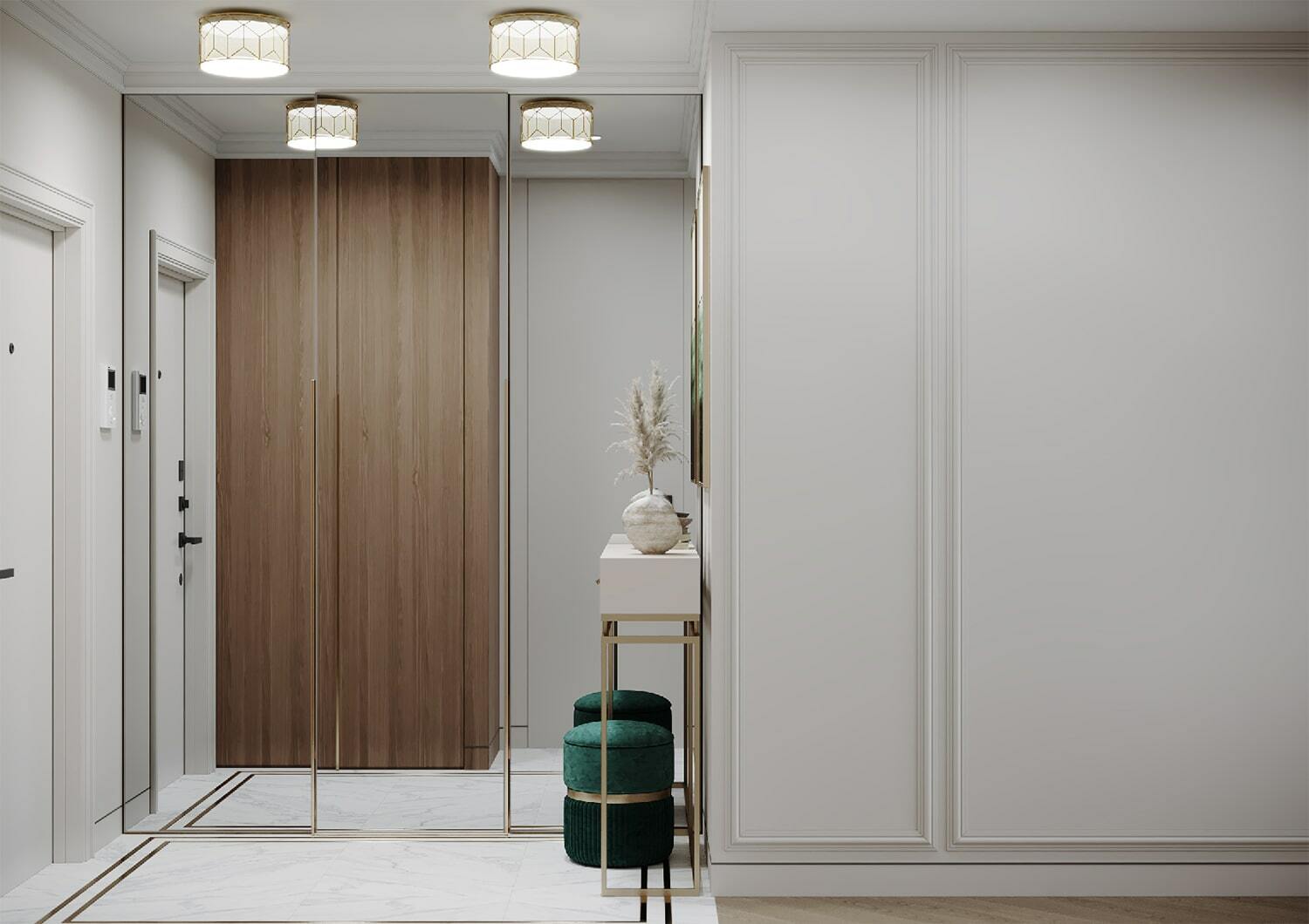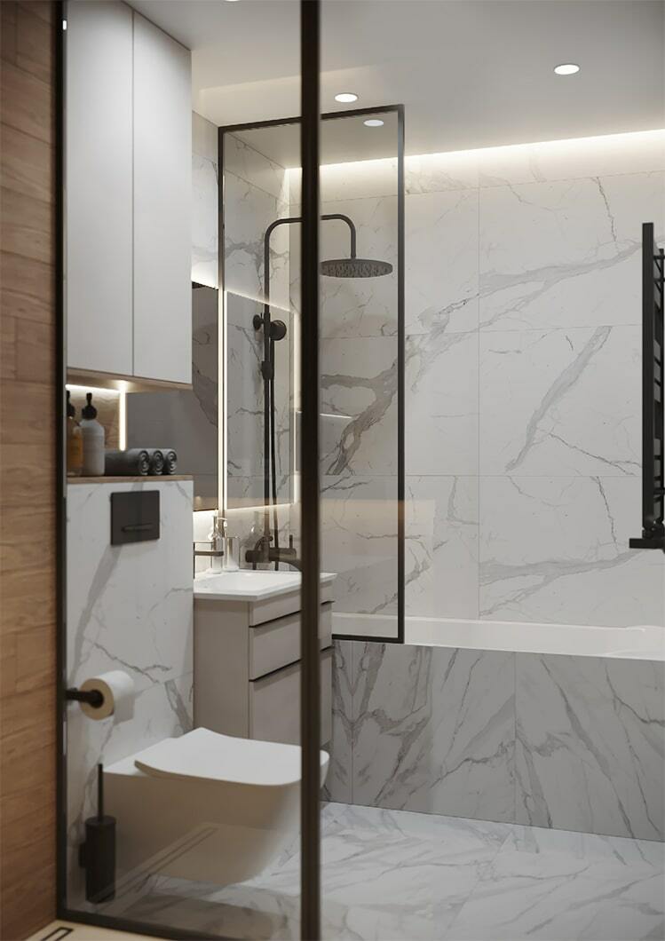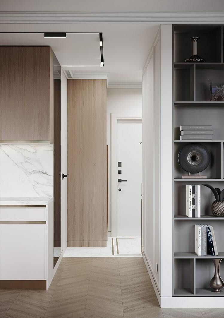 В целом, в квартире организовано много мест для хранения, есть декоративные полочки с подсветкой, два гардеробных шкафа в потолок. Так что каждый из домочадцев сможет хранить свои близкие сердцу вещи именно там, где ему максимально удобно.