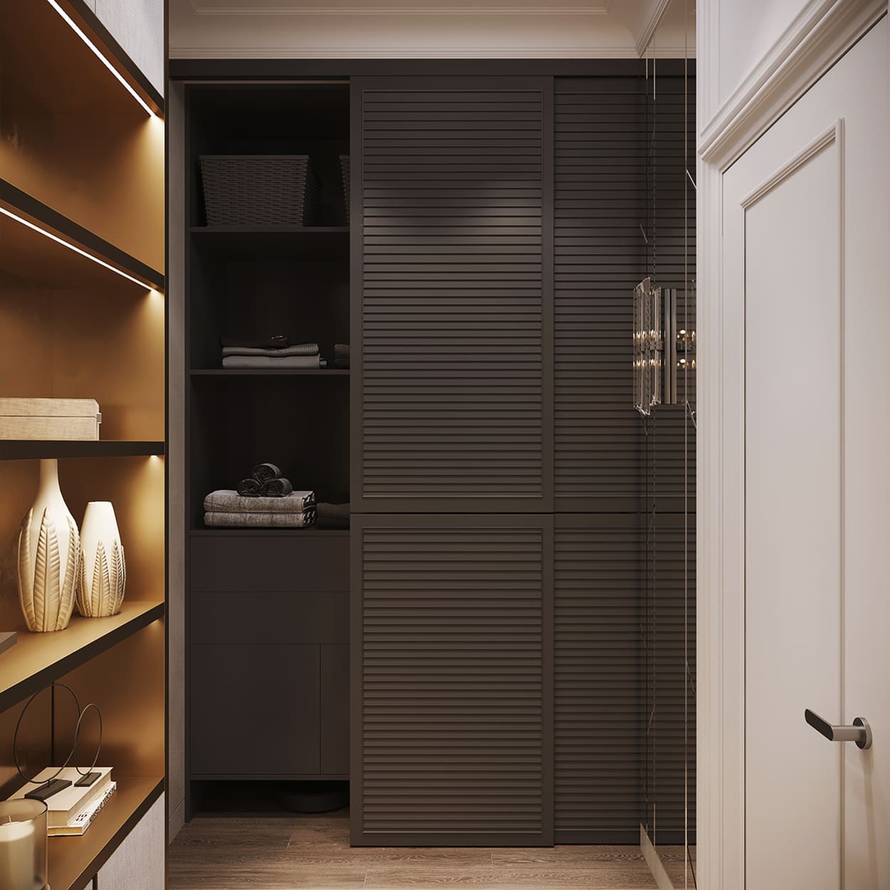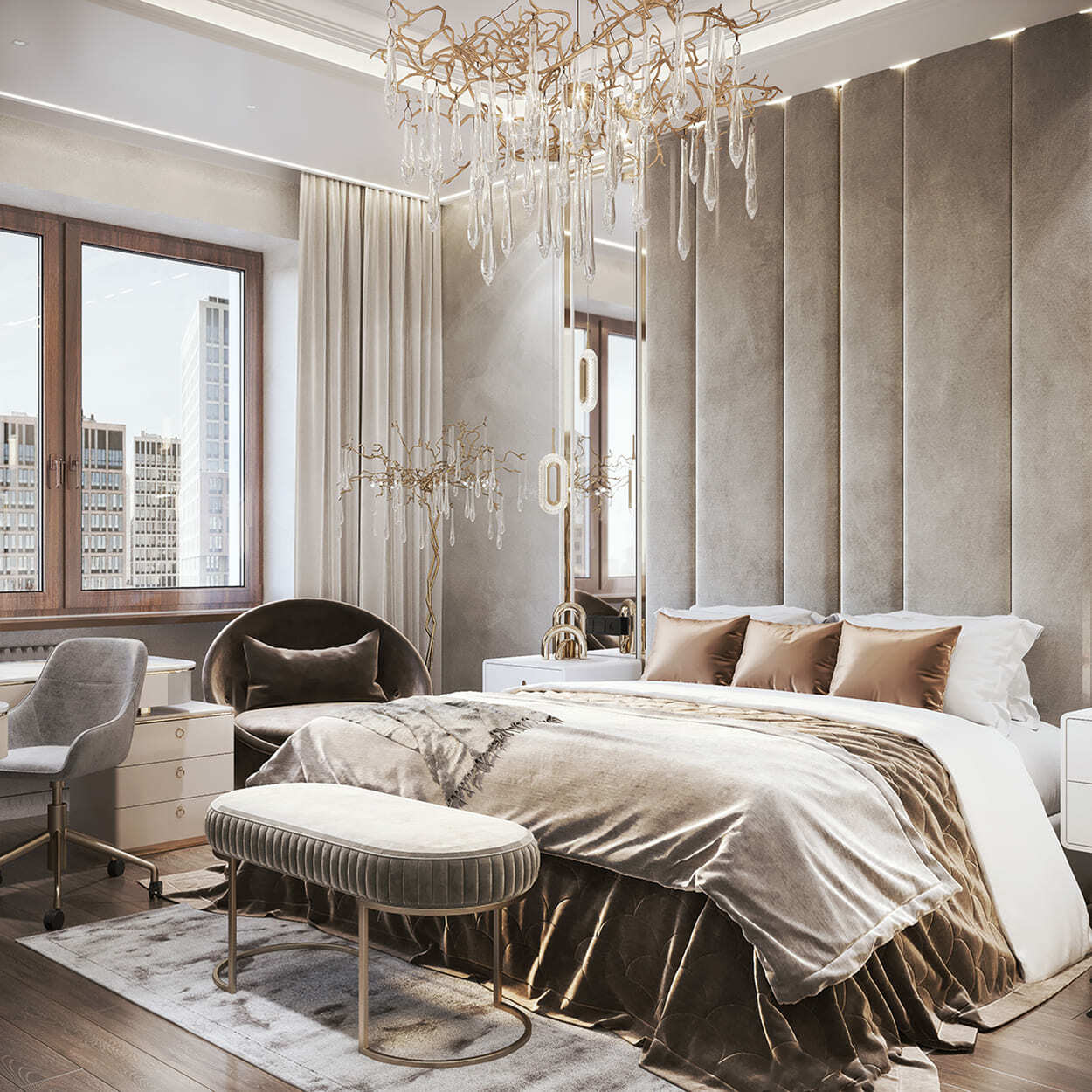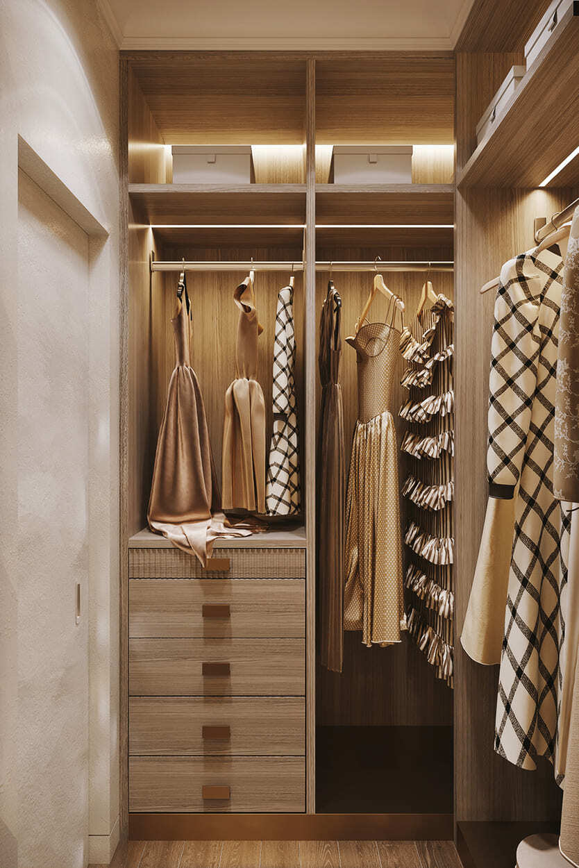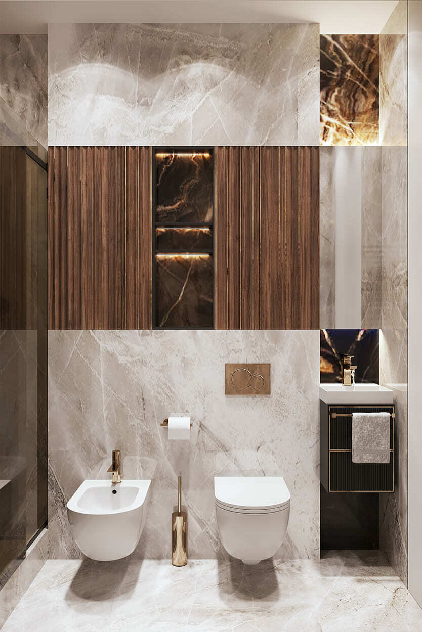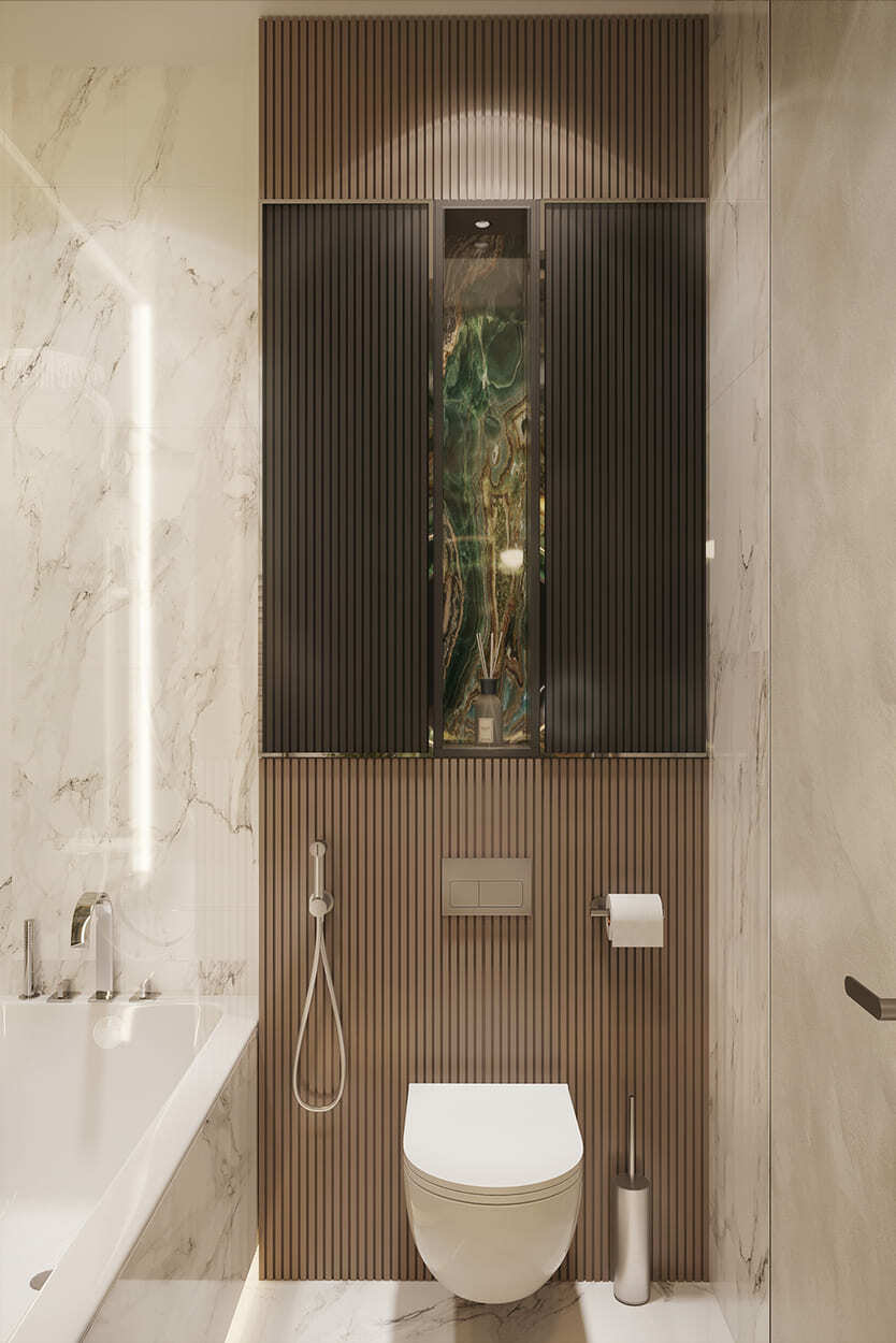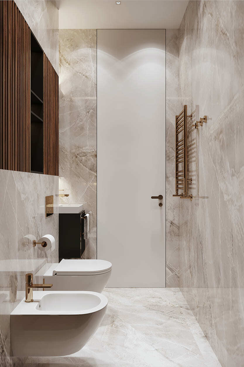 Изящество и мера — вот, что характеризует эту квартиру площадью в 82 квадратных метра. Каждая комната преисполнена декором, но не перегружена, как того и хотела наш клиент. Тут появились такие необходимые утилитарные помещения, как гардеробные (их тут две), прачечная, два санузла для большой ванной и большой душевой.