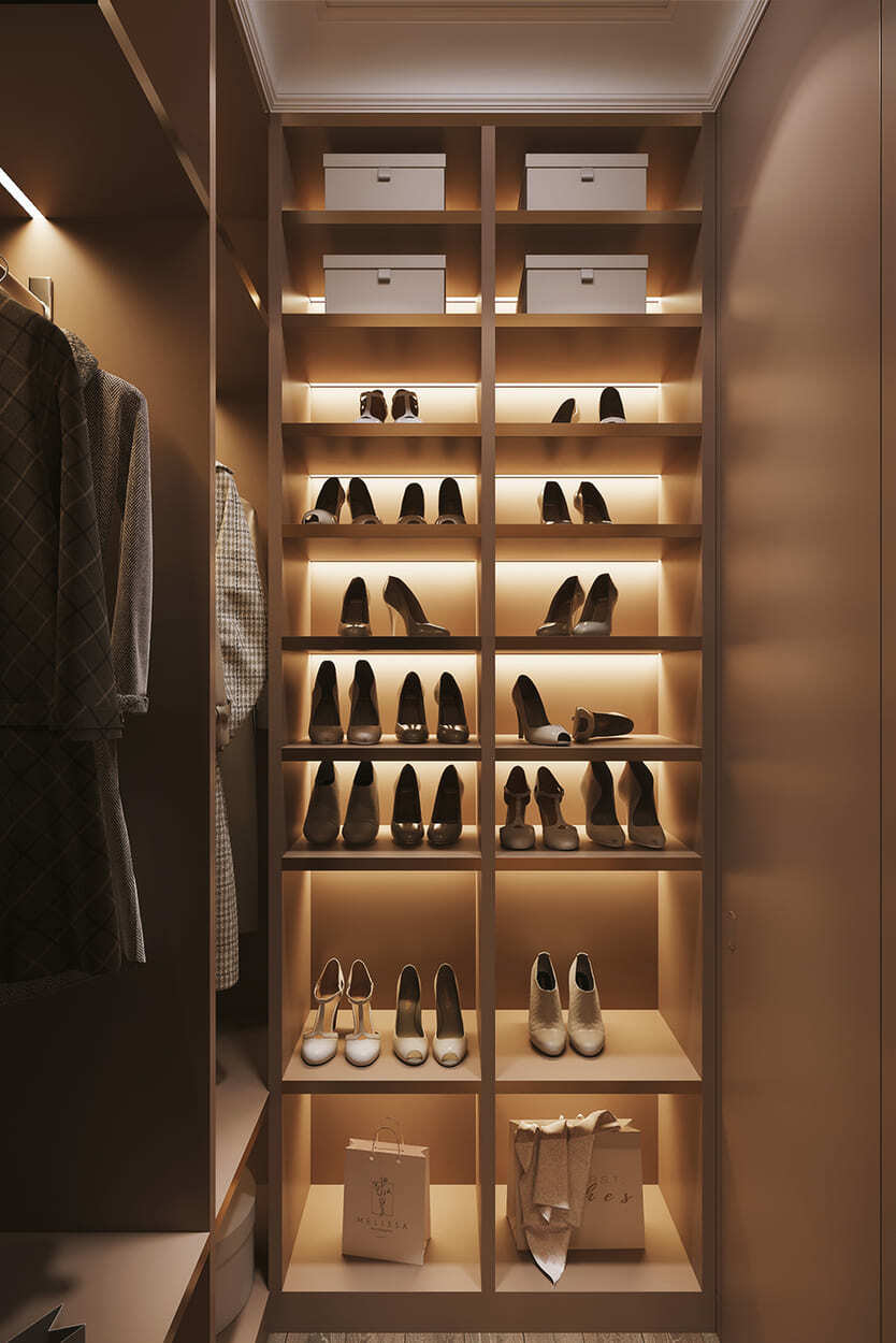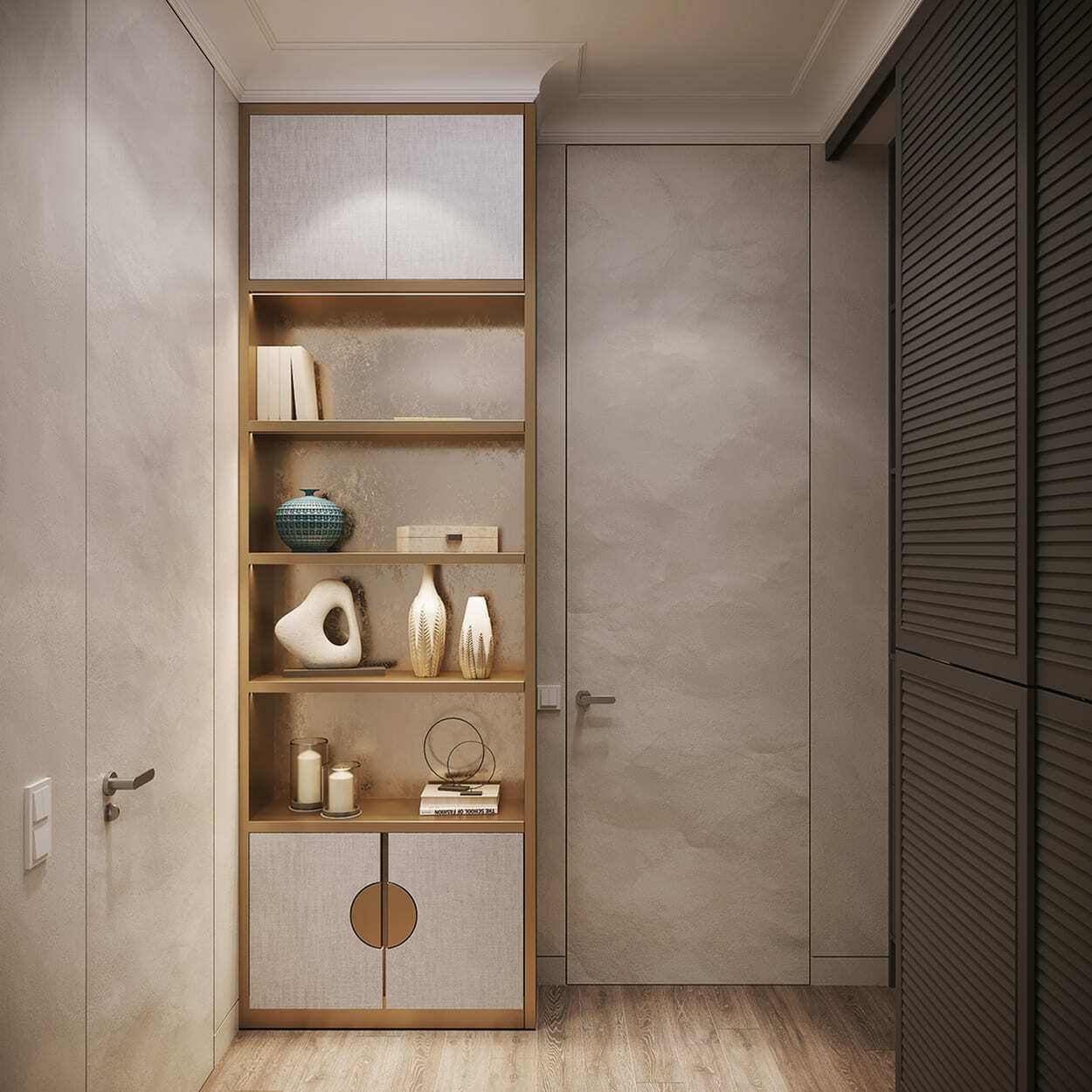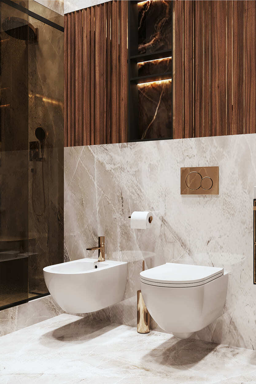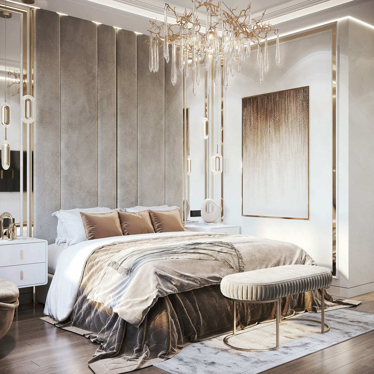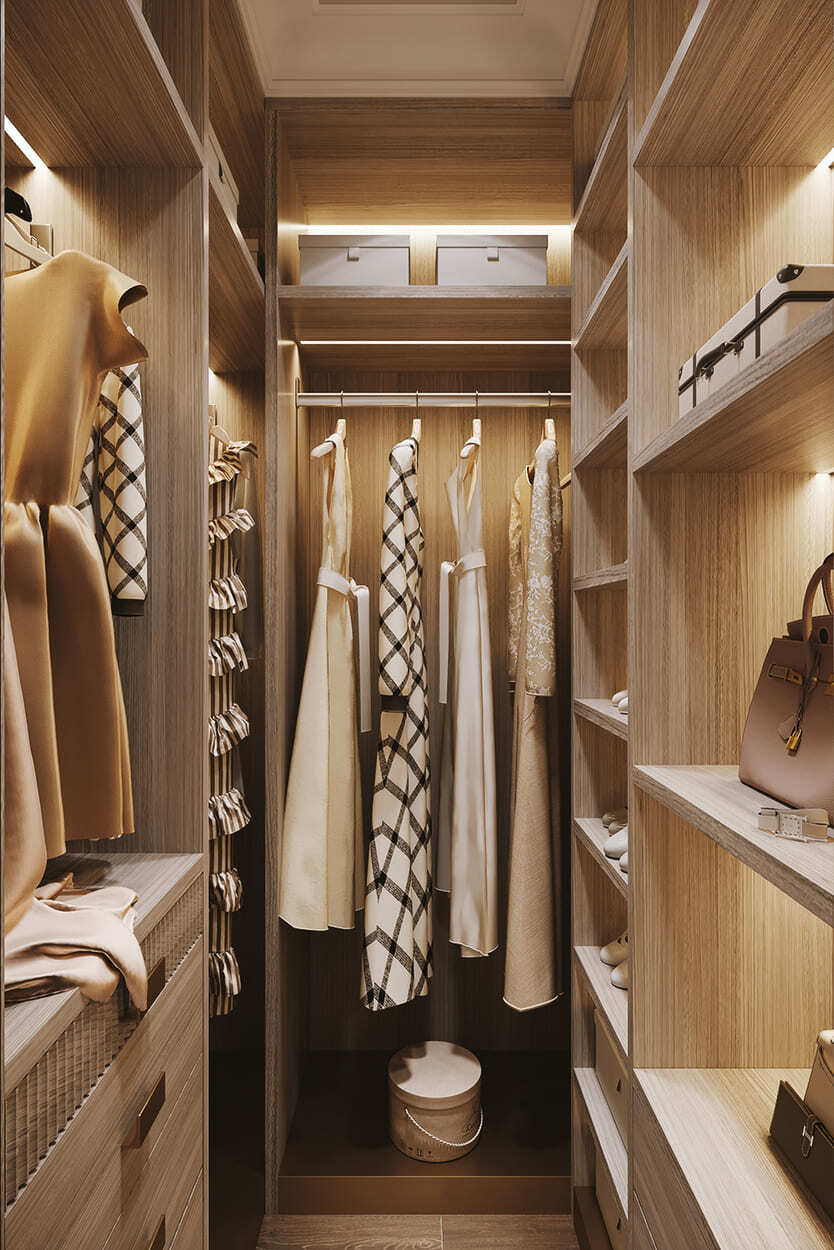 Изящество и мера — вот, что характеризует эту квартиру площадью в 82 квадратных метра. Каждая комната преисполнена декором, но не перегружена, как того и хотела наш клиент. Тут появились такие необходимые утилитарные помещения, как гардеробные (их тут две), прачечная, два санузла для большой ванной и большой душевой.