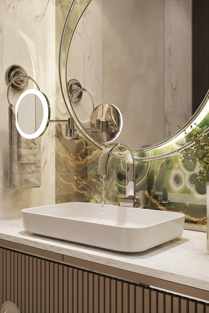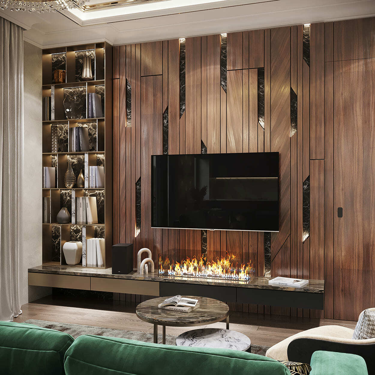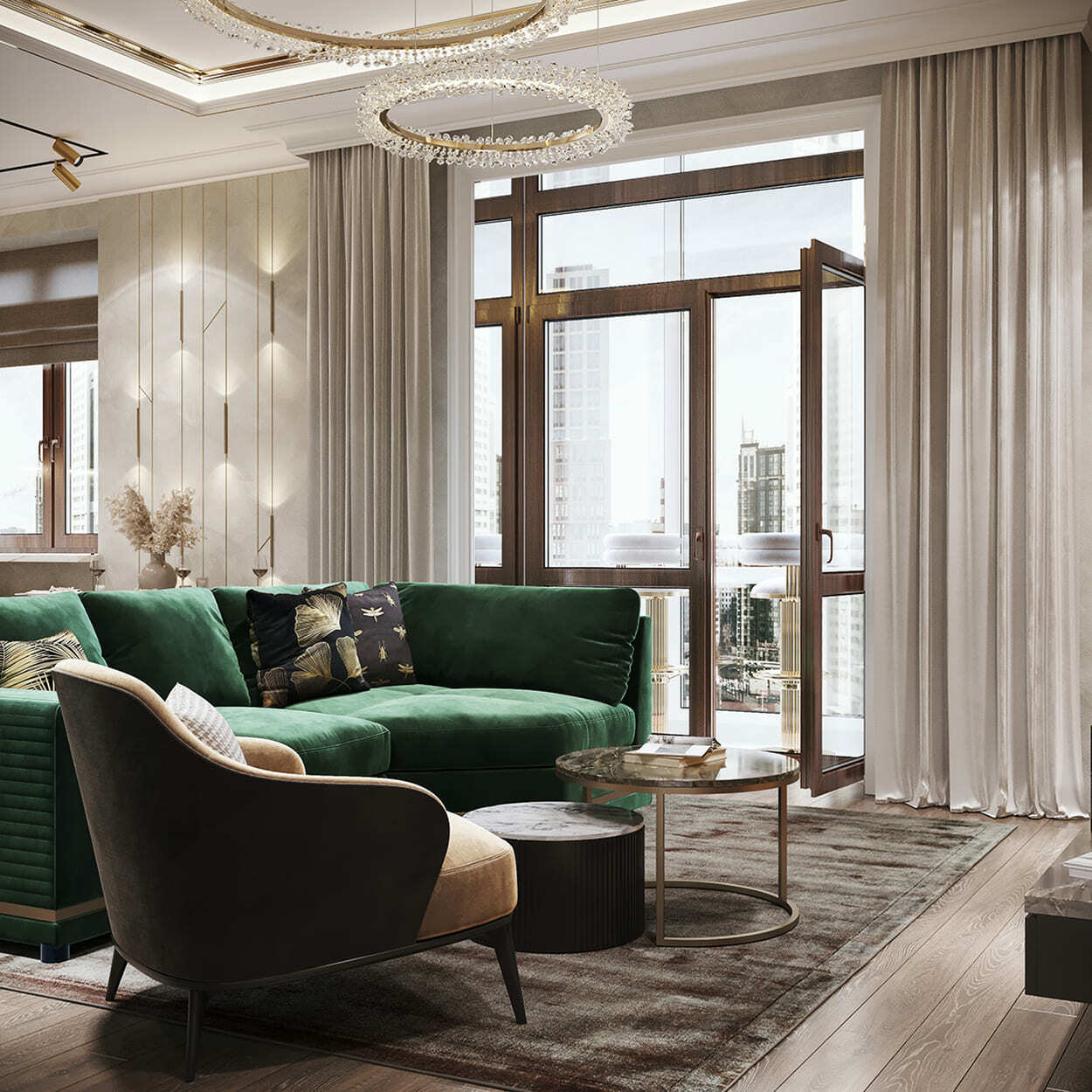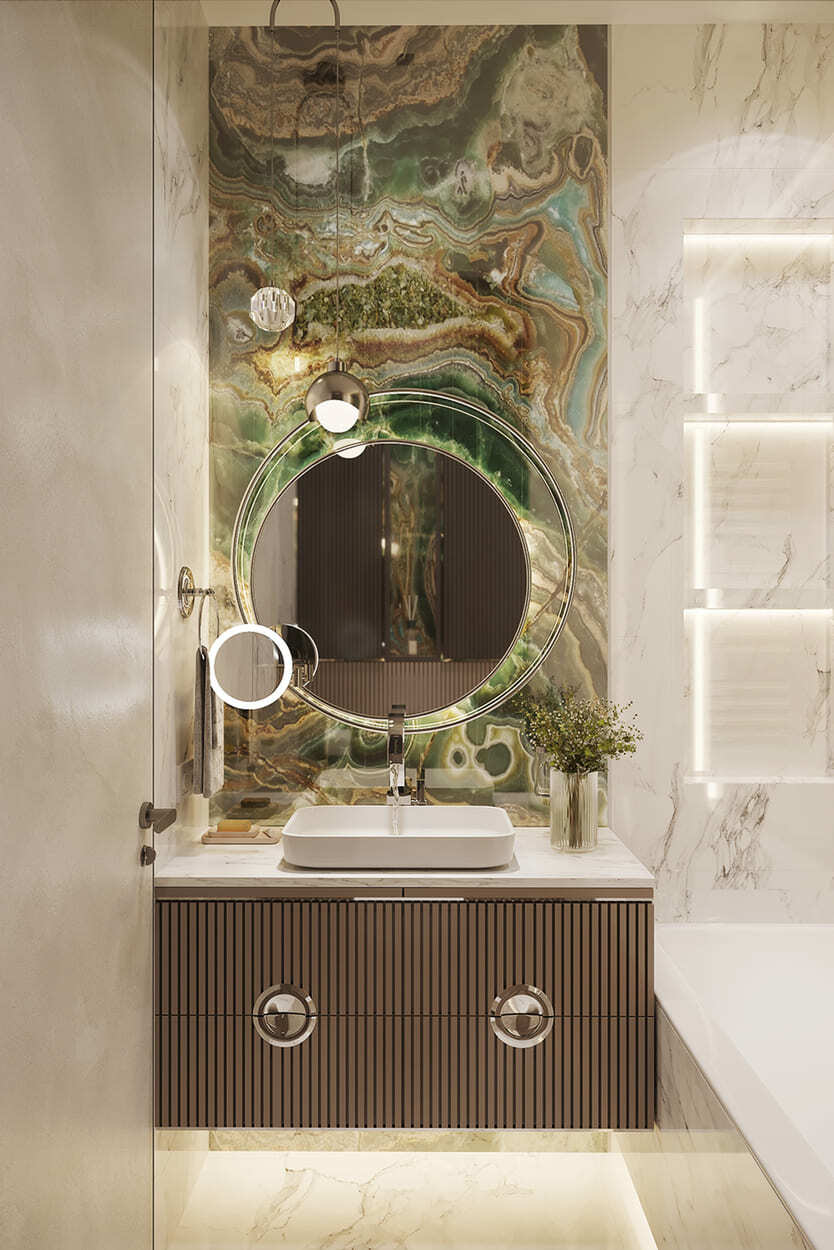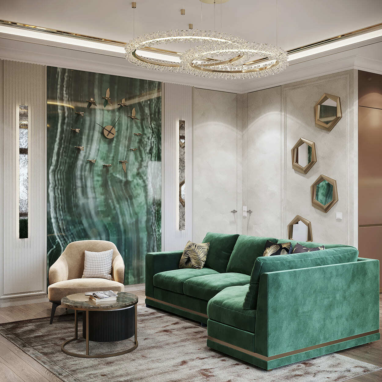В гостиной — благородное, «породистое» сочетание изумрудного дивана, такого же мраморного панно на стене и кофейных, золотистых оттенков, встречающихся в обивке кресла, журнальном столике и системе освещения. А «бахромистые» дизайнерские люстры добавляют немного лоска и даже «вау» эффекта.