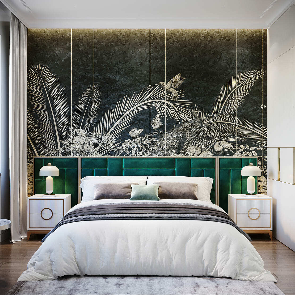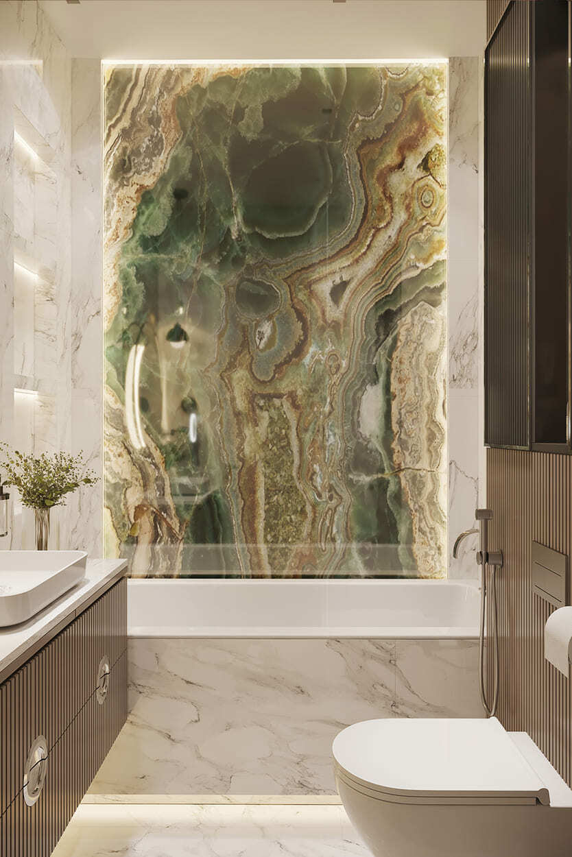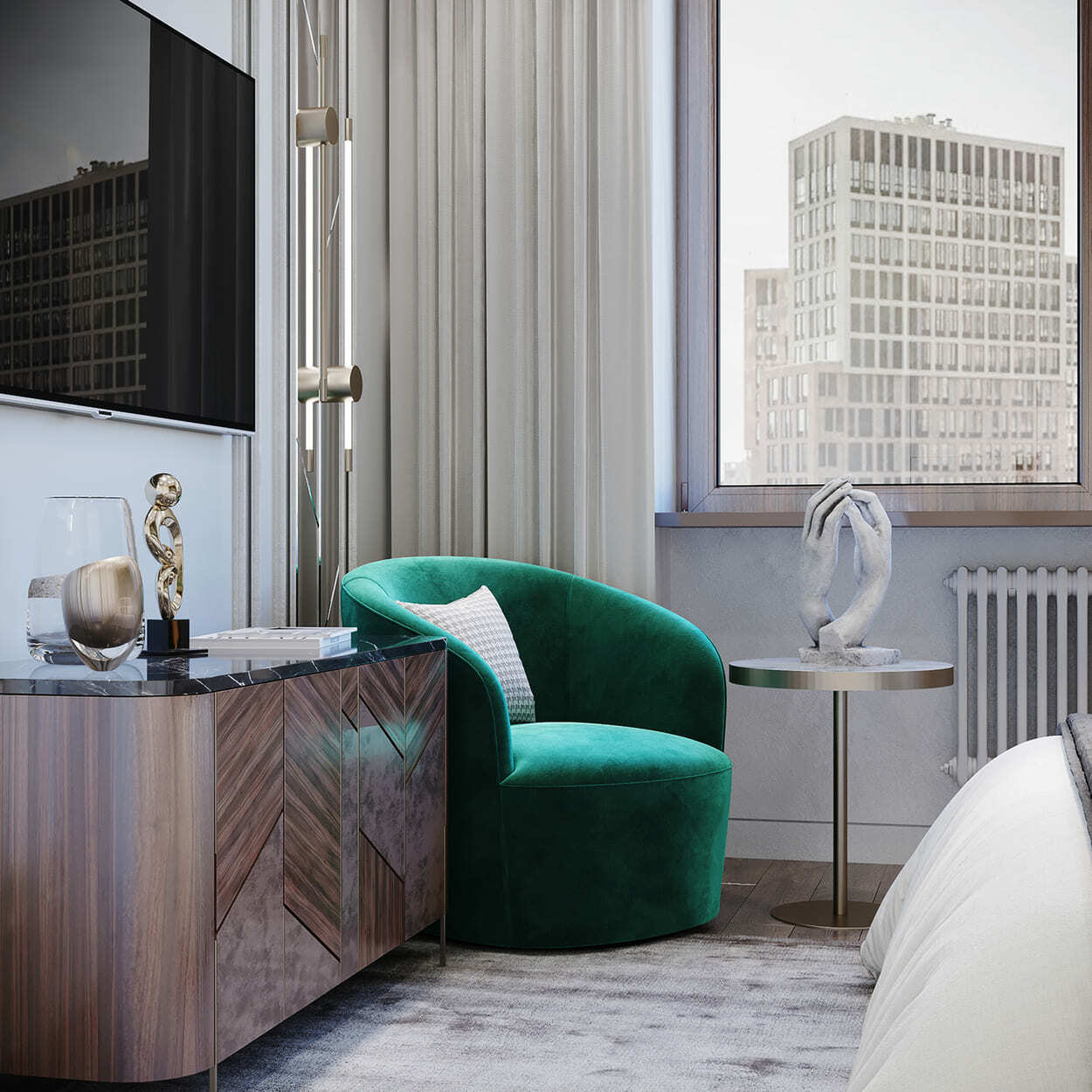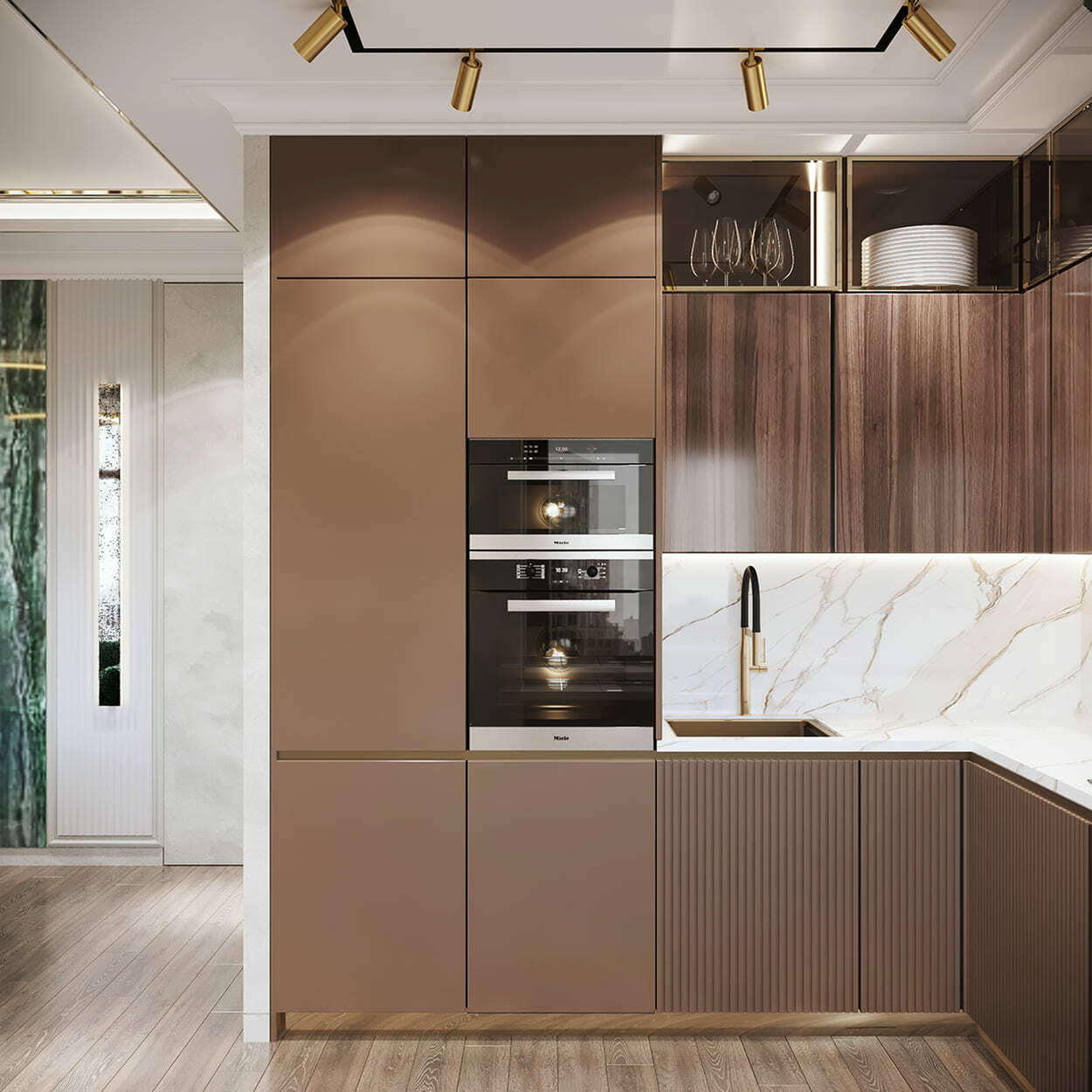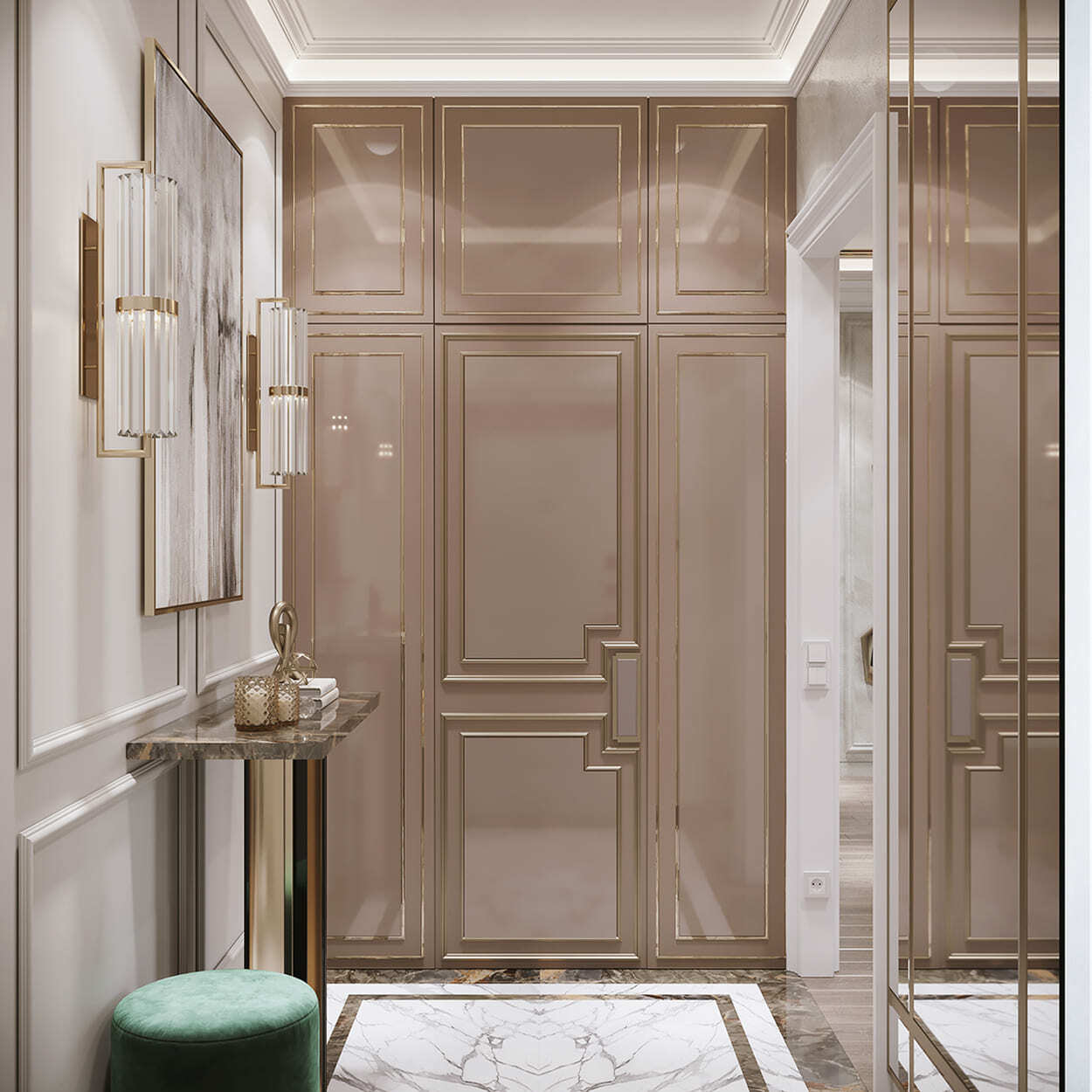 В гостиной — благородное, «породистое» сочетание изумрудного дивана, такого же мраморного панно на стене и кофейных, золотистых оттенков, встречающихся в обивке кресла, журнальном столике и системе освещения. А «бахромистые» дизайнерские люстры добавляют немного лоска и даже «вау» эффекта.