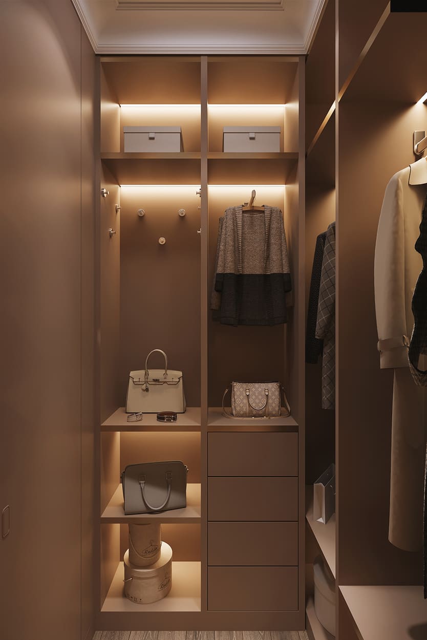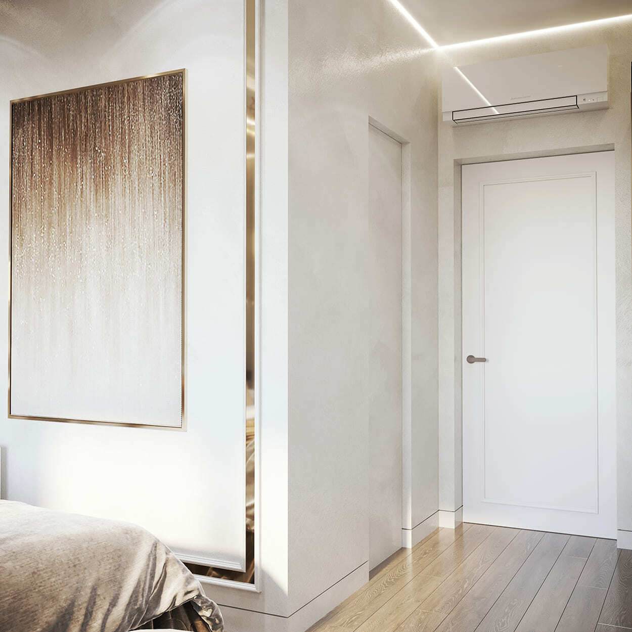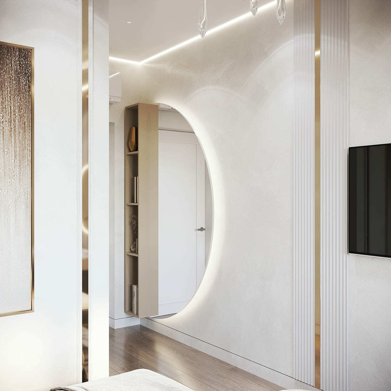 При этом крафтовая панель за телевизором с огоньками, встроенными между плашек, и камином создаёт ту самую магическую, притягательную атмосферу, которая словно магнит сближает сердца и настраивает на романтический лад. Именно то, что и надо молодой приятной паре.
