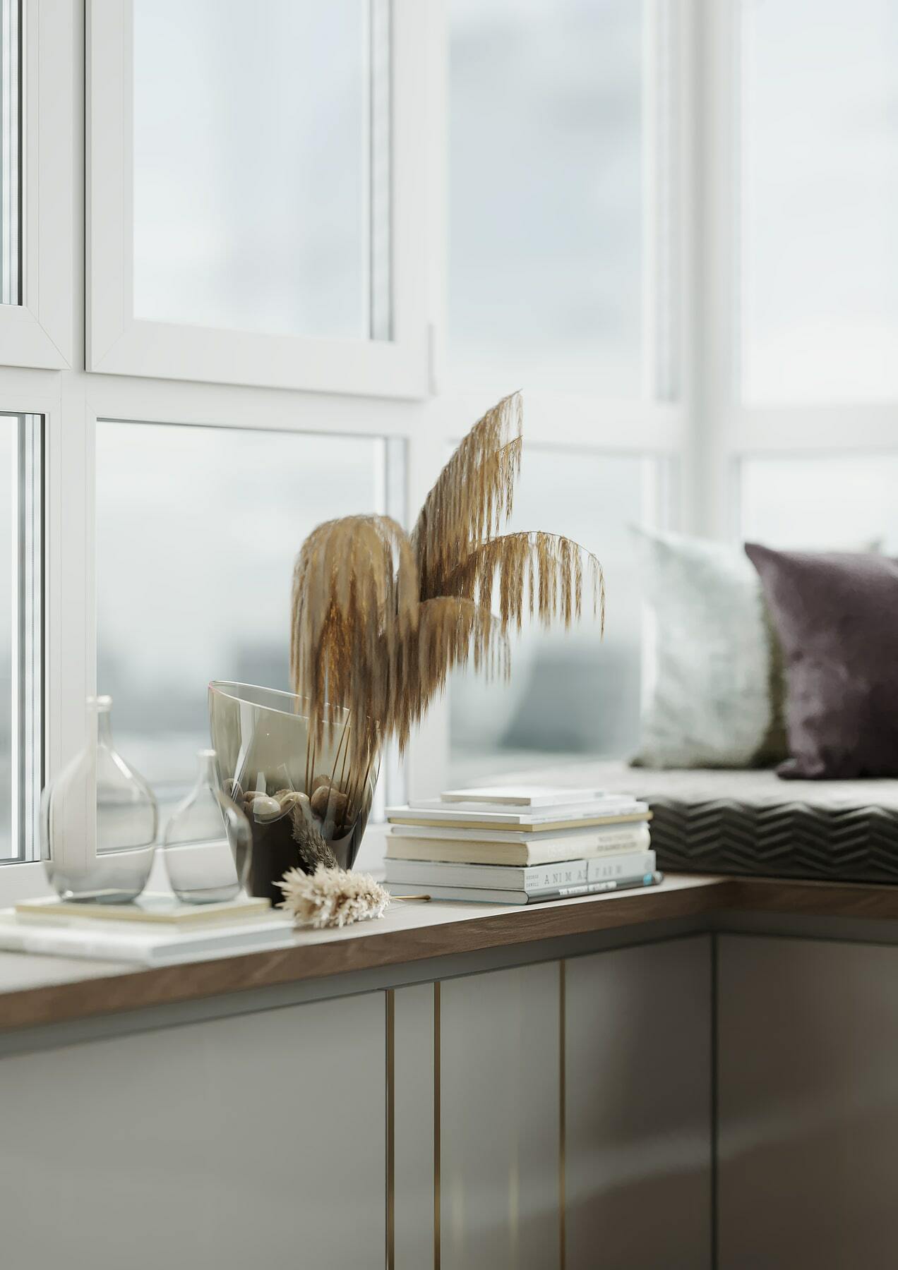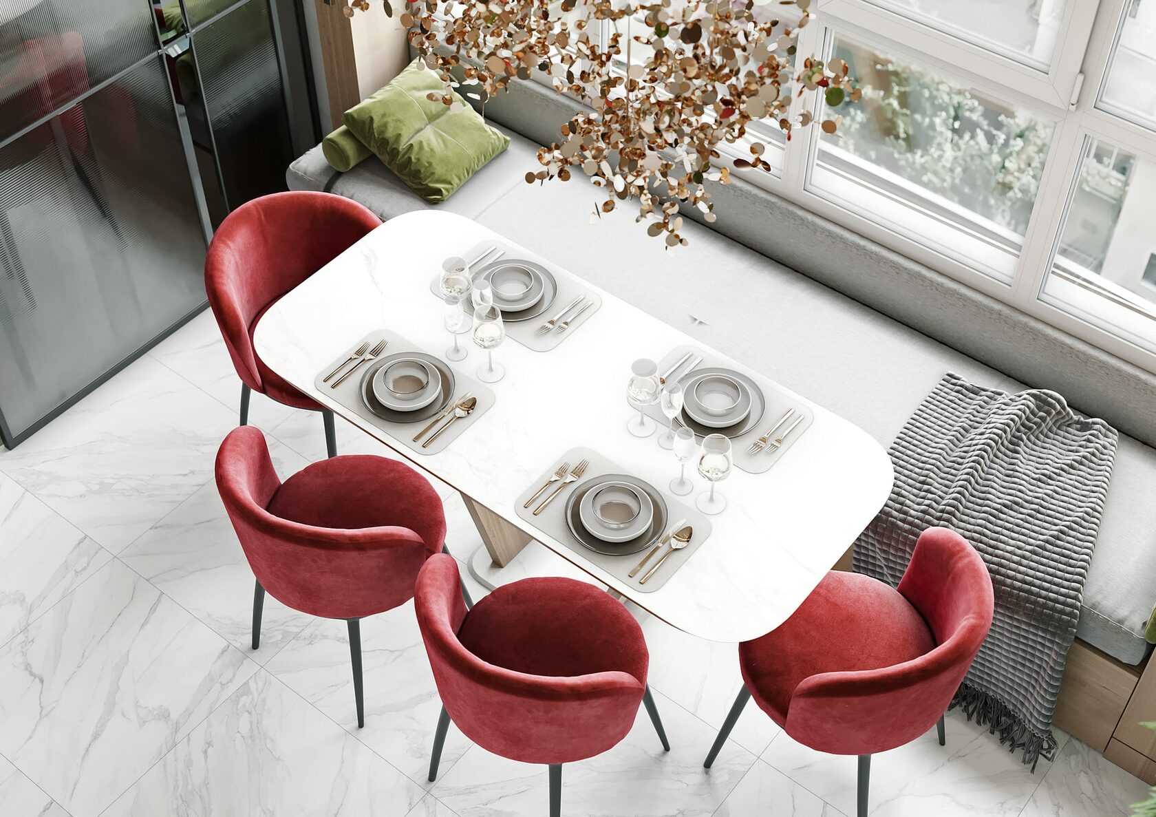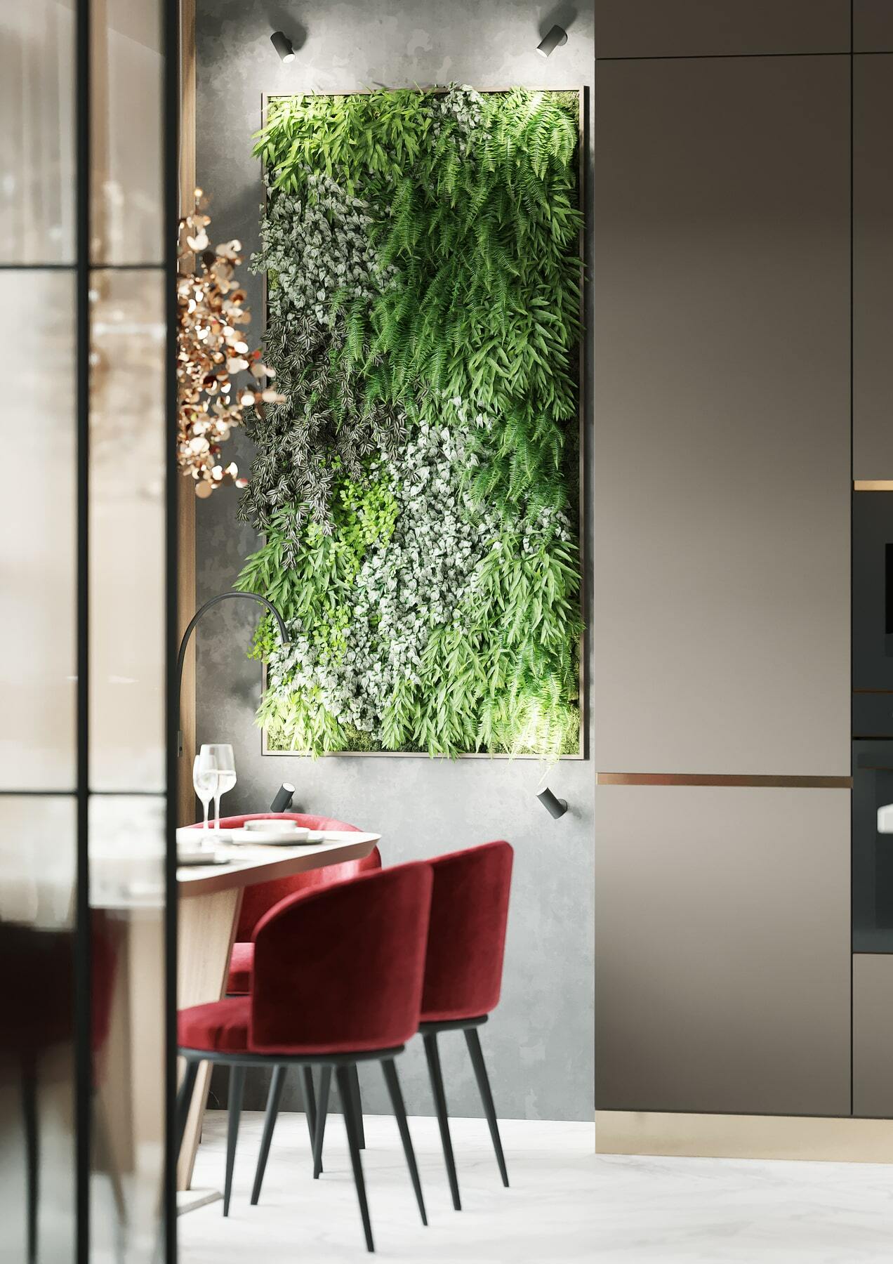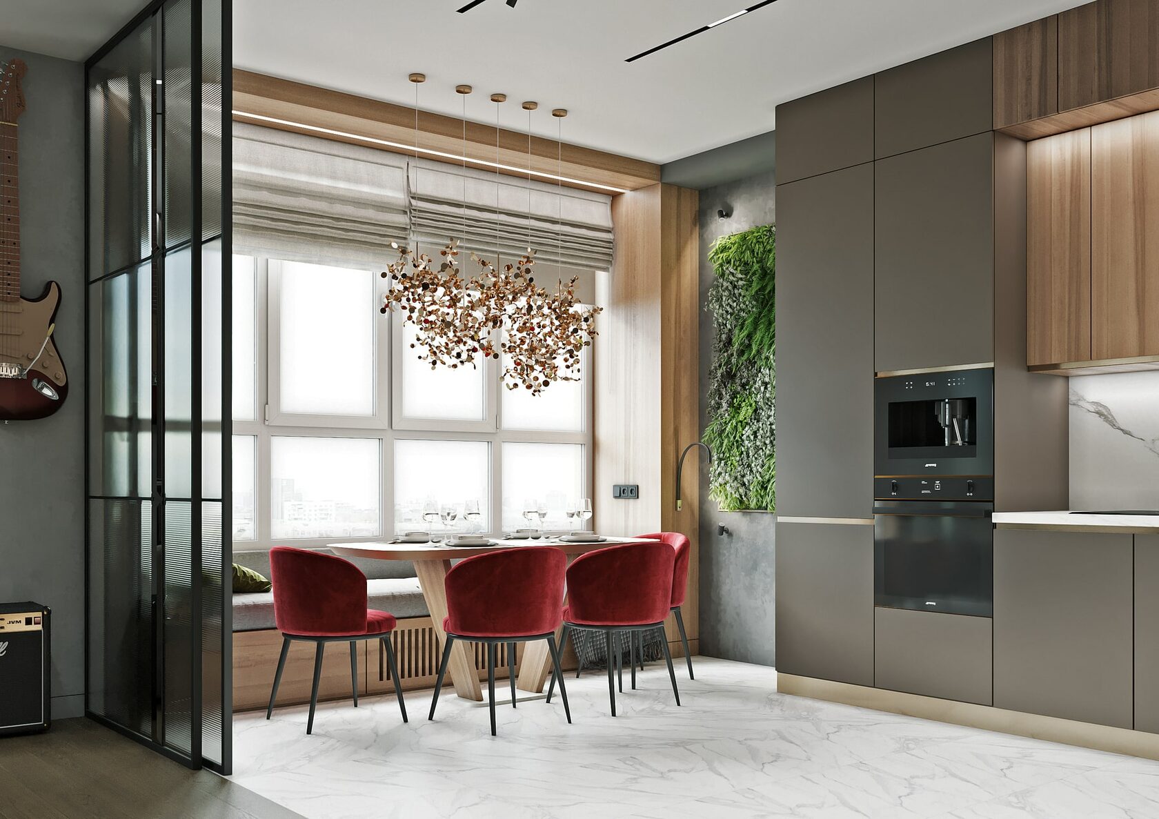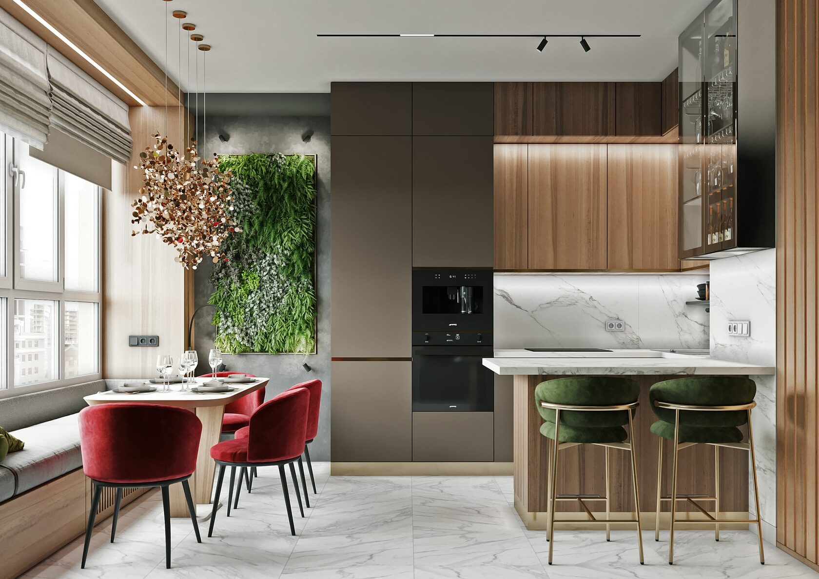 Выверенные дизайнерские решения позволили создать уникальную комбинацию скромного и одновременно с этим шикарного. Яркий тому пример — кухня. Здесь неброский, но стильный винный шкаф, а также стол и стены из изысканного белого камня прекрасно сочетаются с минималистичной банкеткой и вишнёвыми креслами аккурат перед окном. Настоящий полуостров уюта и камерности для вкусных во всех смыслах вечеров!