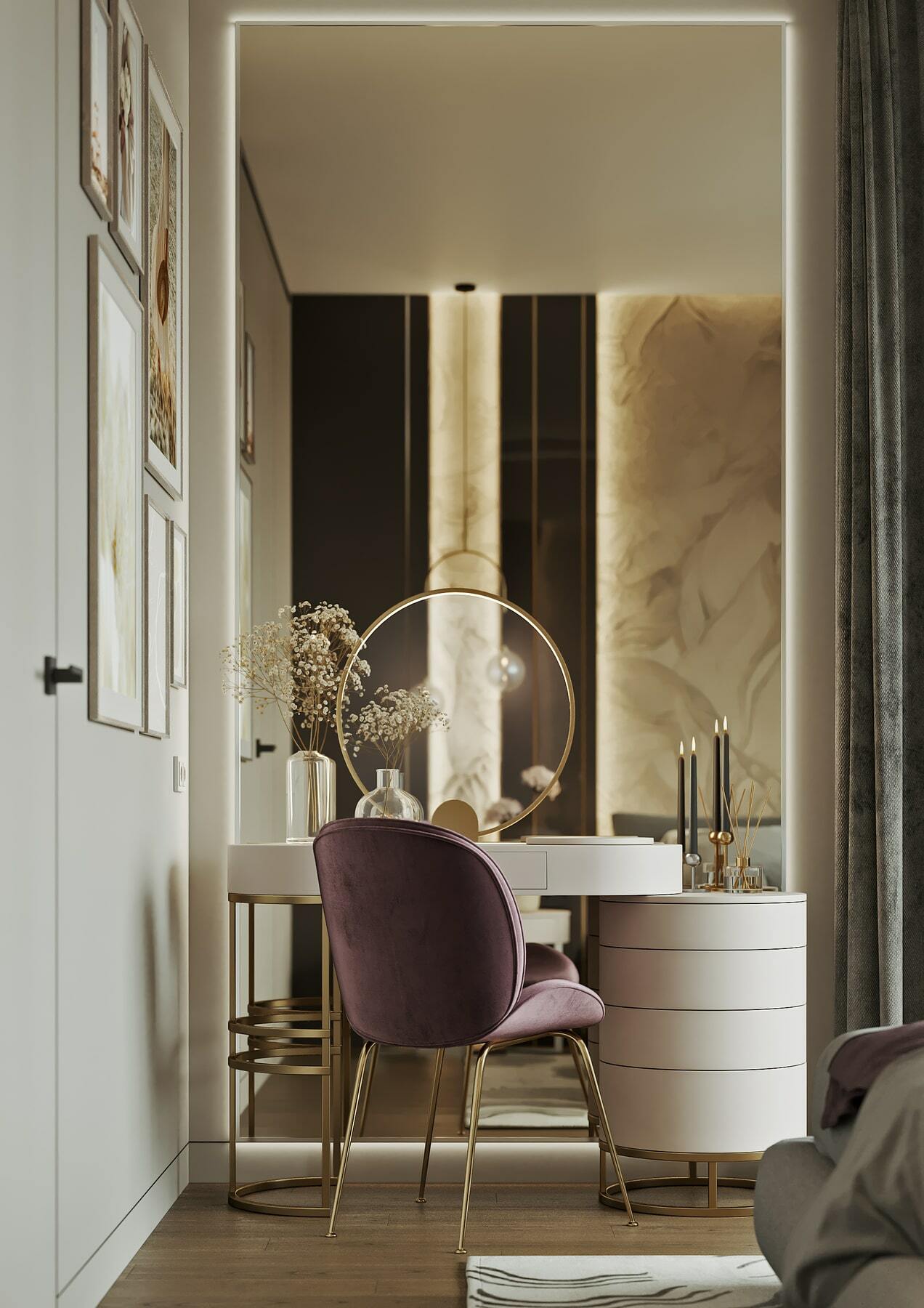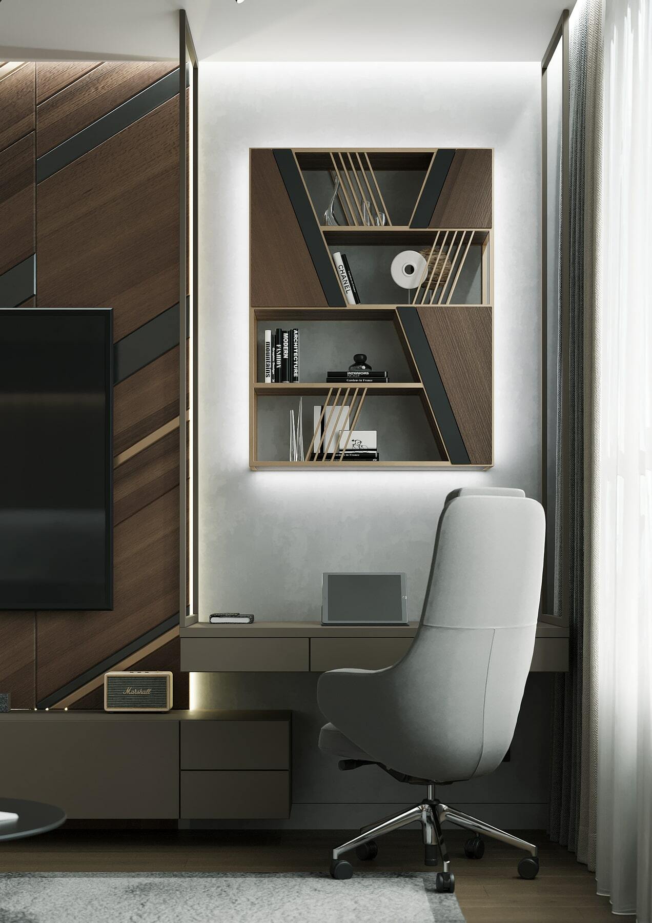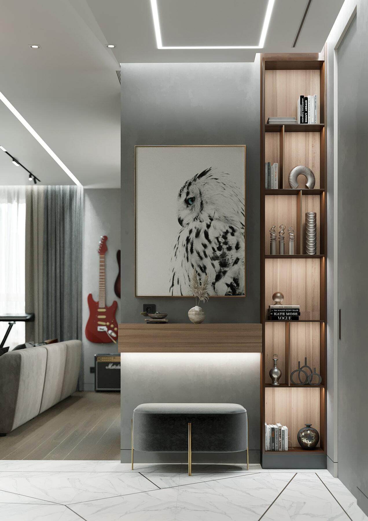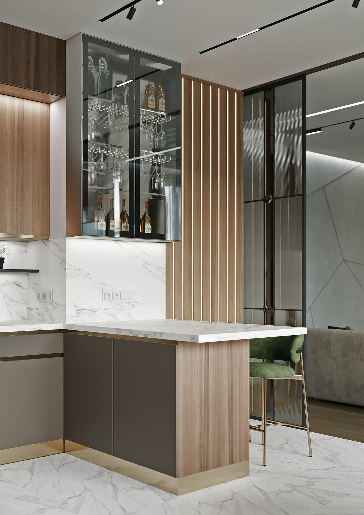 Нетривиальным дополнением стала фитостена, которая подсвечивается по периметру направленными светильниками, так что зелень создаёт ощущение ожившего сада. А дизайнерская люстра с золотыми лепестками Terzani создаёт завораживающие блики в интерьере, подобно светлячкам. Таким образом, в пространстве люксовая составляющая не ощущается слишком броской. Это «шик для себя». Это, прежде всего, про личное, не направленное исключительно на зрителя.