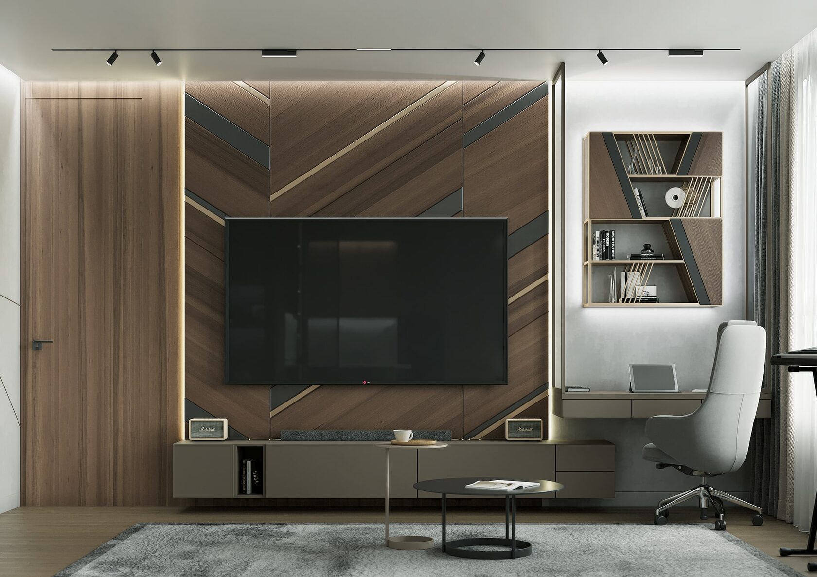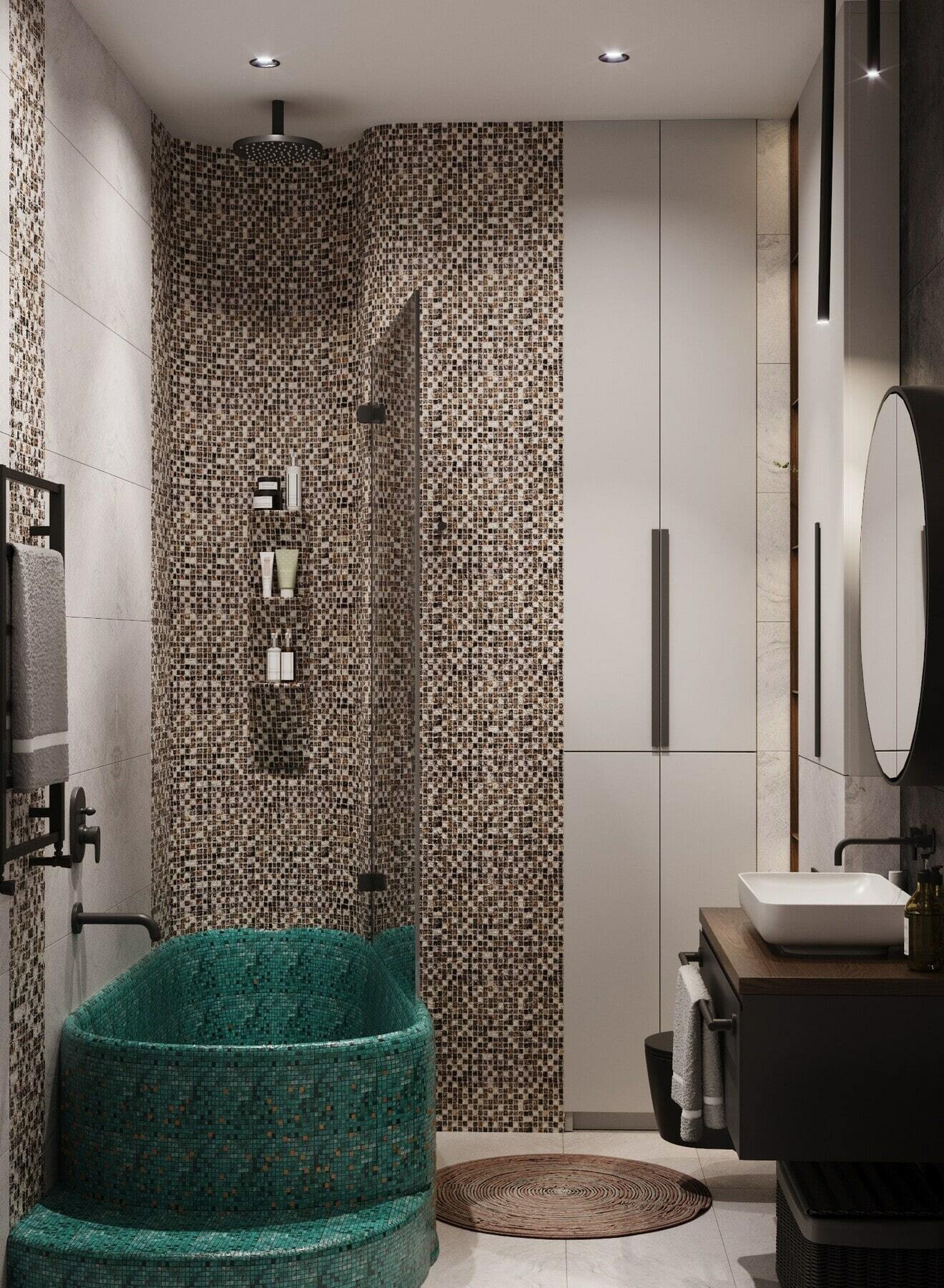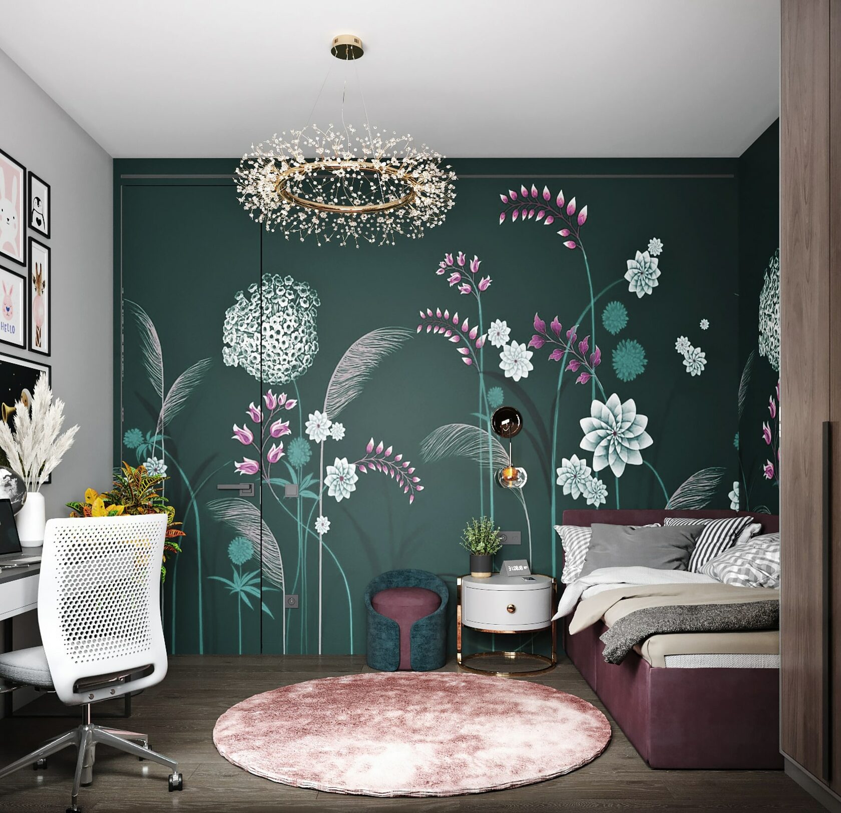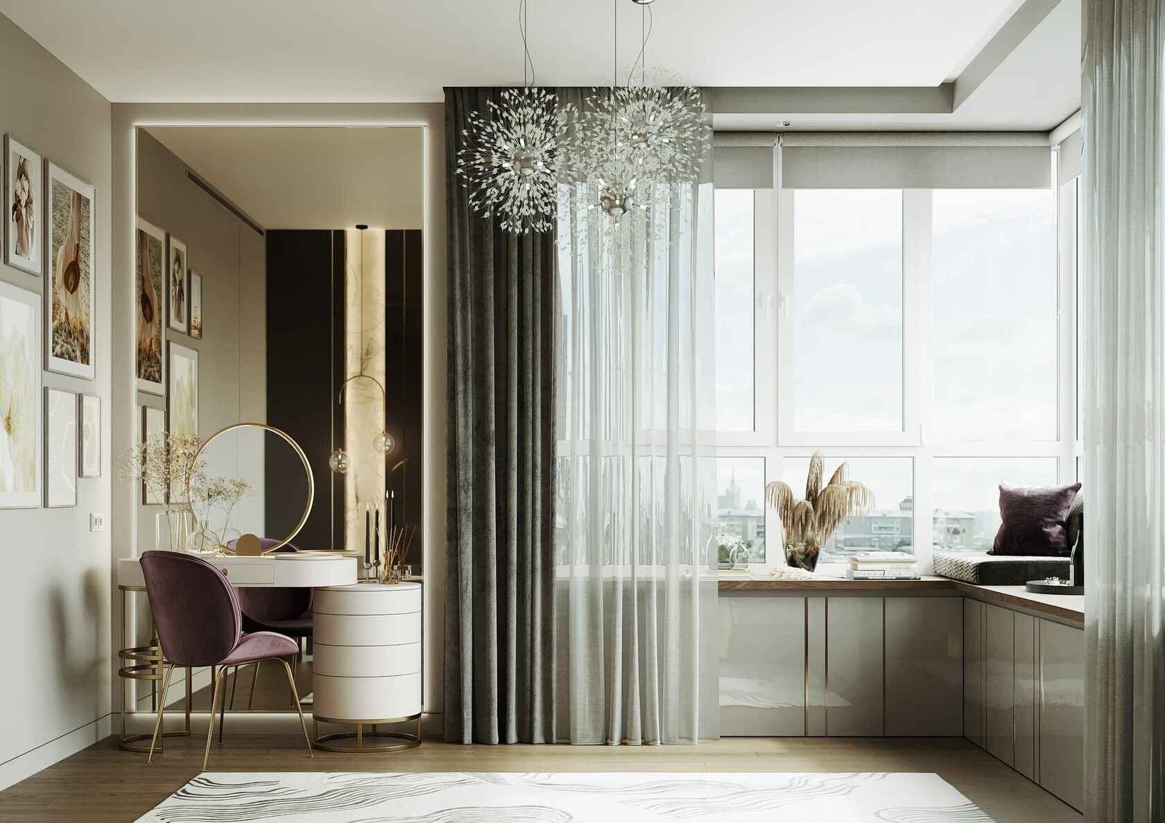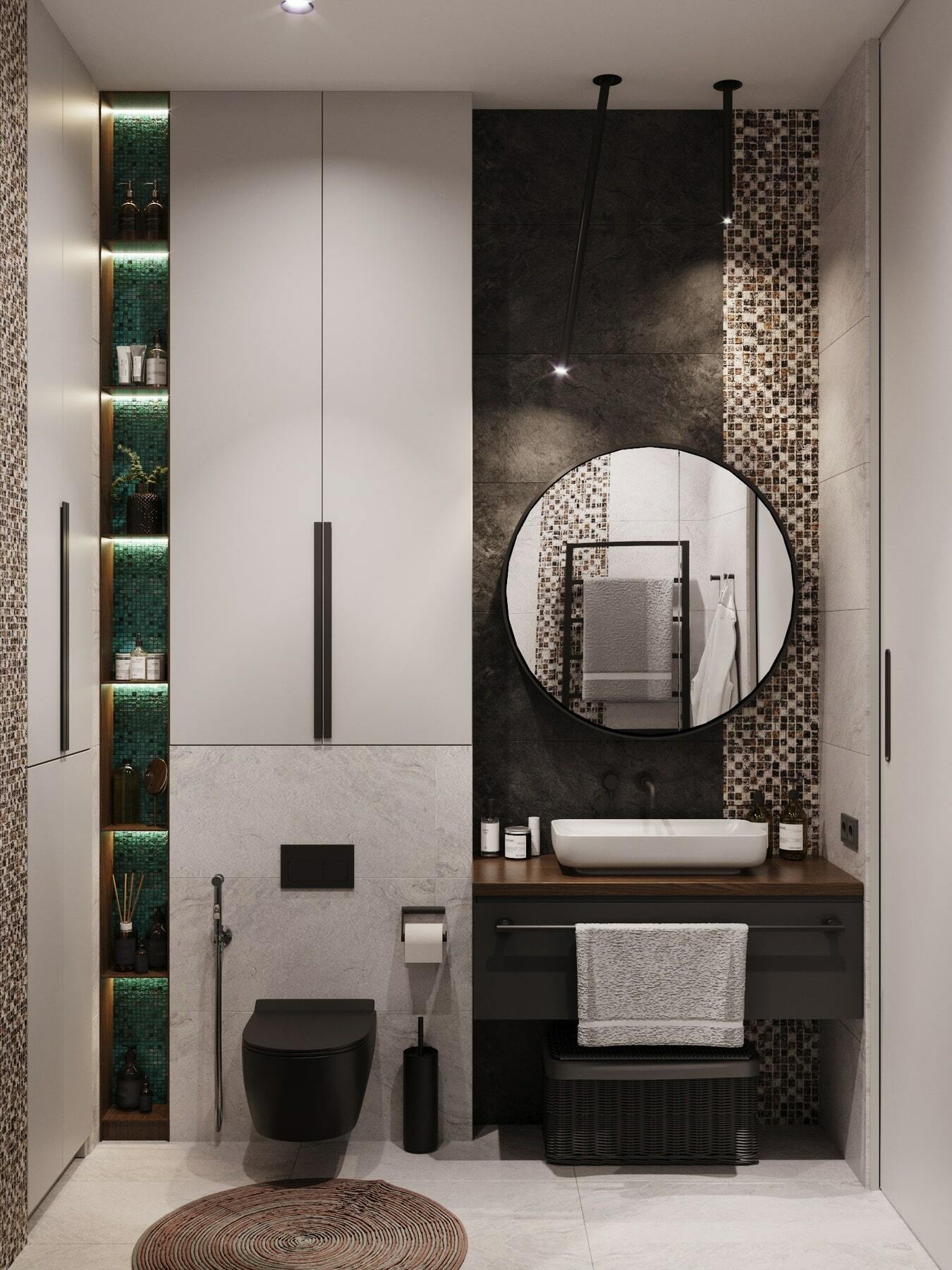Нетривиальным дополнением стала фитостена, которая подсвечивается по периметру направленными светильниками, так что зелень создаёт ощущение ожившего сада. А дизайнерская люстра с золотыми лепестками Terzani создаёт завораживающие блики в интерьере, подобно светлячкам. Таким образом, в пространстве люксовая составляющая не ощущается слишком броской. Это «шик для себя». Это, прежде всего, про личное, не направленное исключительно на зрителя.