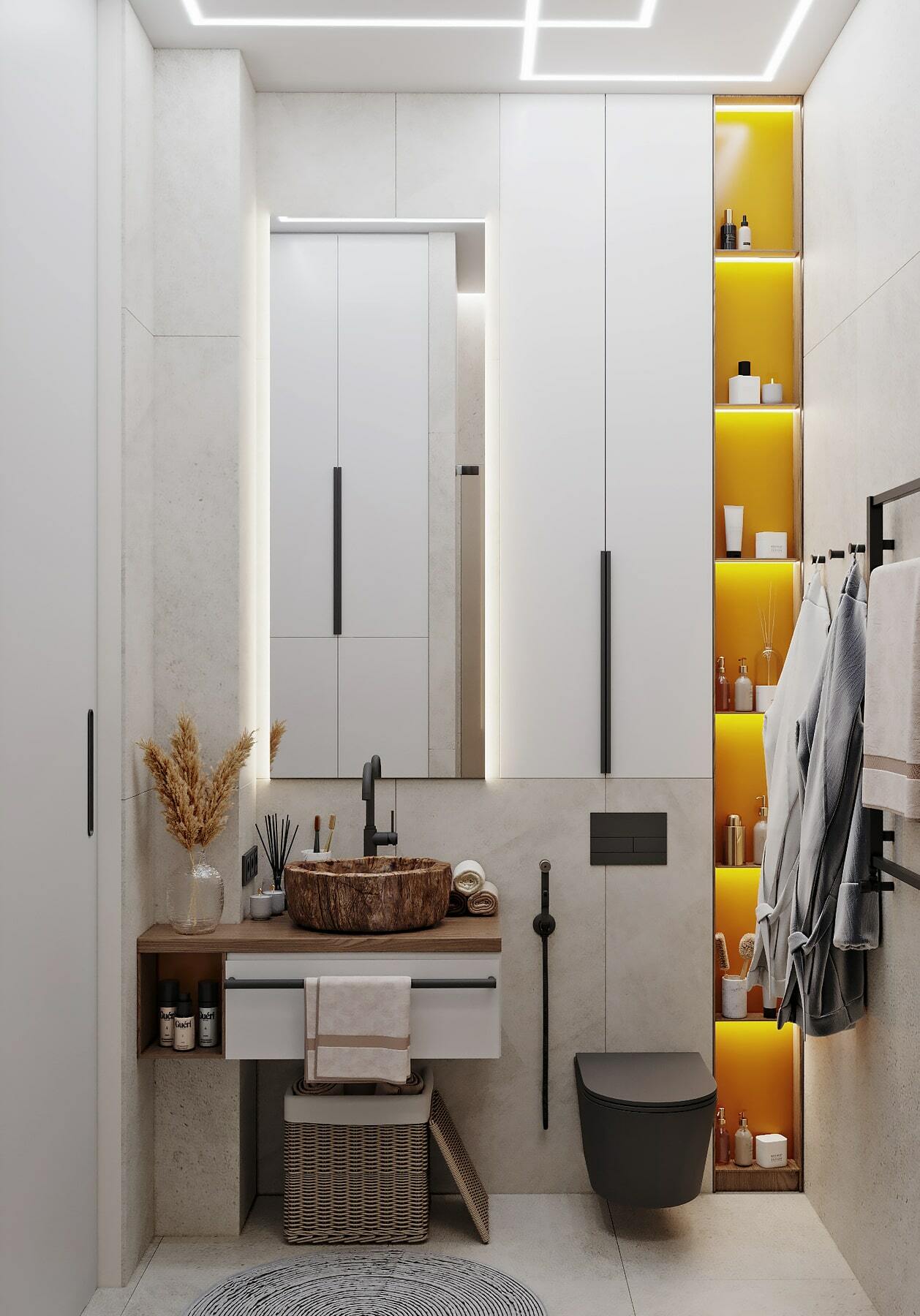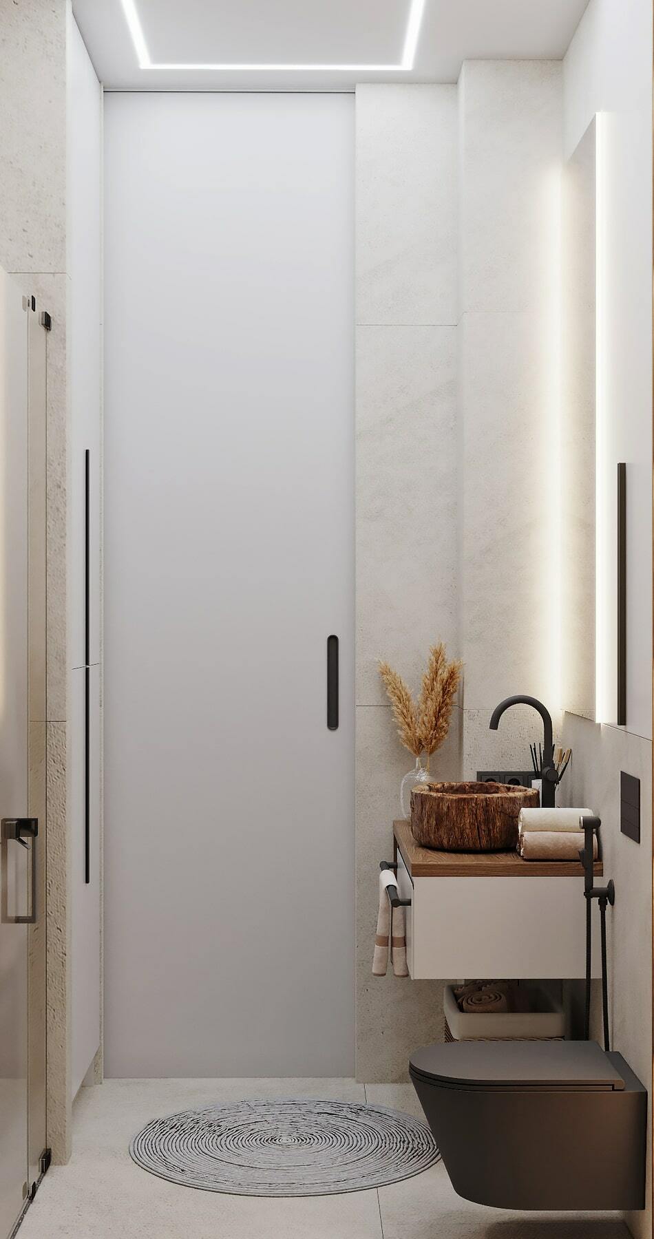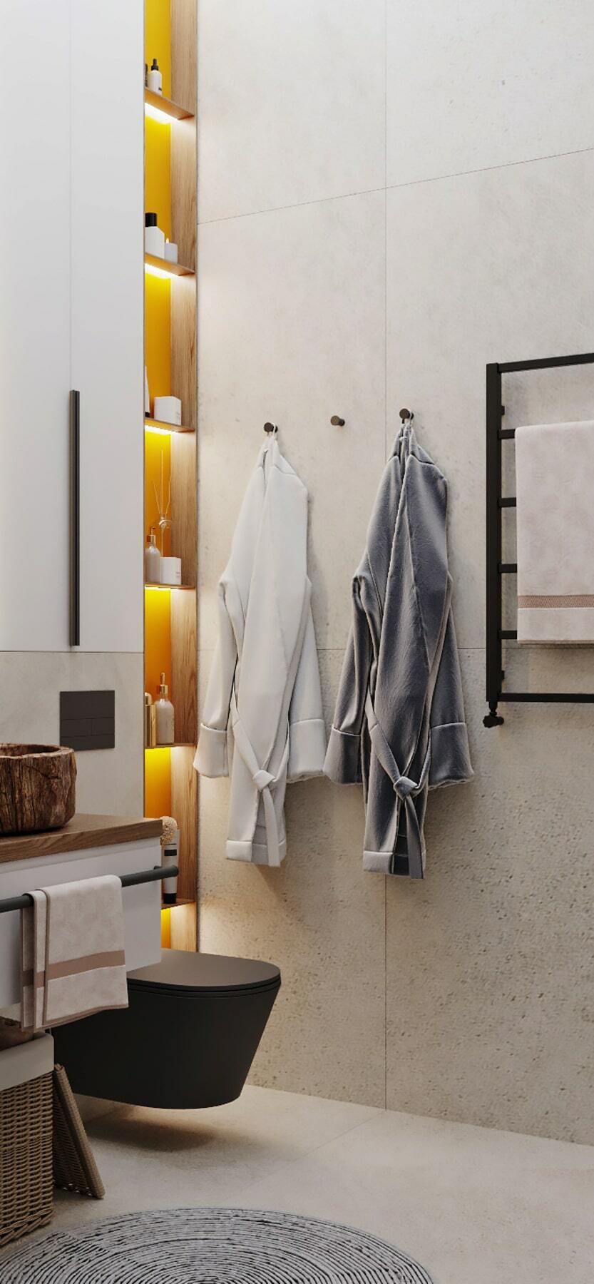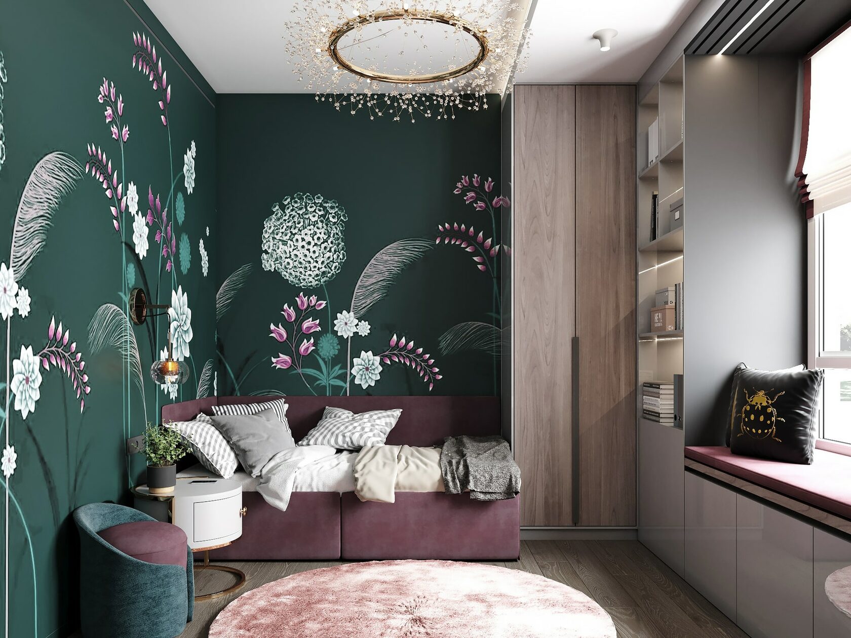 Нетривиальным дополнением стала фитостена, которая подсвечивается по периметру направленными светильниками, так что зелень создаёт ощущение ожившего сада. А дизайнерская люстра с золотыми лепестками Terzani создаёт завораживающие блики в интерьере, подобно светлячкам. Таким образом, в пространстве люксовая составляющая не ощущается слишком броской. Это «шик для себя». Это, прежде всего, про личное, не направленное исключительно на зрителя.