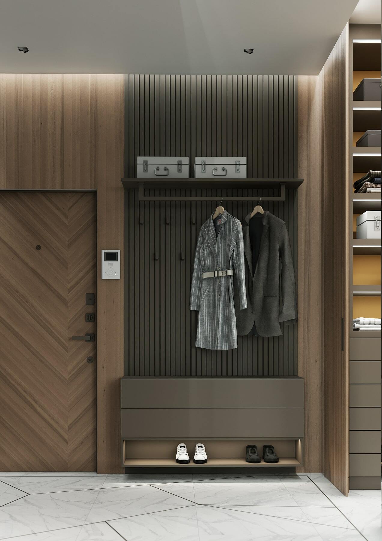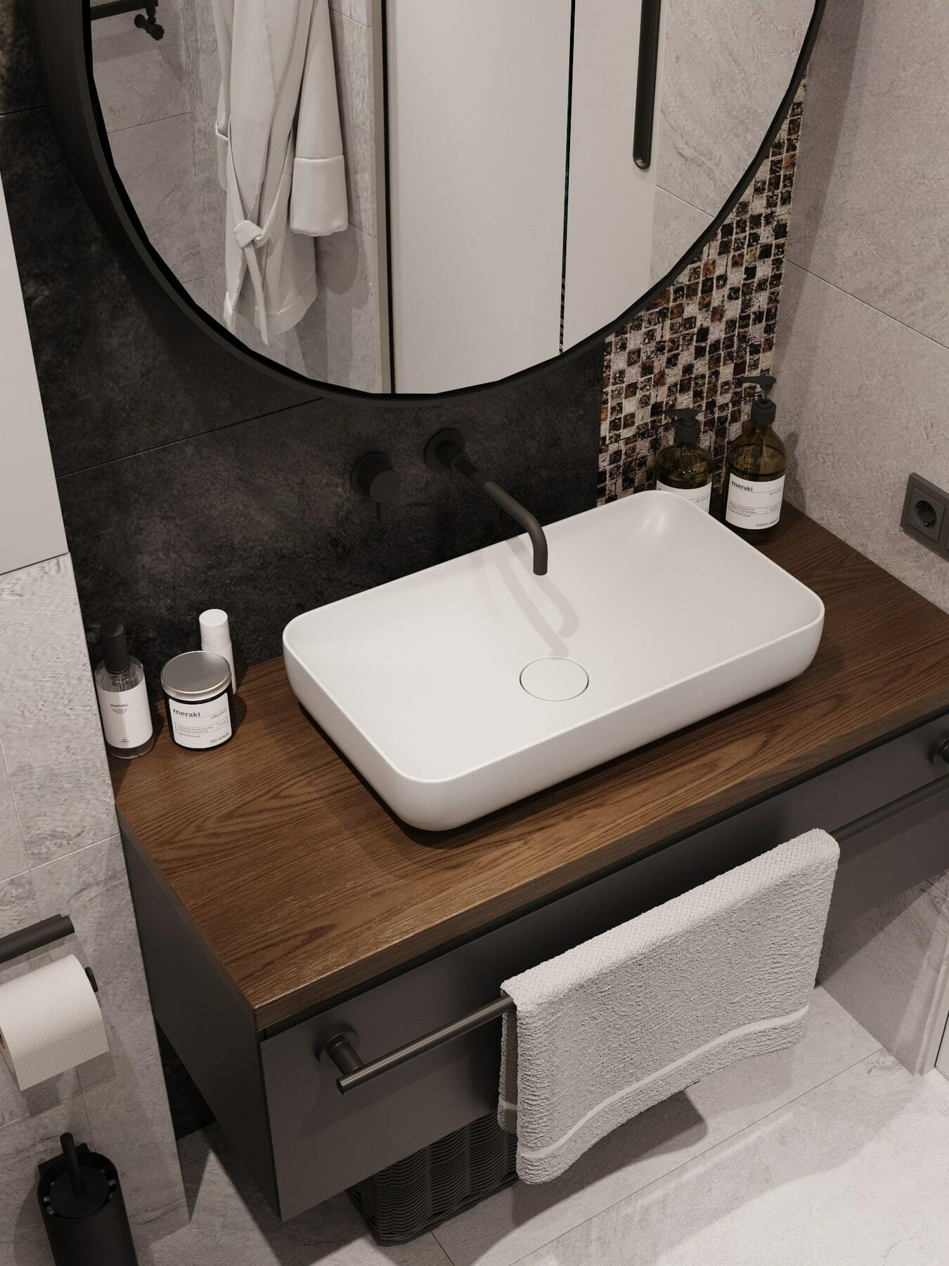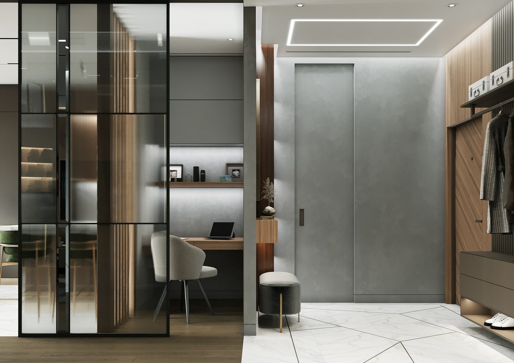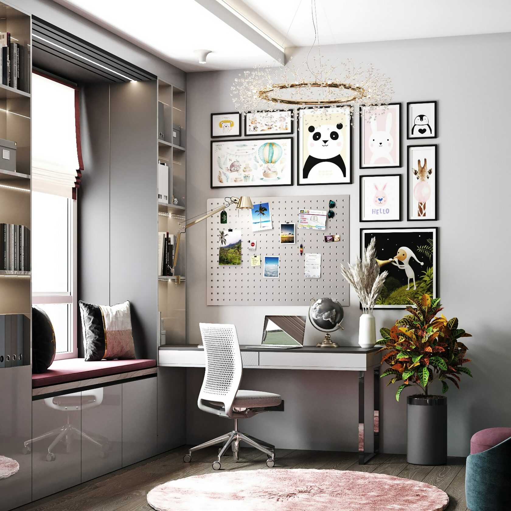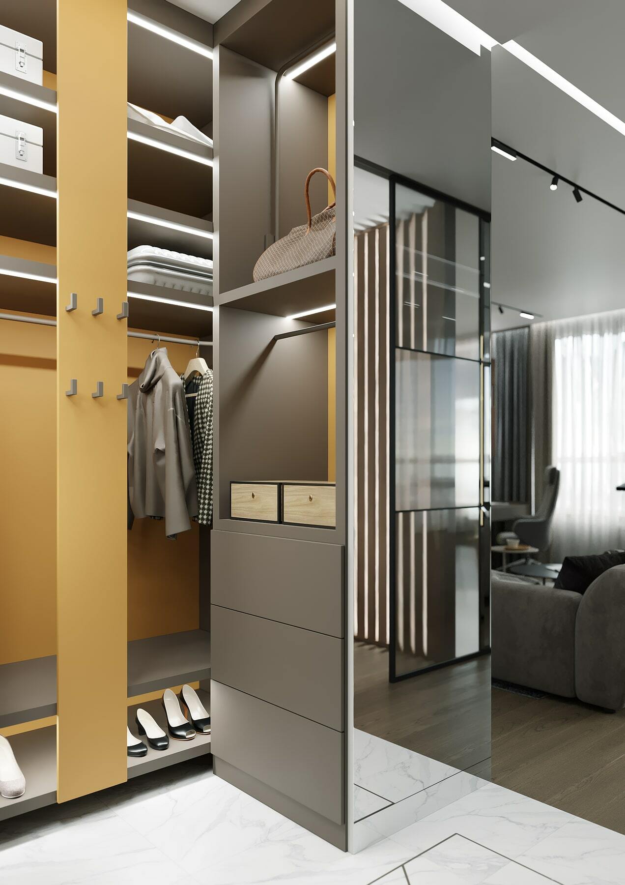 Нетривиальным дополнением стала фитостена, которая подсвечивается по периметру направленными светильниками, так что зелень создаёт ощущение ожившего сада. А дизайнерская люстра с золотыми лепестками Terzani создаёт завораживающие блики в интерьере, подобно светлячкам. Таким образом, в пространстве люксовая составляющая не ощущается слишком броской. Это «шик для себя». Это, прежде всего, про личное, не направленное исключительно на зрителя.