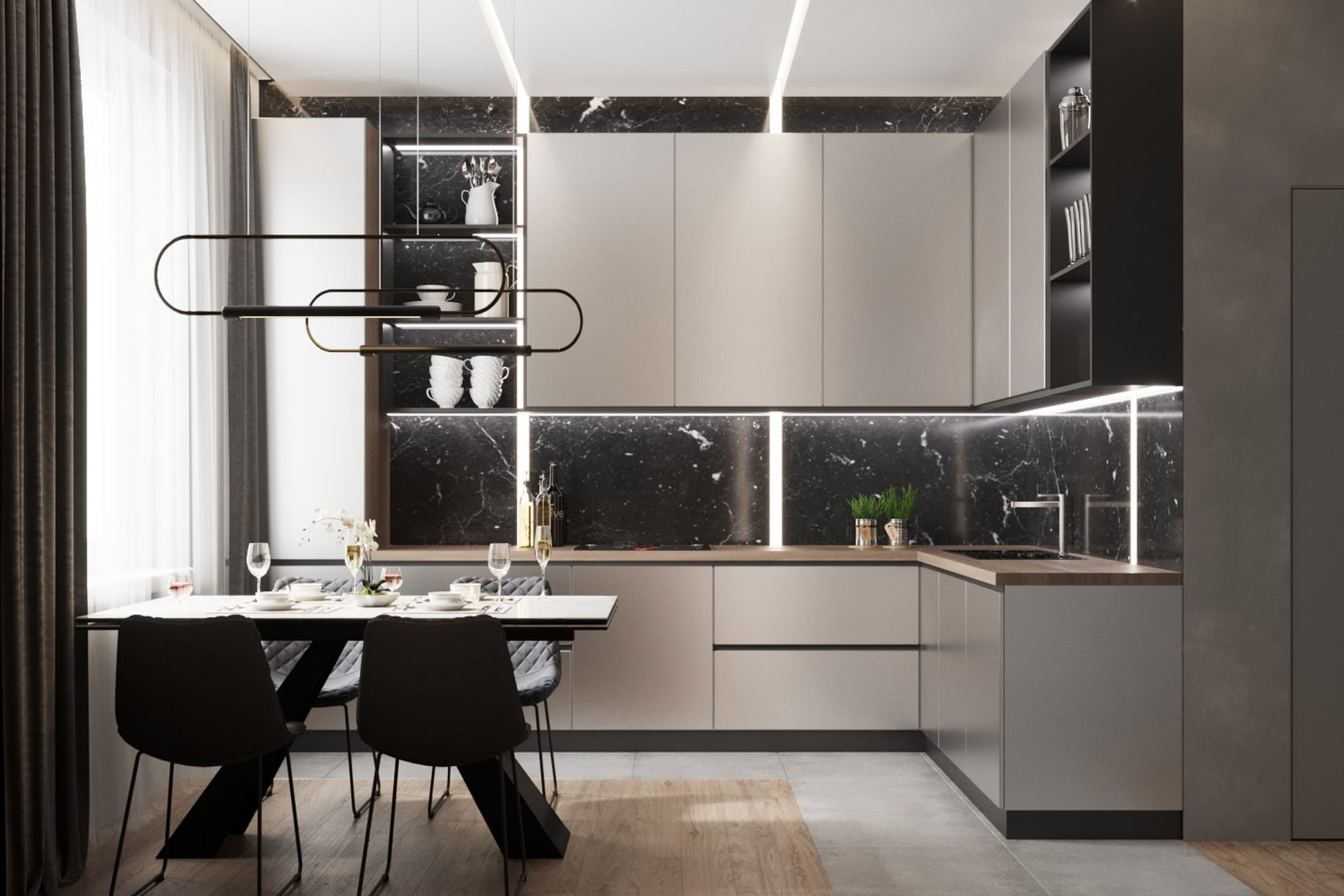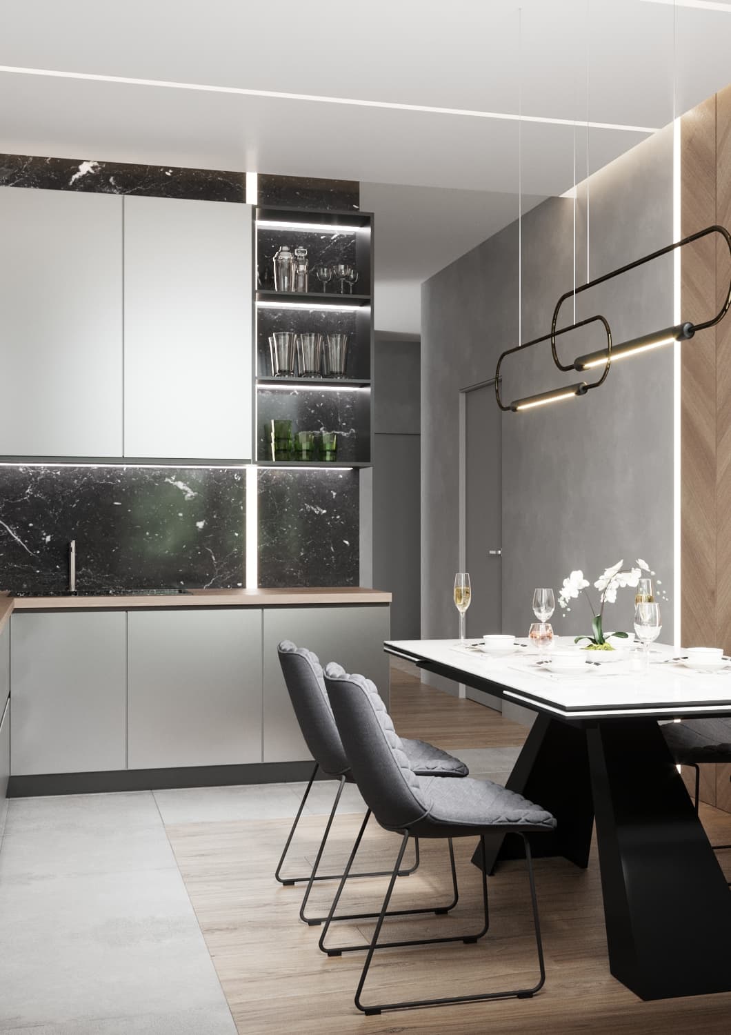 На кухне система линейных светильников, расположенных от потолка к фартуку, также помогает визуально расширить пространство, дать ему воздух. Мрамор NeroMarquino на фартуке внутри открытых полок и над верхними шкафами позволяет сформировать единую композиционную линию от стены к кухонному гарнитуру, привносит логическую завершенность интерьеру. Кроме того, светильники инкрустированы в профиле в стену и установлены на диммер с теплым светом, для регулирования яркости света.