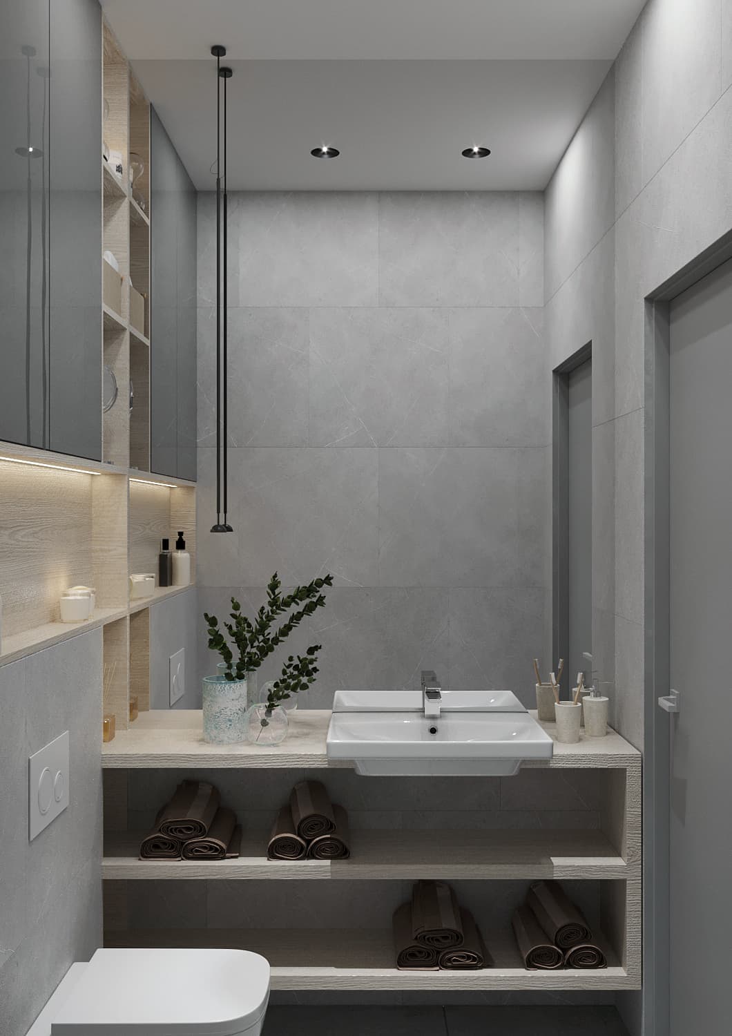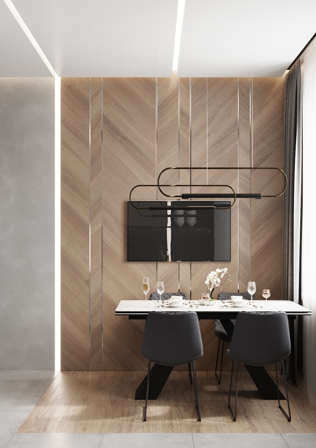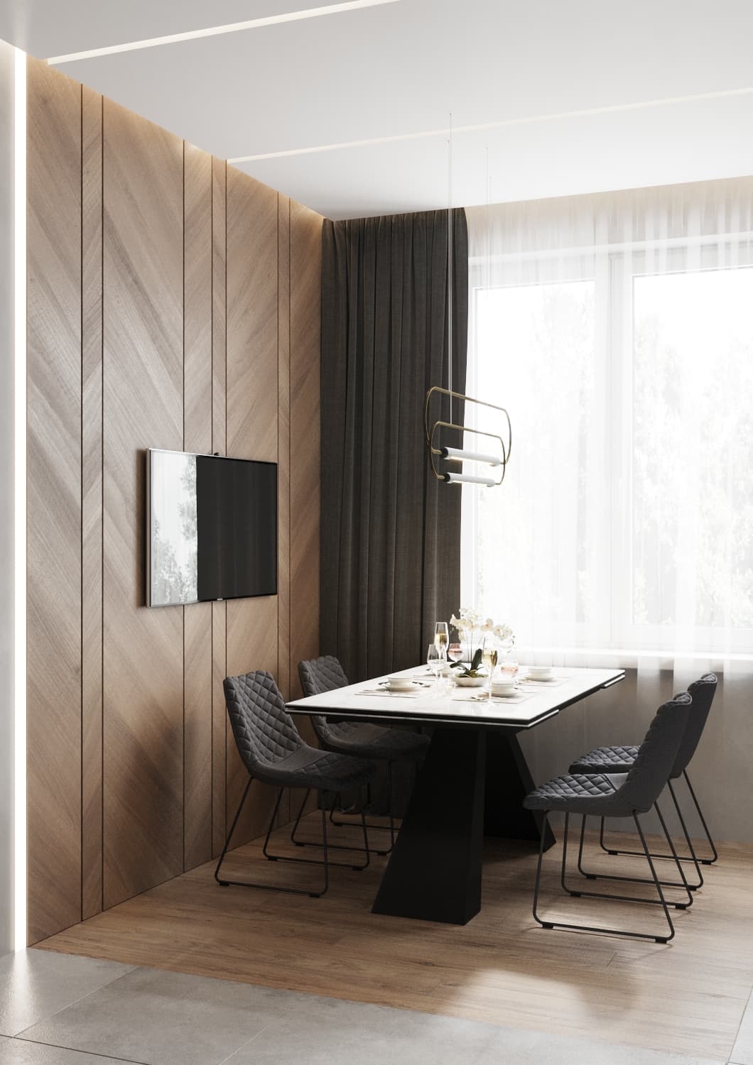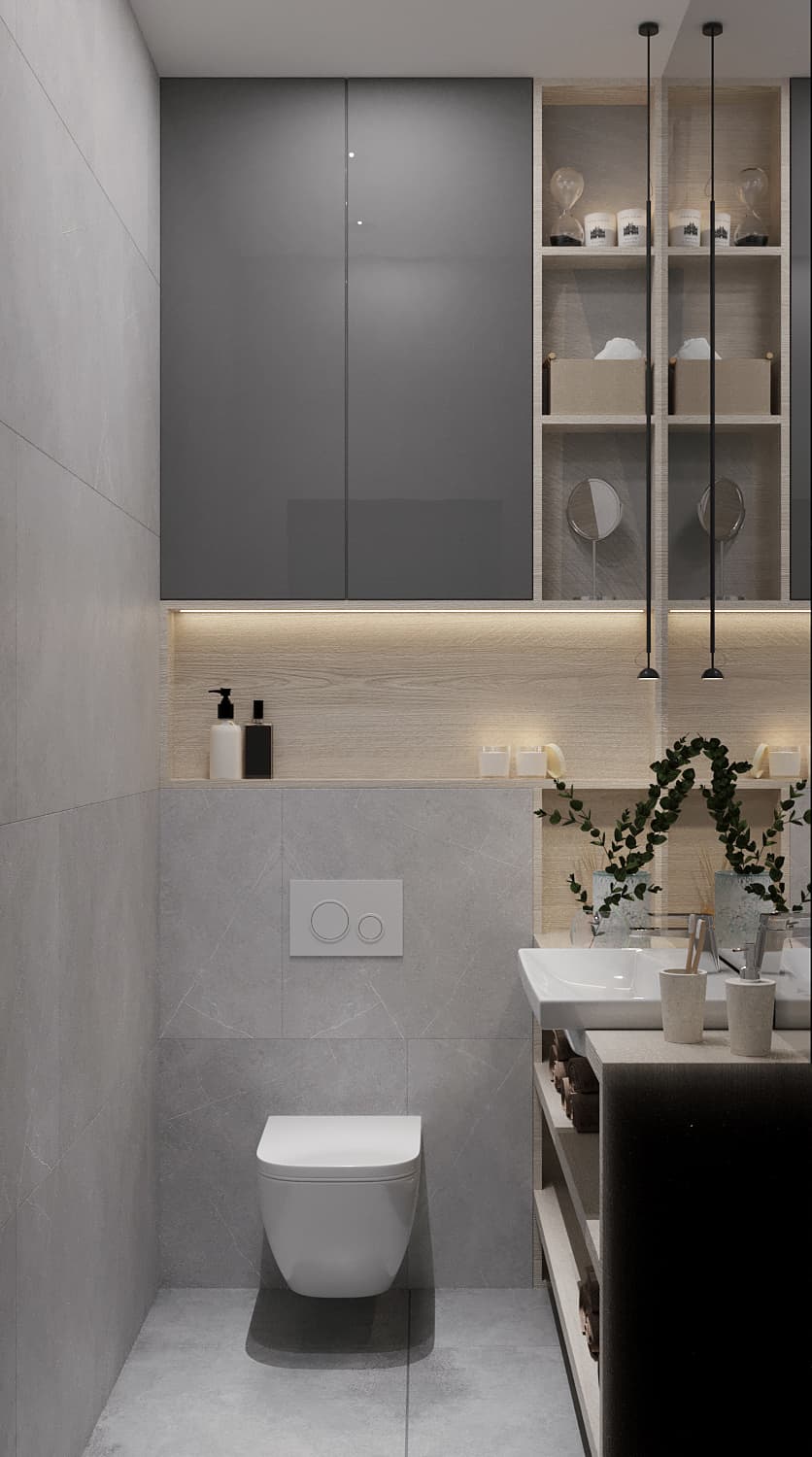 В данном дизайн-проекте для нашего клиента, холостого мужчины, мы сделали оригинальную рабочую зону и зону для отдыха в гостиной. Четкое зонирование пространства — характерная черта стиля «Современный лофт». Рабочая зона мягко «утопает» в естественном свете, благодаря правильному расположению стола рядом с окном. Створки шкафа графитового цвета имеют глянцевую поверхность. Данное функциональное решение добавило глубины пространству и сделала его более светлым за счёт отражения света. К слову, по центру шкафа располагаются полки с подсветкой, чтобы можно было поставить дорогой сердцу декор. При открытии створок шкафа внутри включается подсветка. Серо-бежевая цветовая палитра грамотно подчеркивает «мужскую доминанту» окружающего пространства. На стене с телевизором находятся панели под мрамор с хромированным рустом — легкий элемент изысканности.