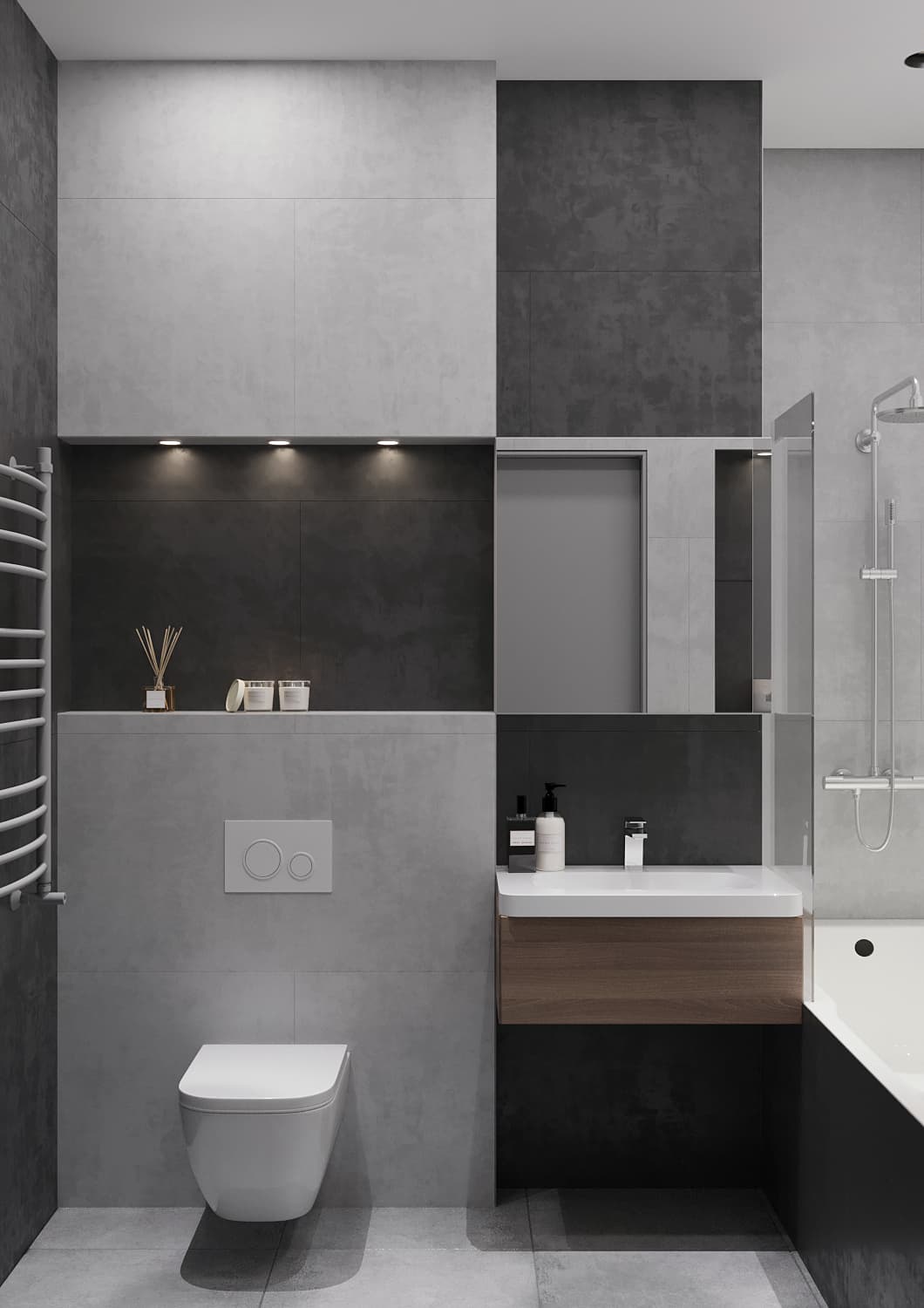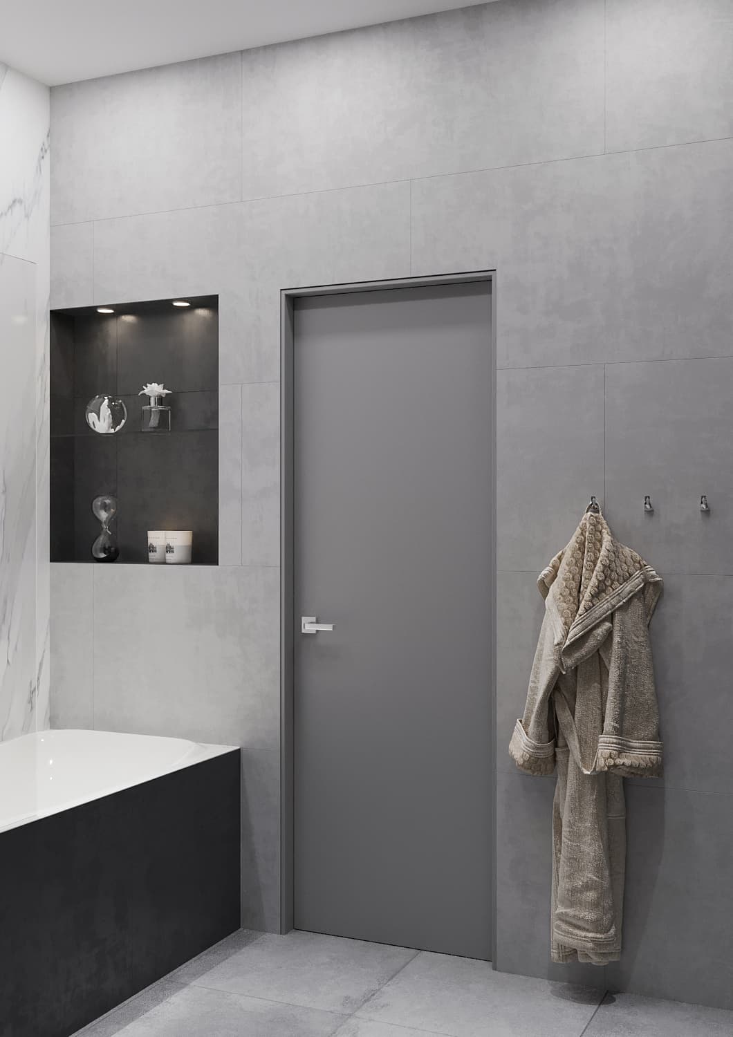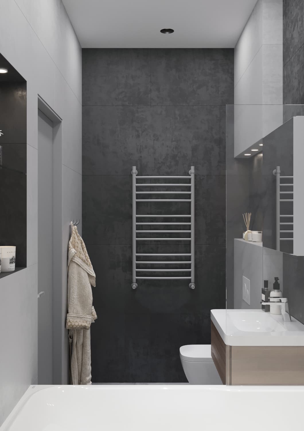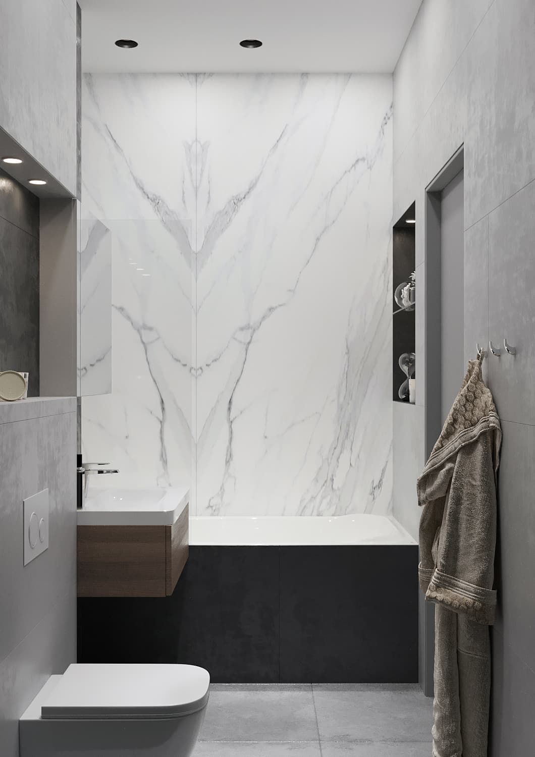 В данном дизайн-проекте для нашего клиента, холостого мужчины, мы сделали оригинальную рабочую зону и зону для отдыха в гостиной. Четкое зонирование пространства — характерная черта стиля «Современный лофт». Рабочая зона мягко «утопает» в естественном свете, благодаря правильному расположению стола рядом с окном. Створки шкафа графитового цвета имеют глянцевую поверхность. Данное функциональное решение добавило глубины пространству и сделала его более светлым за счёт отражения света. К слову, по центру шкафа располагаются полки с подсветкой, чтобы можно было поставить дорогой сердцу декор. При открытии створок шкафа внутри включается подсветка. Серо-бежевая цветовая палитра грамотно подчеркивает «мужскую доминанту» окружающего пространства. На стене с телевизором находятся панели под мрамор с хромированным рустом — легкий элемент изысканности.