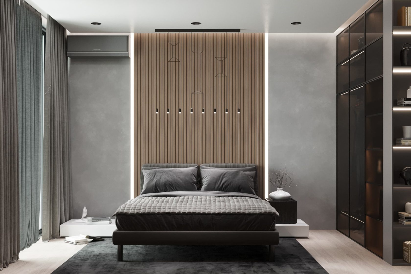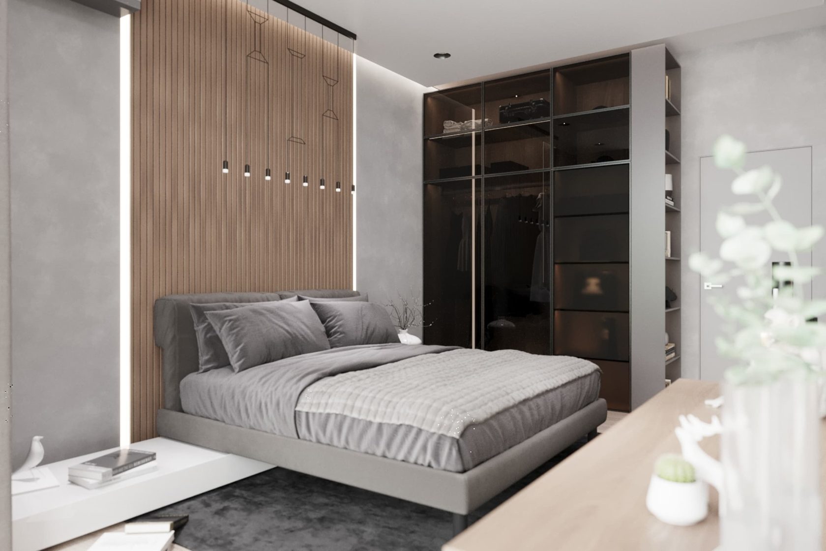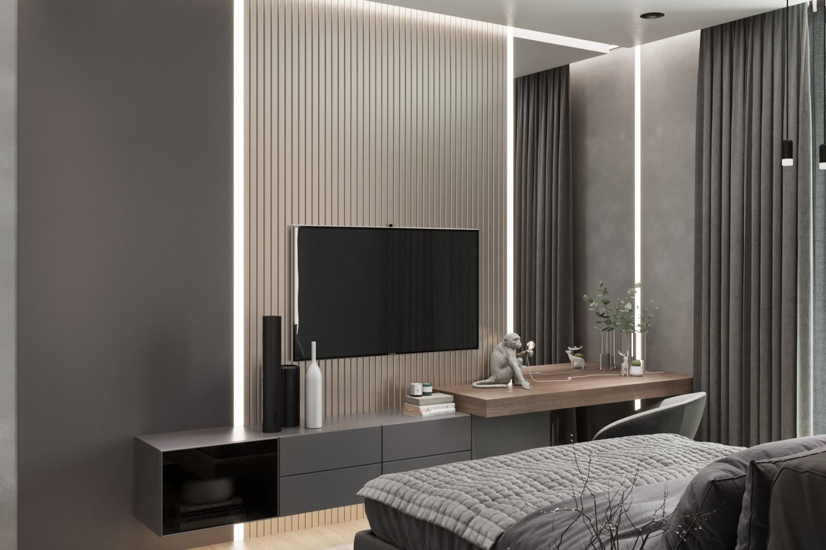 В спальне для туалетного столика дополнительный свет дает оригинальная настольная лампа с обезьянкой — грамотная точка визуального притяжения. Стена с кроватью и стена с телевизором, расположенные друг напротив друга, выделены панелями с ламелями. В комнате было продумано сценарное освещение трех типов: верхние встроенные светильники в потолок, люстра и встроенная подсветка.