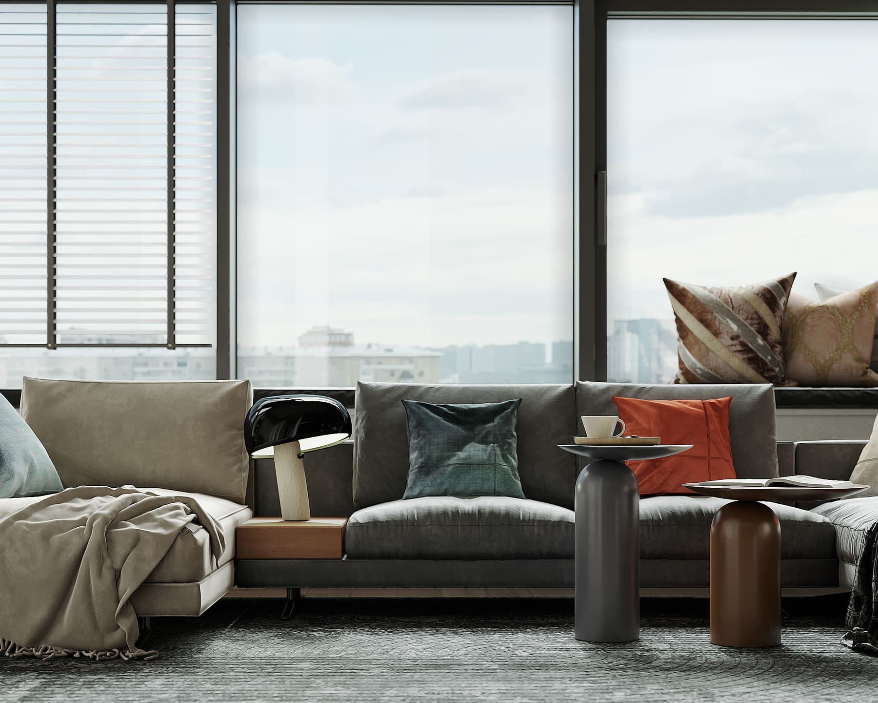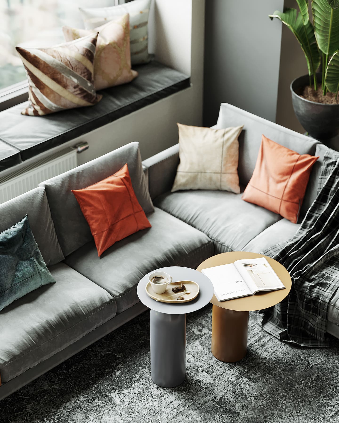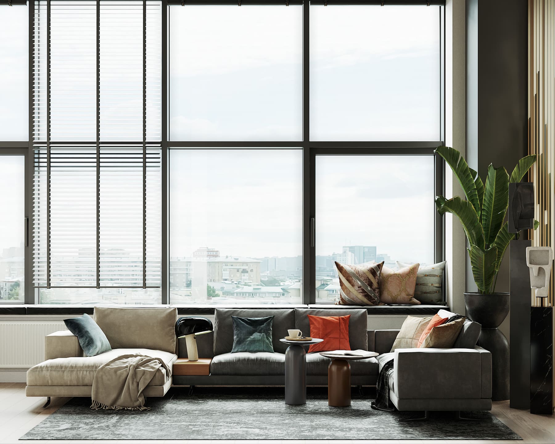 Огромные панорамные окна, стены, выполненные в светлой цветовой гамме, дали возможность всему пространству по-настоящему «задышать». Из окон апартаментов открывается незабываемый вид на старую Москву. Подчеркнуть эту сильную сторону мы решили за счёт широких подоконников и мягких пуфов — индивидуальная обзорная точка готова.