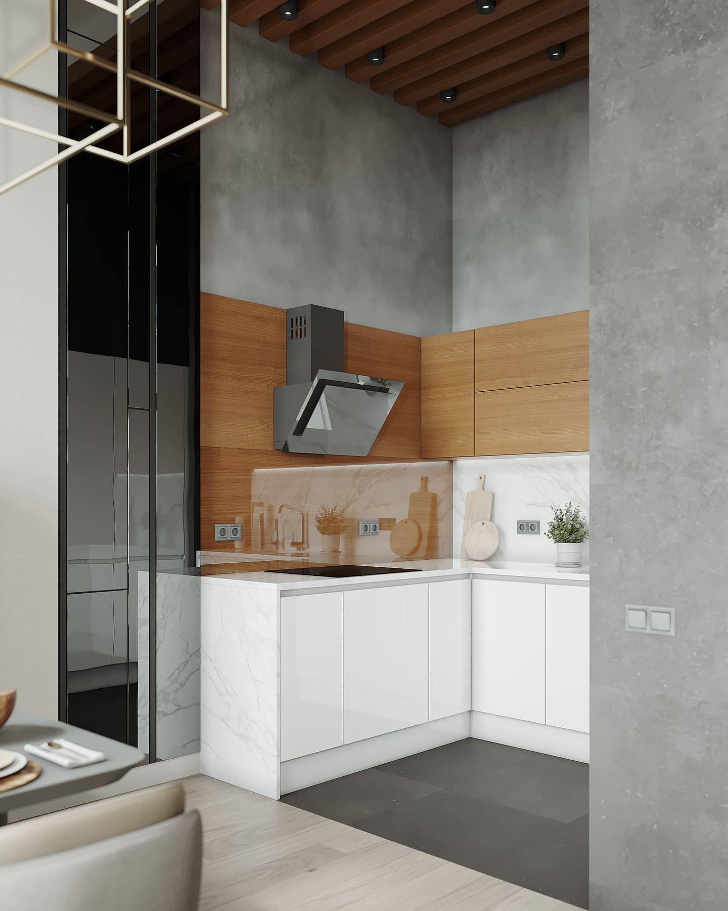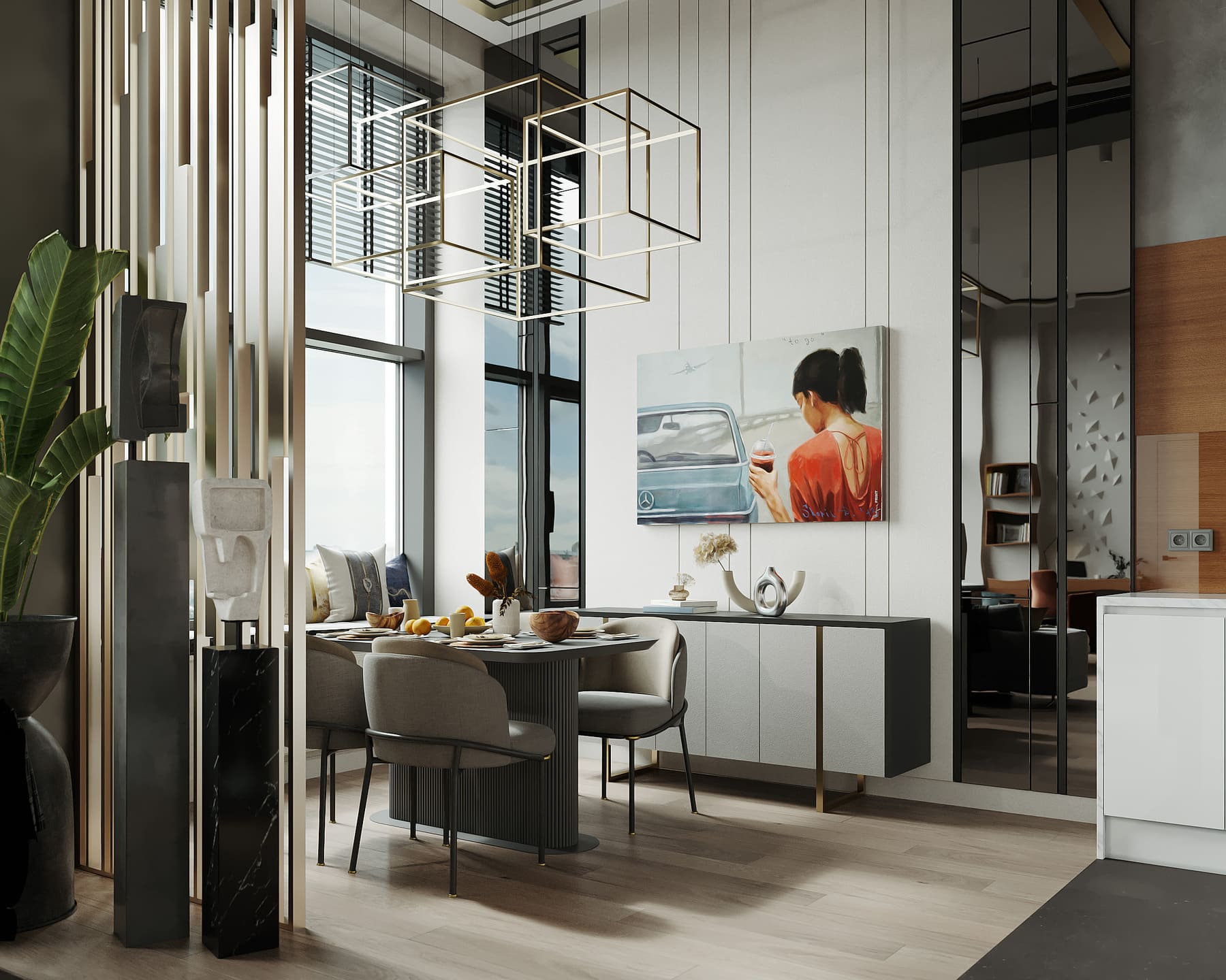 Повысить многофункциональность пространства удалось с помощью яркой декоративной перегородки с золотыми деталями. Она грамотно разделила апартаменты на несколько самодостаточных зон. Одна — гостиная с мягкой зоной, стильными светильниками-грибками, дизайнерскими столешницами, плазменным ТВ, встроенным в большую стену из керамогранита. Другая — кухня со светильниками-кубами, стильной арт-работой и минималистичной обеденной группой.