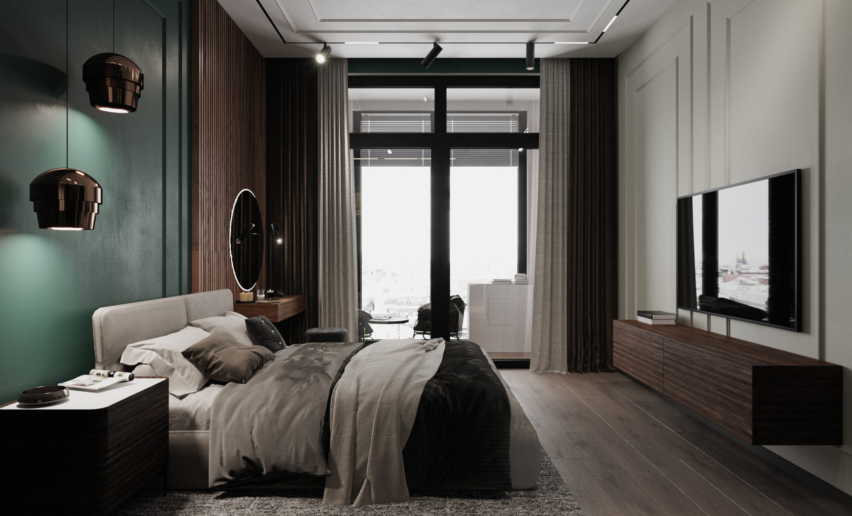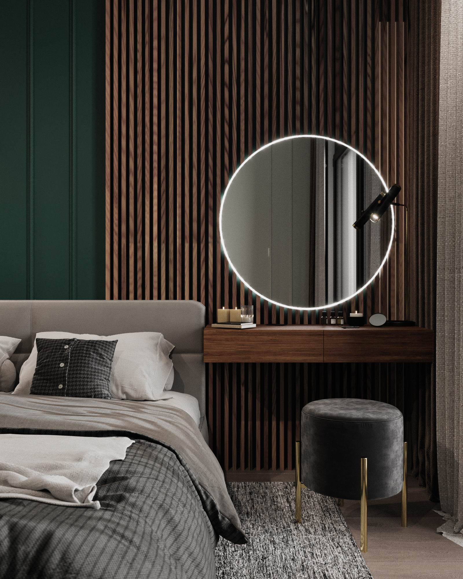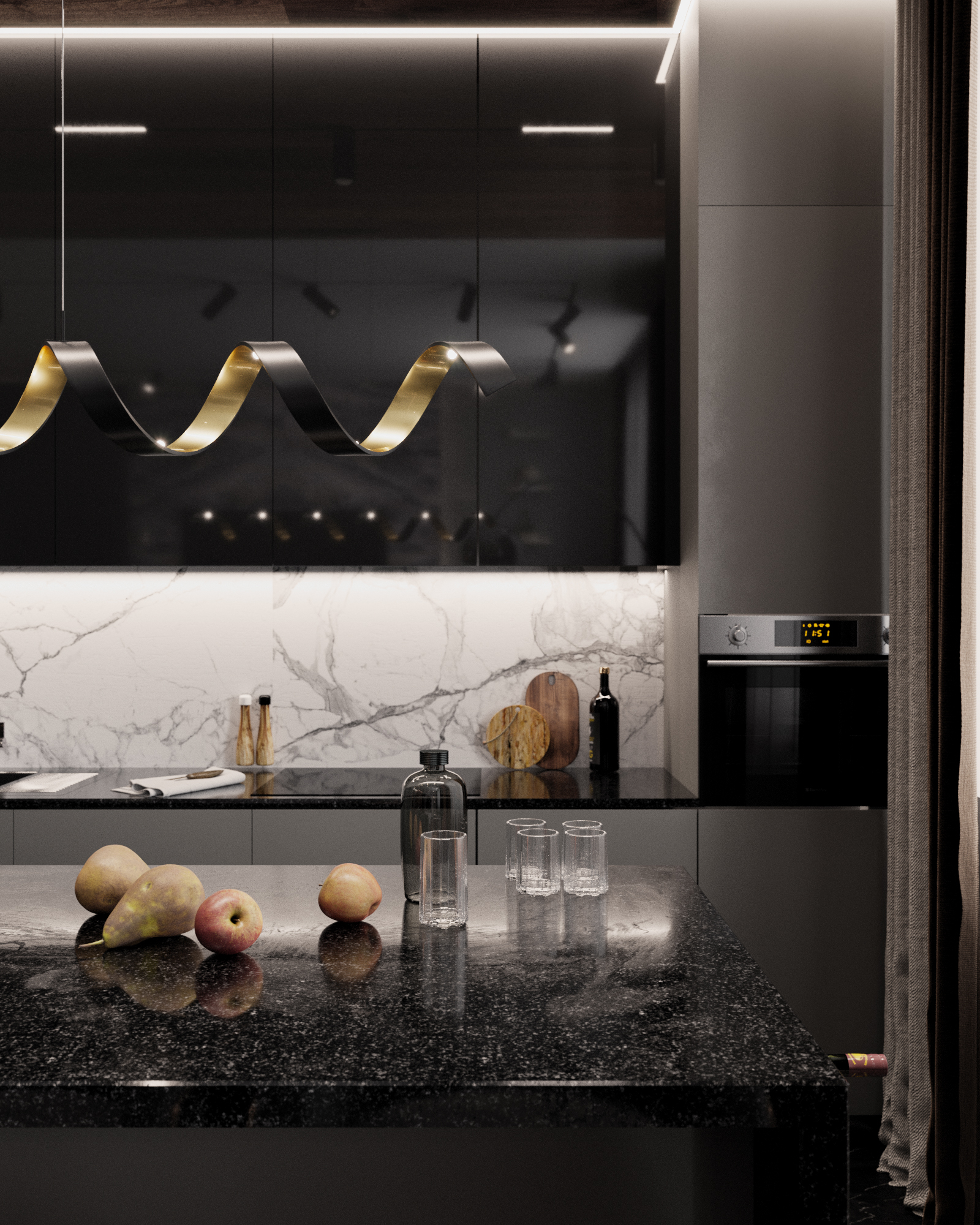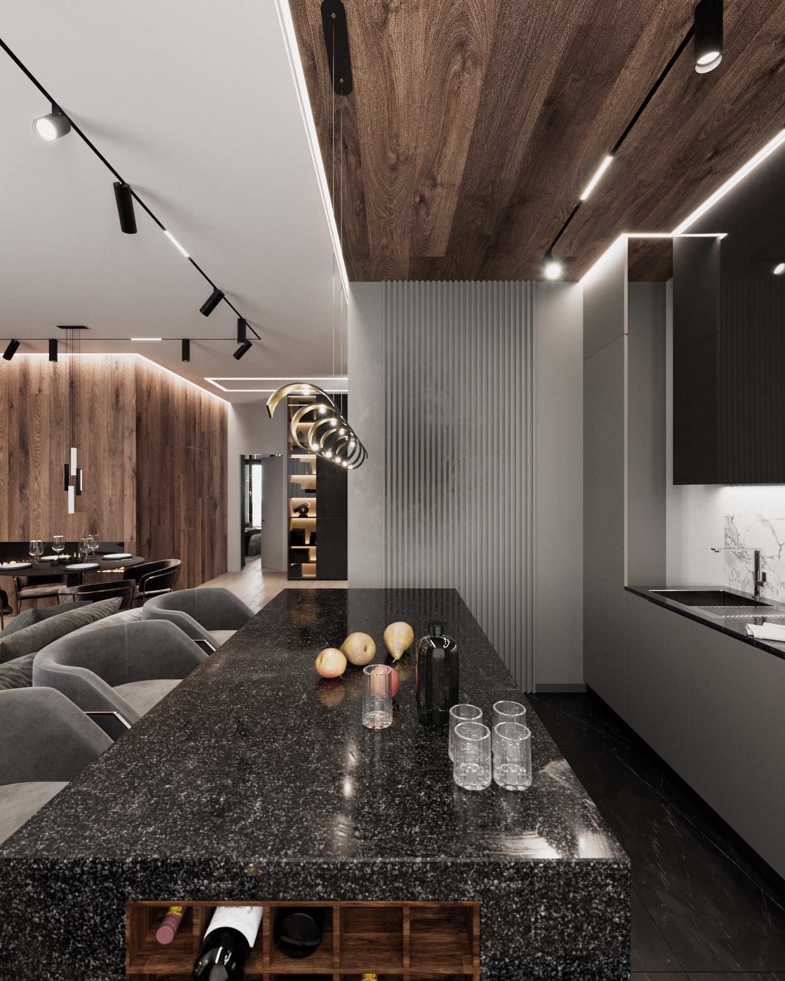Зона кухни, которая визуально выделена потолком с деревянными панелями, превращается в таинственную мастерскую благодаря дизайнерским подвесным светильникам Odeon Light, которые напоминают замысловатую спираль или даже золотистую стружку. А в гостиной и спальне общее на трековых поворотных светильниках освещение создаёт камерность и позволяет сделать точные акценты в интерьере. Общую атмосферу продуманной до мелочей роскоши и выверенности стиля интерьера создают вкрапления натуральных материалов — дерева и мрамора. Кроме того, текстиль гармонично дополняет теплыми оттенками и фактурами, придает интерьеру шик и обволакивает уютными формами мягкой мебели.