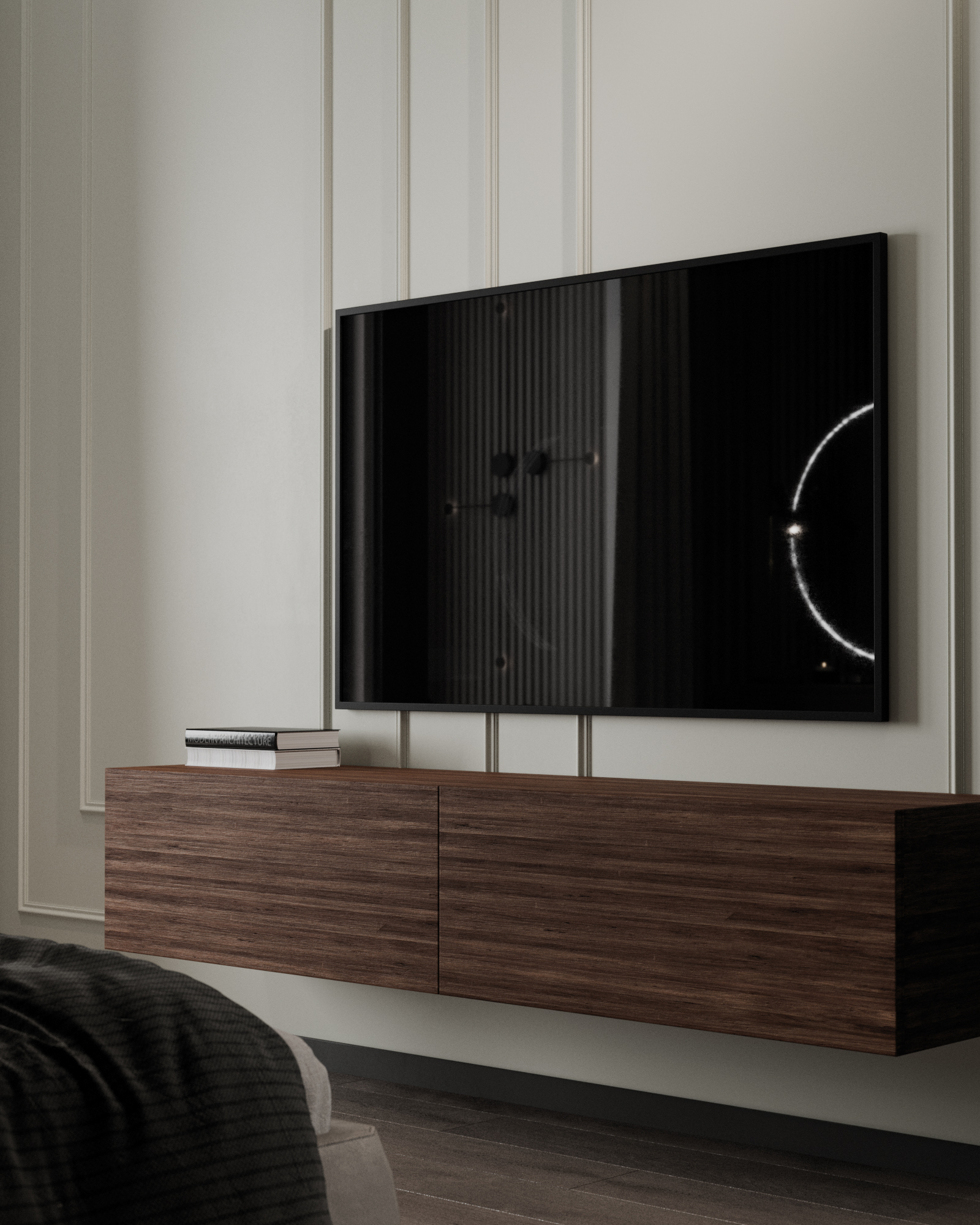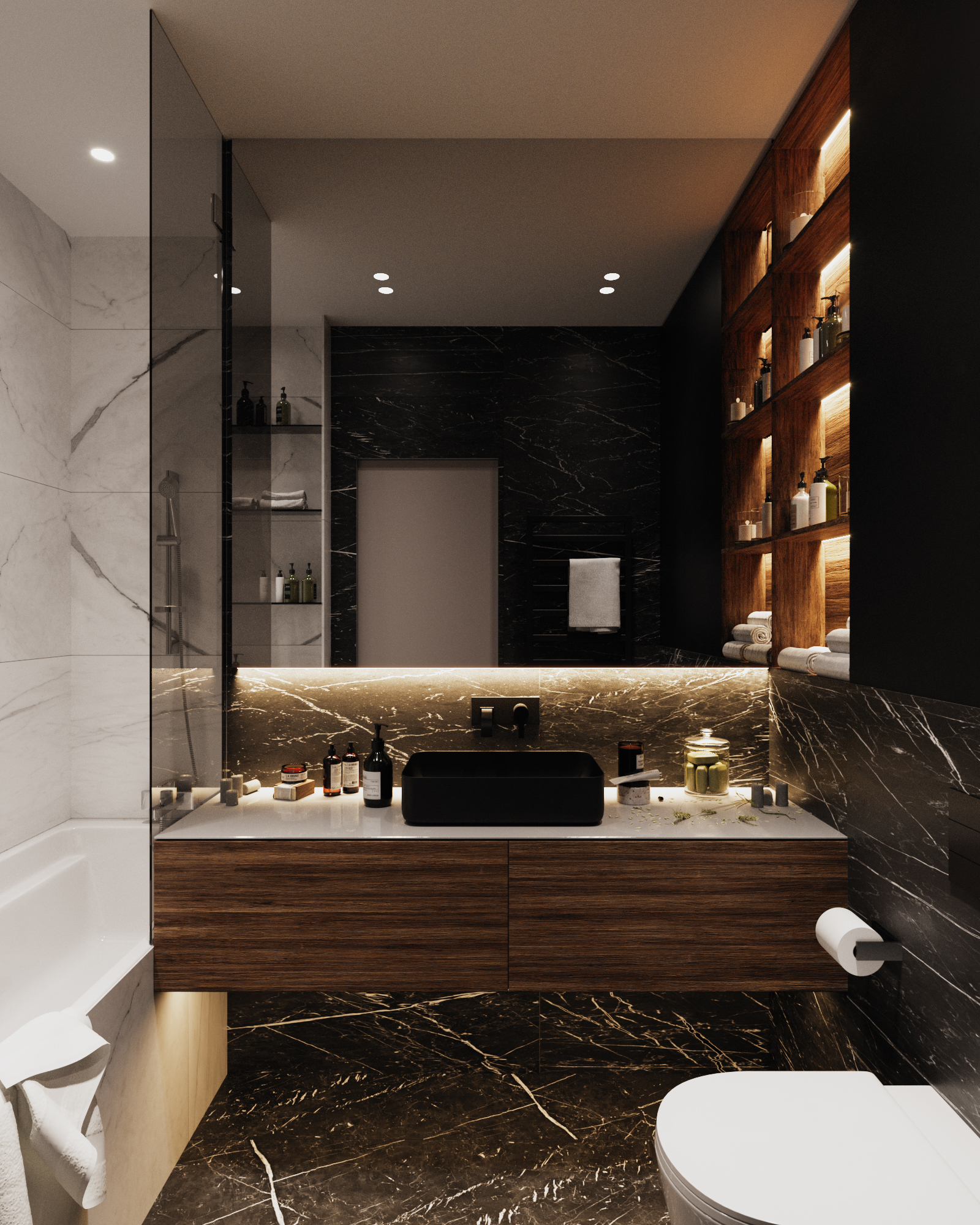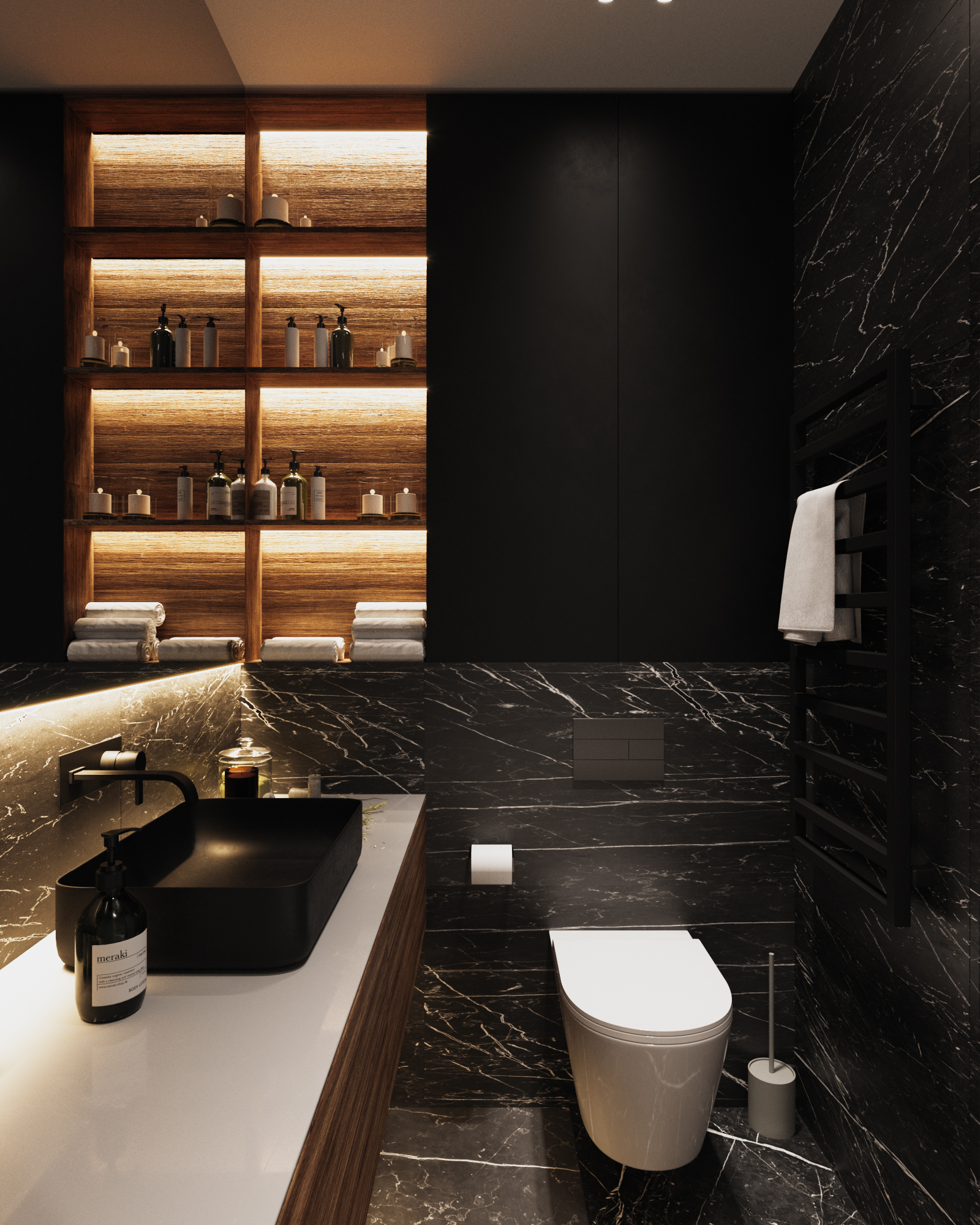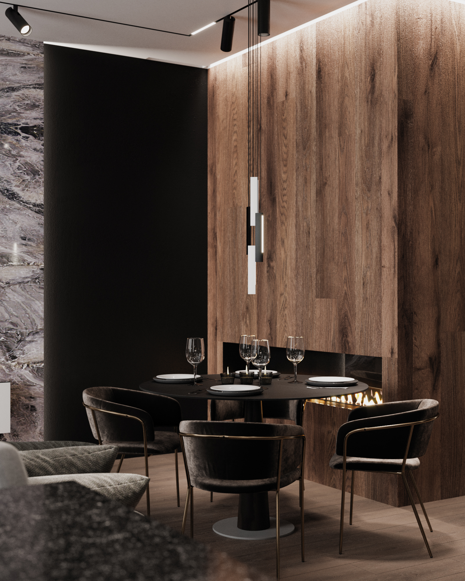 Оригинальное освещение добавляет нотки таинственности, некой интимности пространству. При этом теплая струящаяся подсветка, встроенная в настенные панели, придает мягкий свет и позволяет избегать неуместной мрачности. Дополнительное ощущение погруженности в атмосферу уюта и комфорта придаёт стильный биокамин в зале.