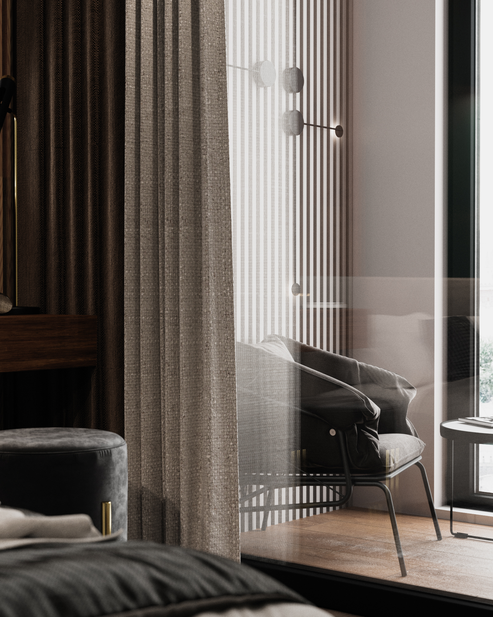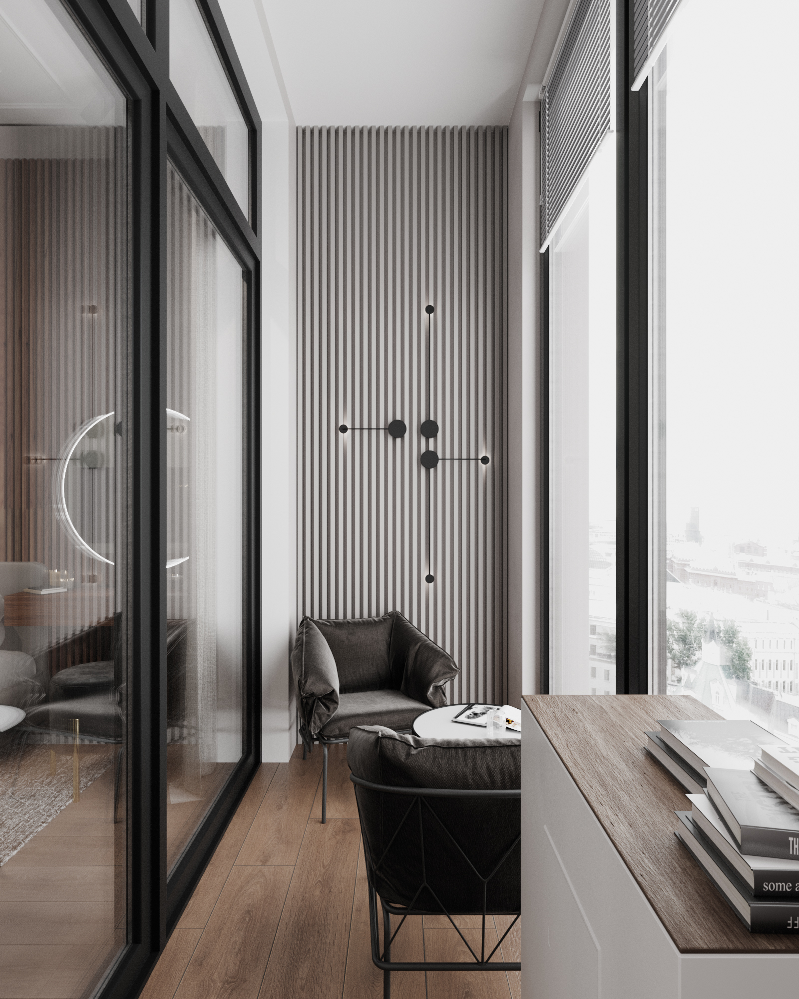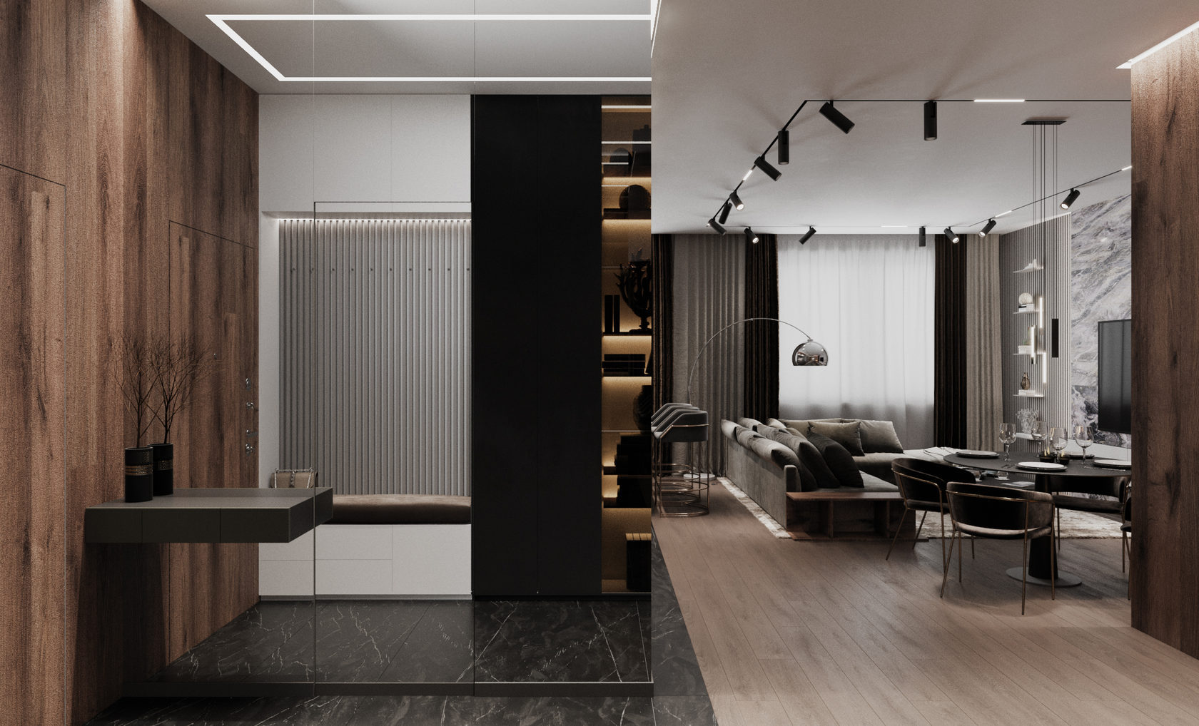 50 оттенков темного — это не только про популярную книгу и её экранизацию. Это ещё и уникальный дизайнерский подход, способный сформировать яркий образ жилого пространства, используя лишь монохромную гамму. В данном проекте двухкомнатной квартиры для молодой пары были использованы необычные цветовые решения, которые подчеркнули индивидуальность хозяев. Совмещенная с прихожей и кухней гостиная переливается то угольно-черным, то насыщенно-серым или темно-шоколадным.