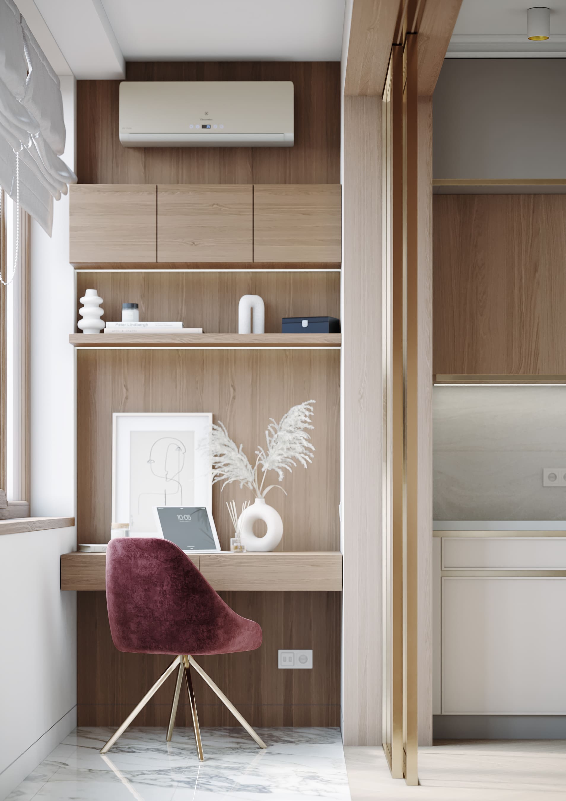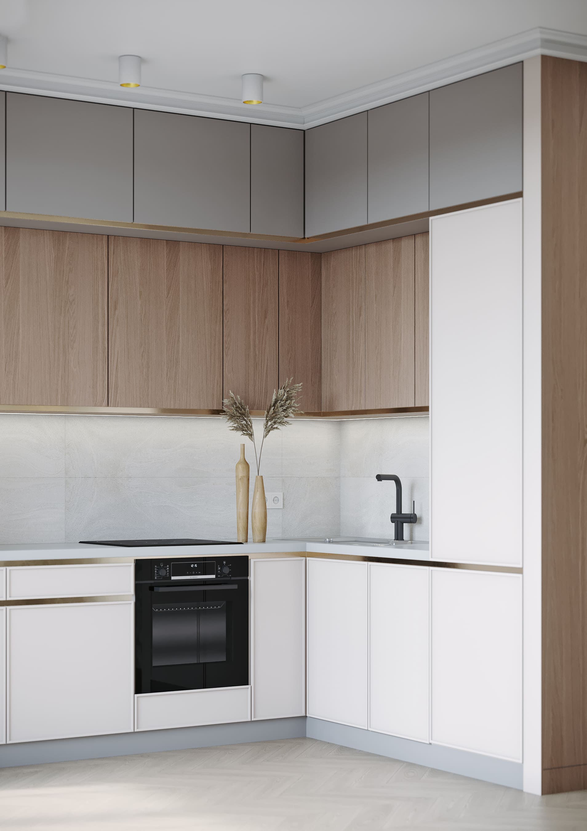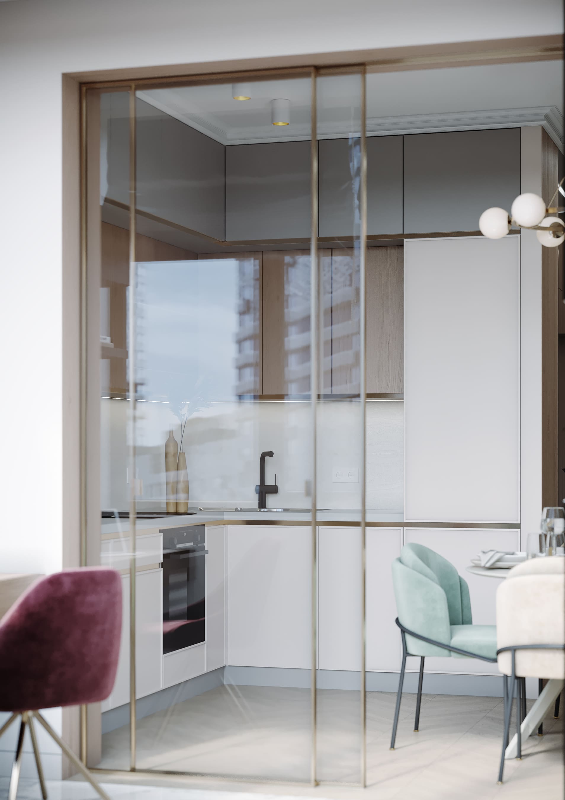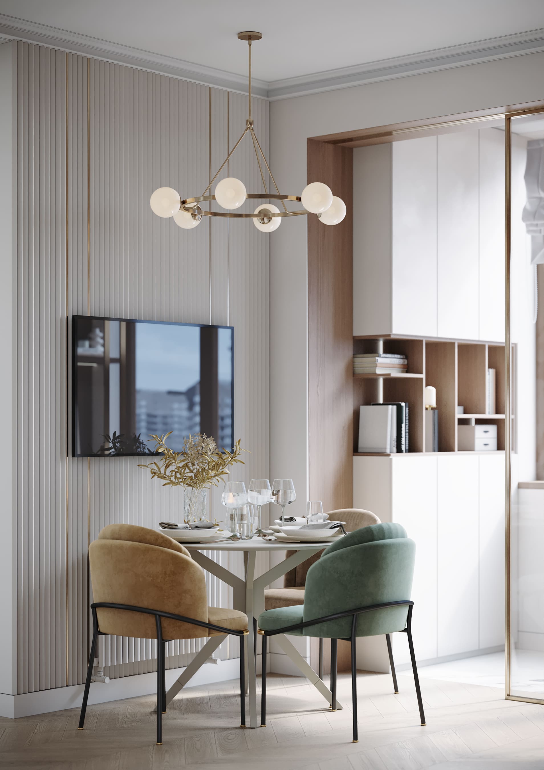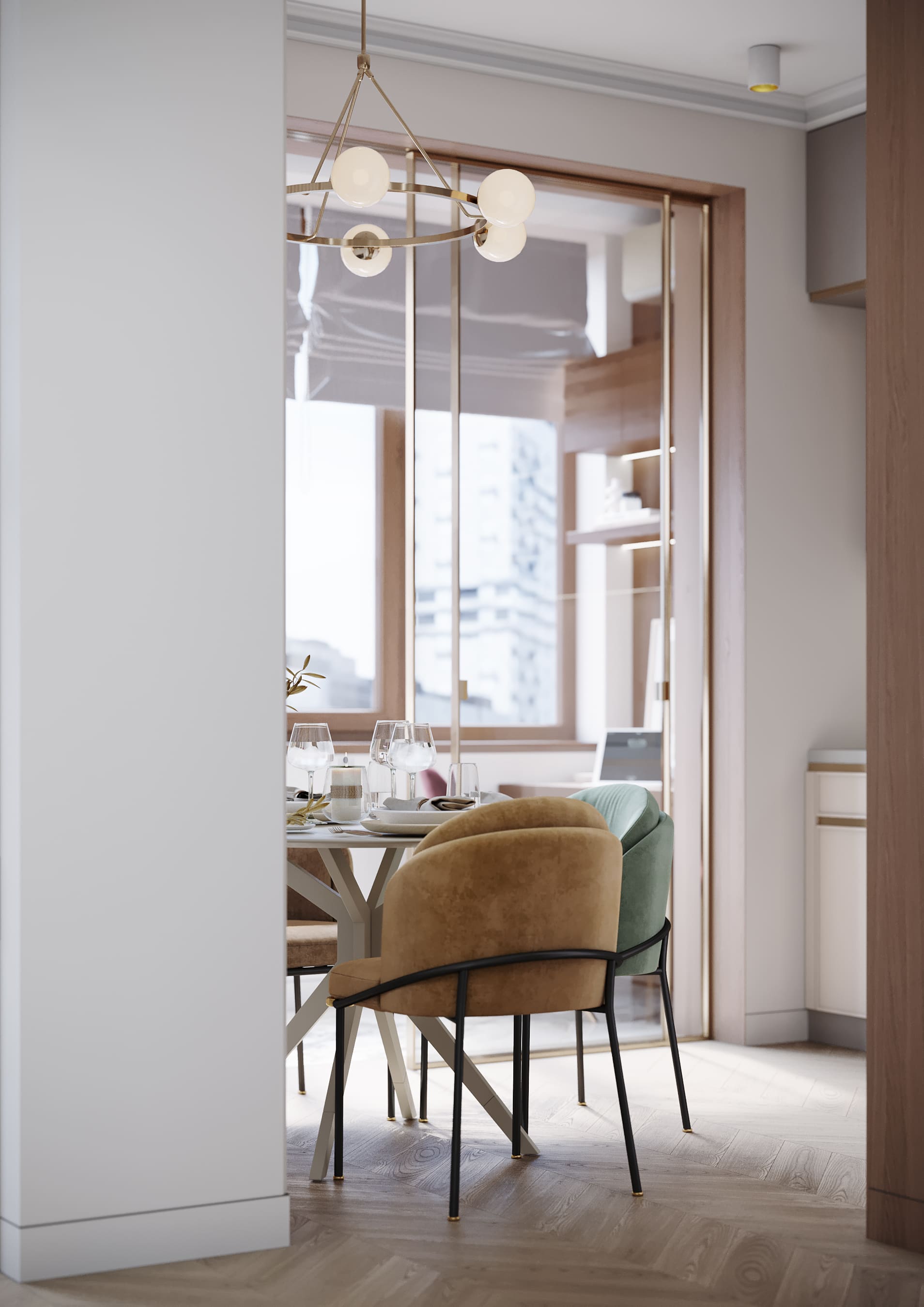 Уютное гнездышко для молодой пары, с изолированной спальней и гостиной на 38 кв.м. На кухне утеплили балкон, удалив подоконные блоки. Идеальное пространство для кабинета, помещение изолировано французской раздвижной перегородкой. Паркет «французская елочка» ассоциируется с роскошью французских квартир в Париже, добавляет изюминку в интерьер. Доска по диагонали расширяет зрительно пространство.