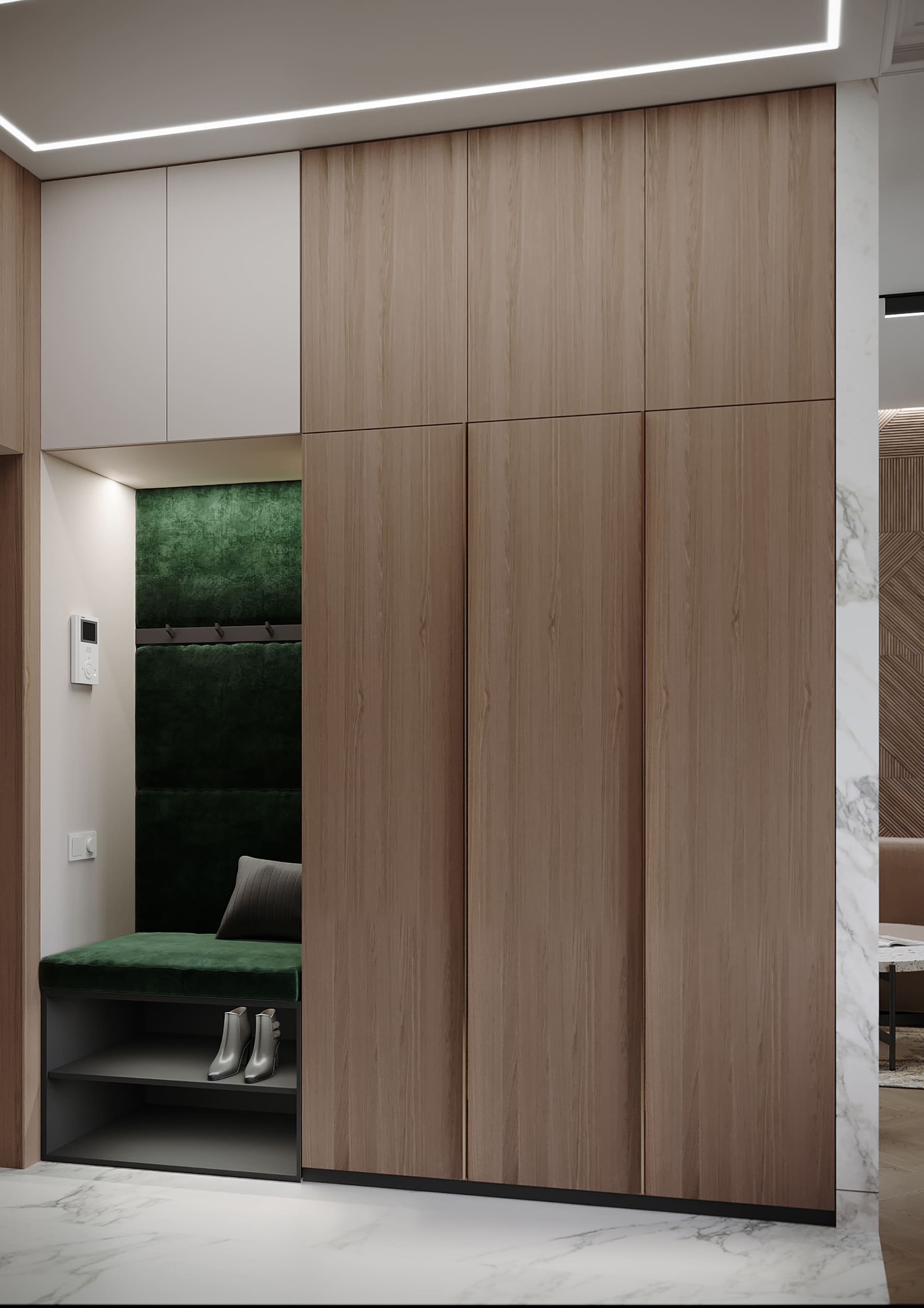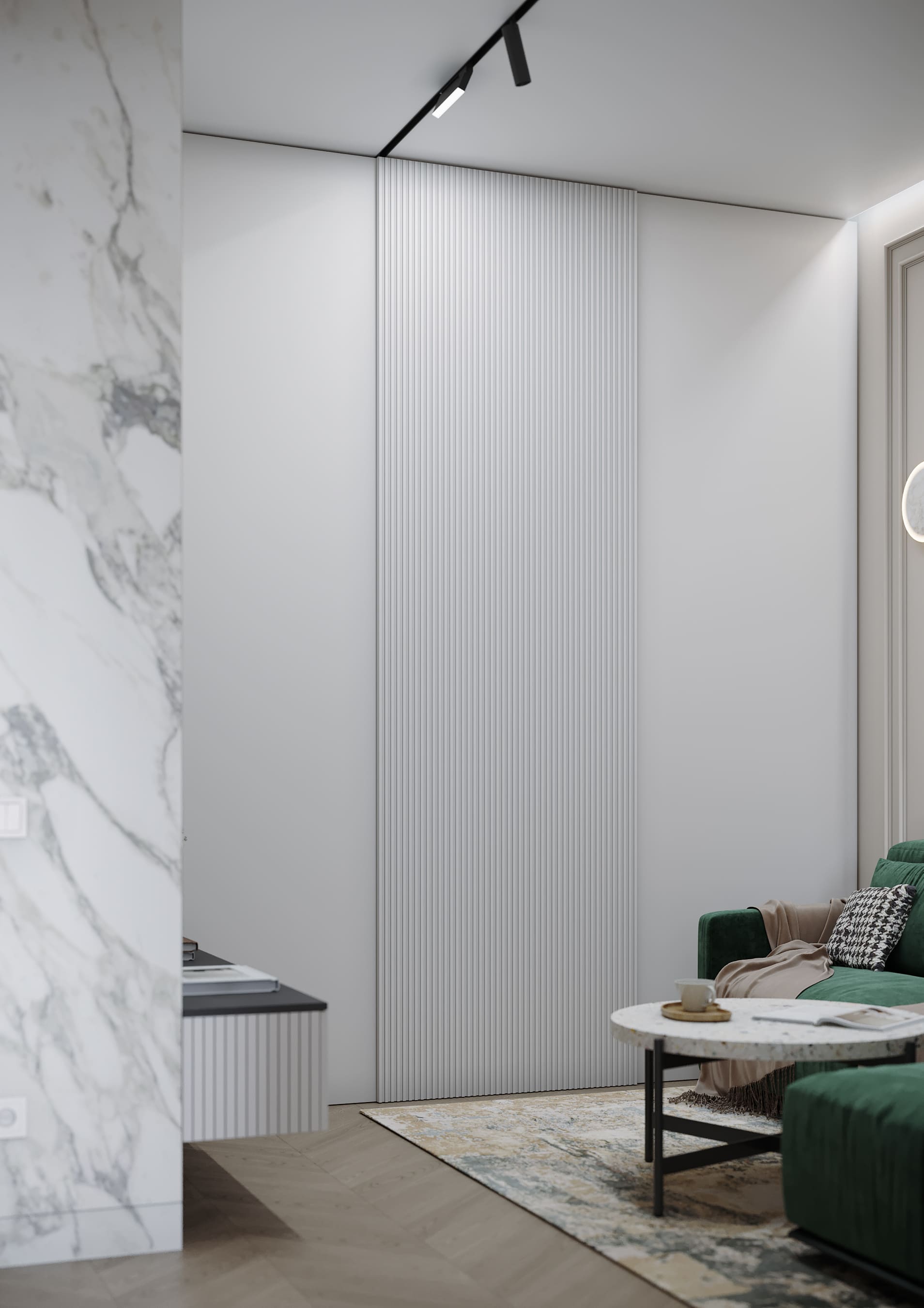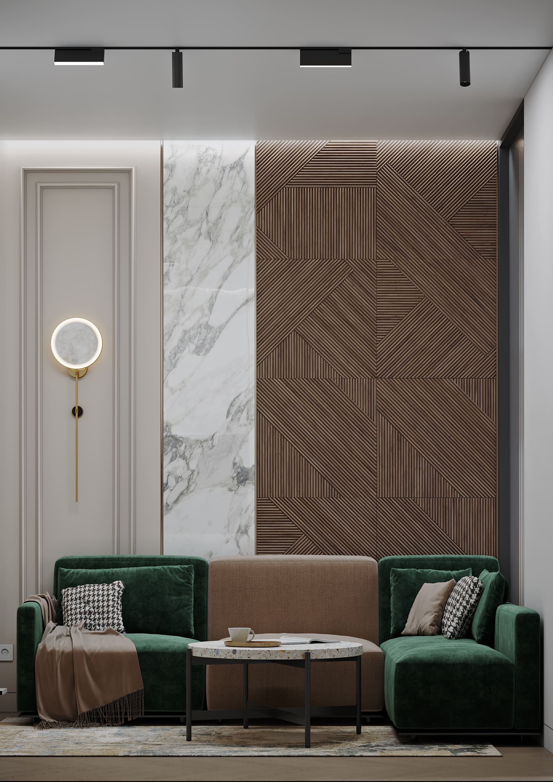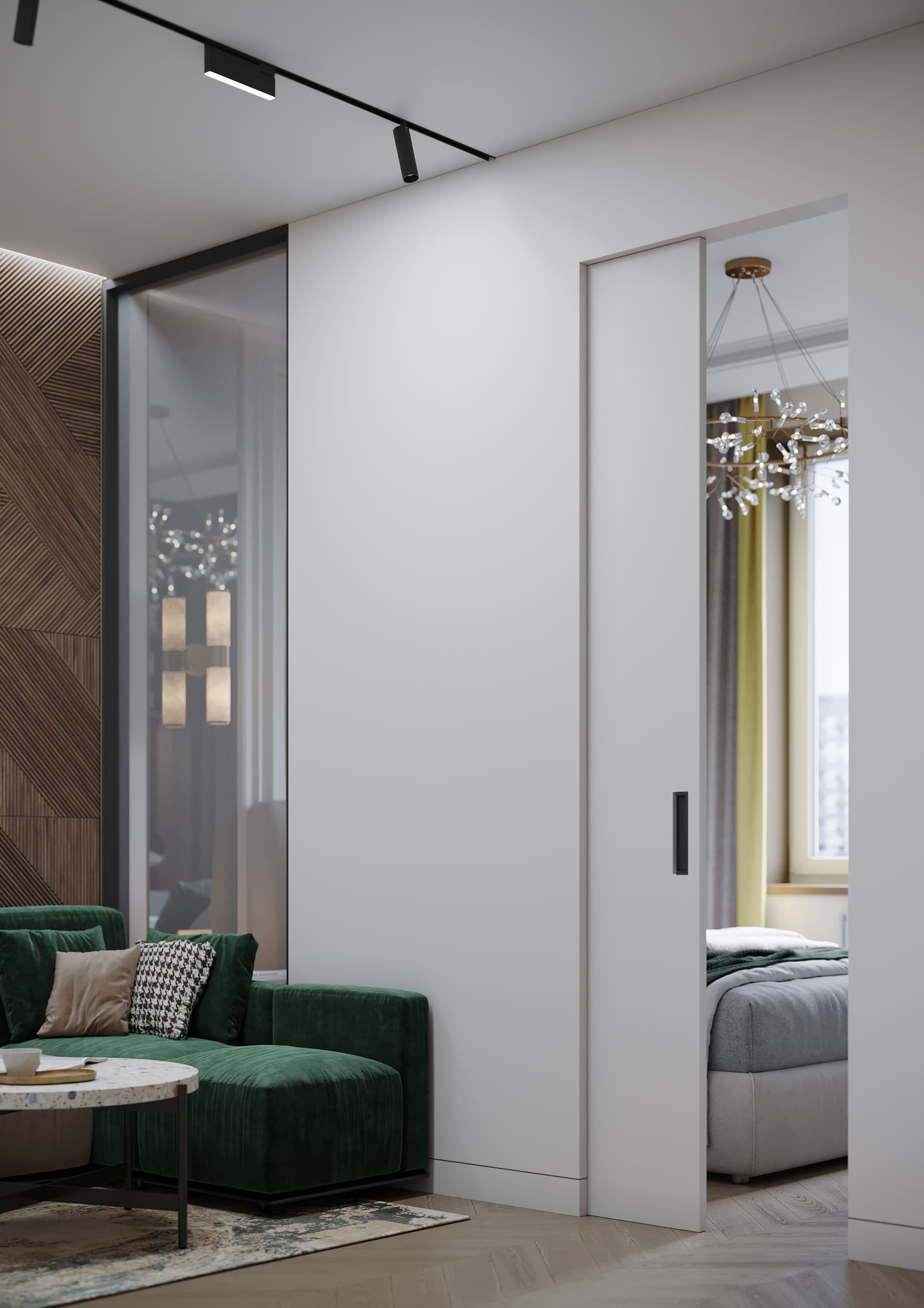 Пространство гостиной освещено трековым светильником, линия которого соединяется со створками, также внутри ниши подсветка декоративной стены. Насыщенный изумрудный цвет дивана с капучино и подушек с гусиной лапкой -стильный акцент в интерьере.