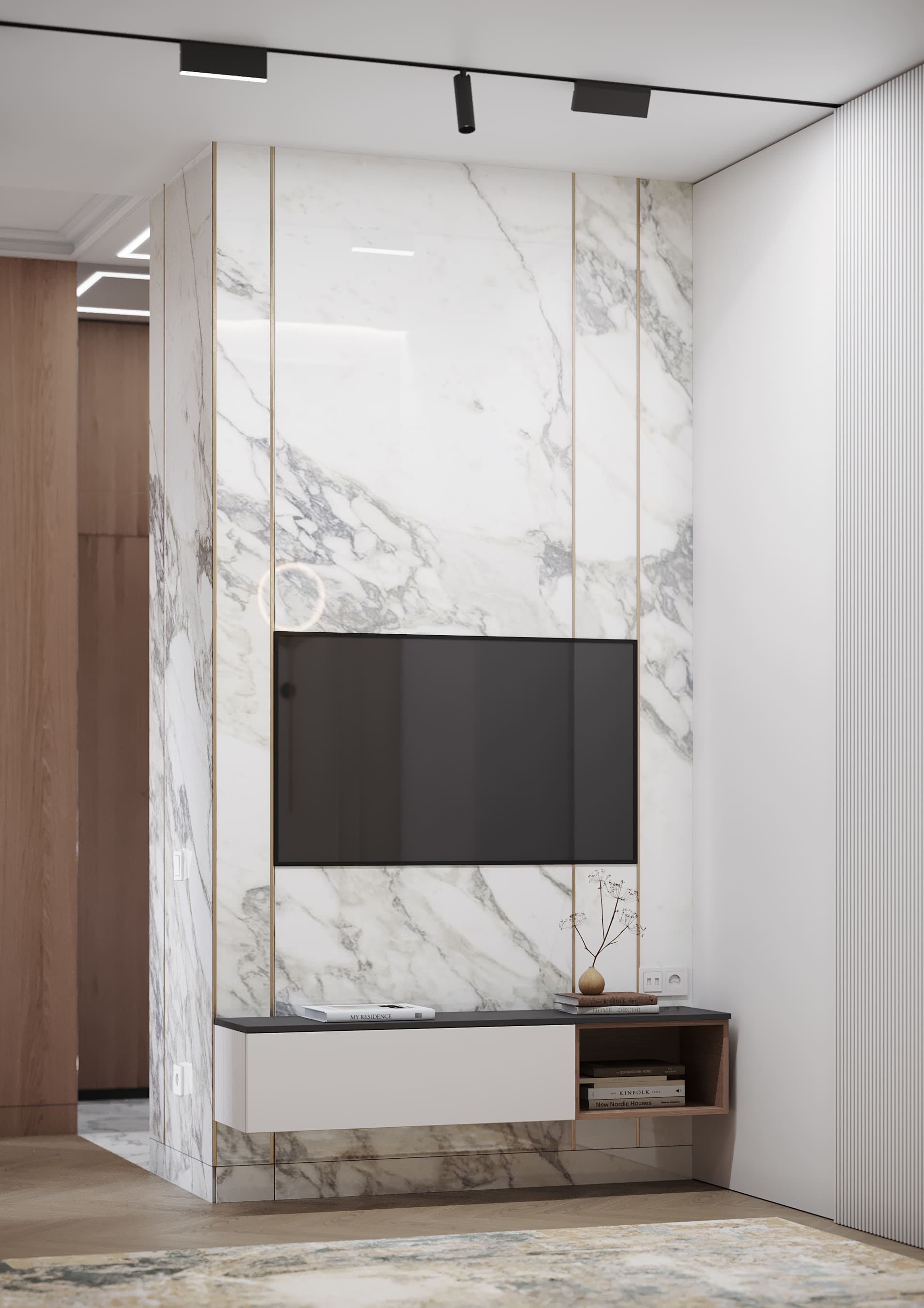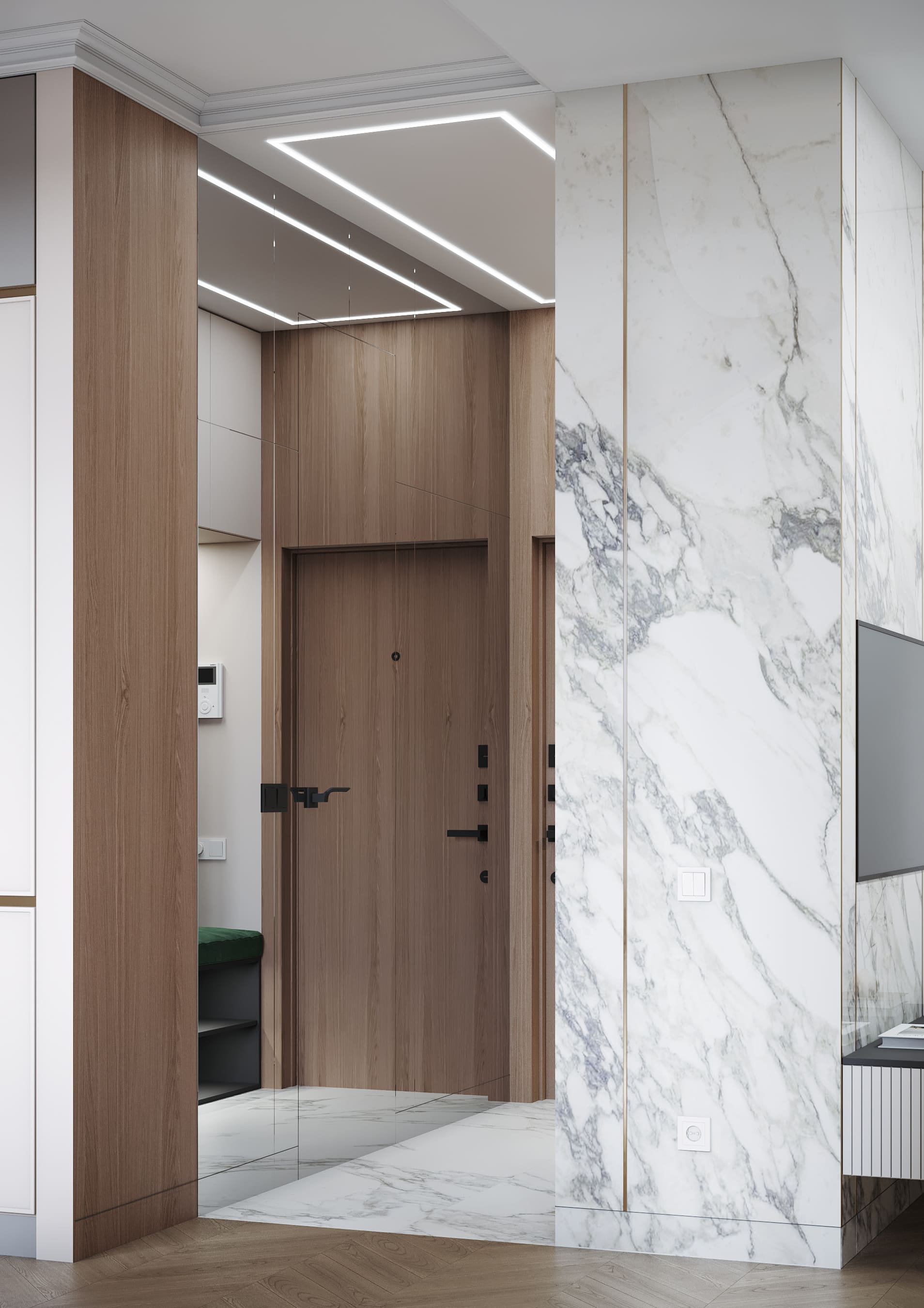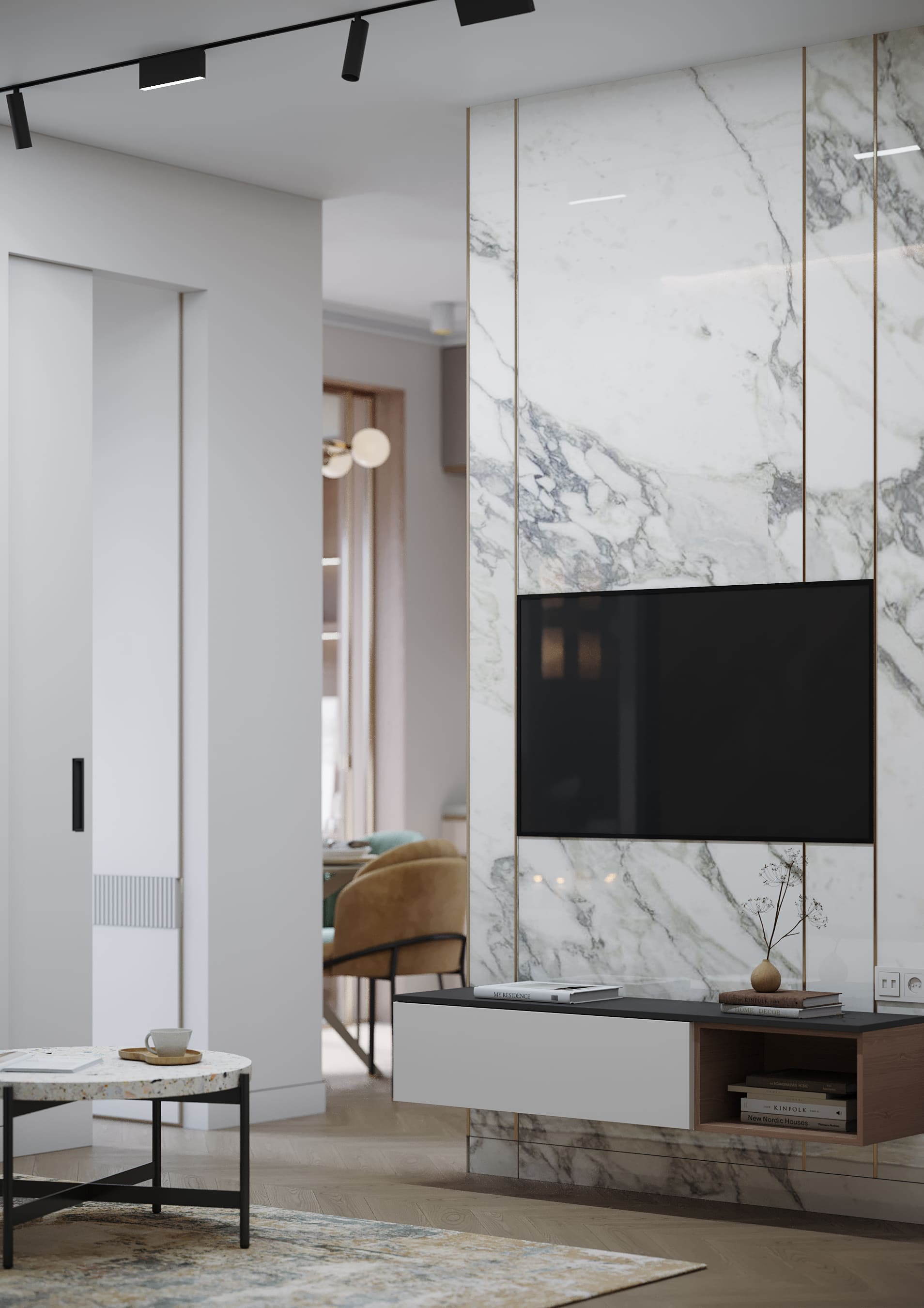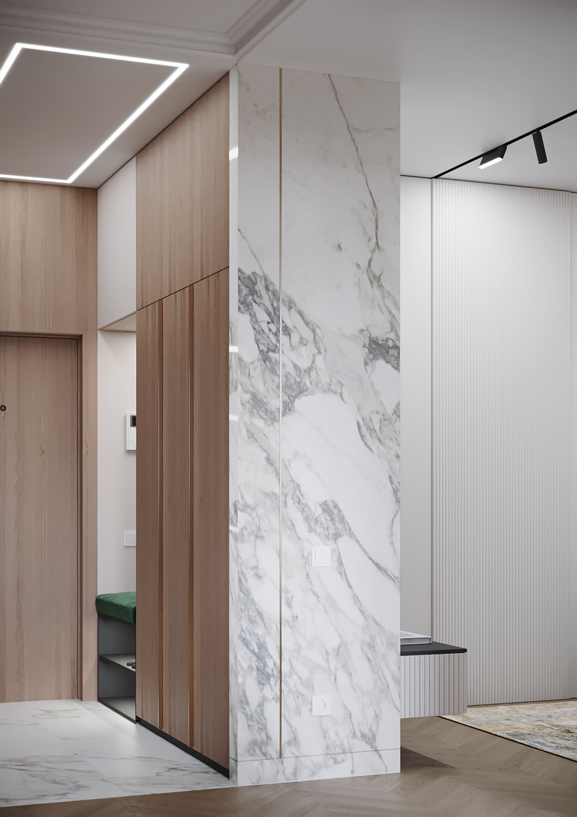 Пространство гостиной освещено трековым светильником, линия которого соединяется со створками, также внутри ниши подсветка декоративной стены. Насыщенный изумрудный цвет дивана с капучино и подушек с гусиной лапкой -стильный акцент в интерьере.