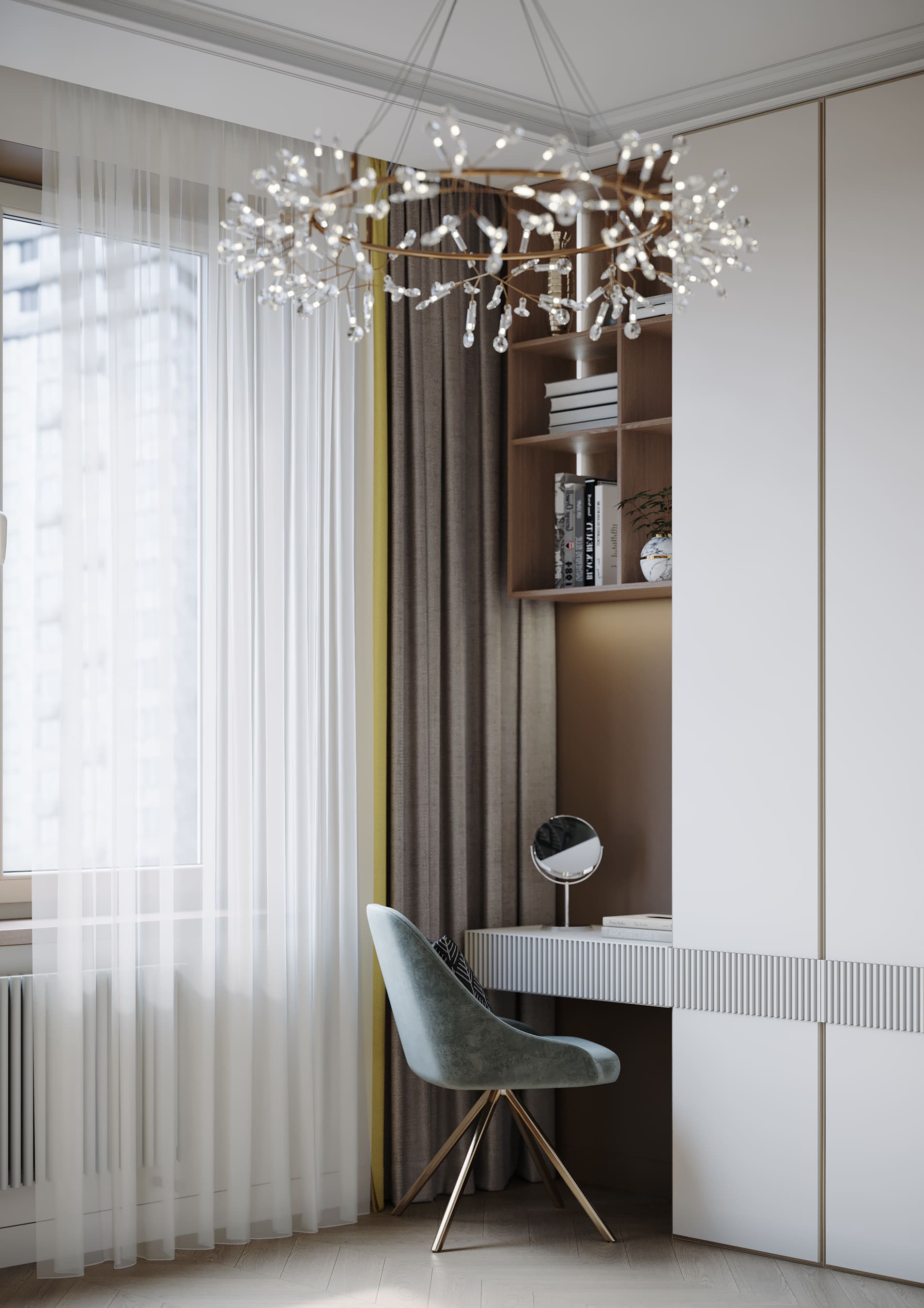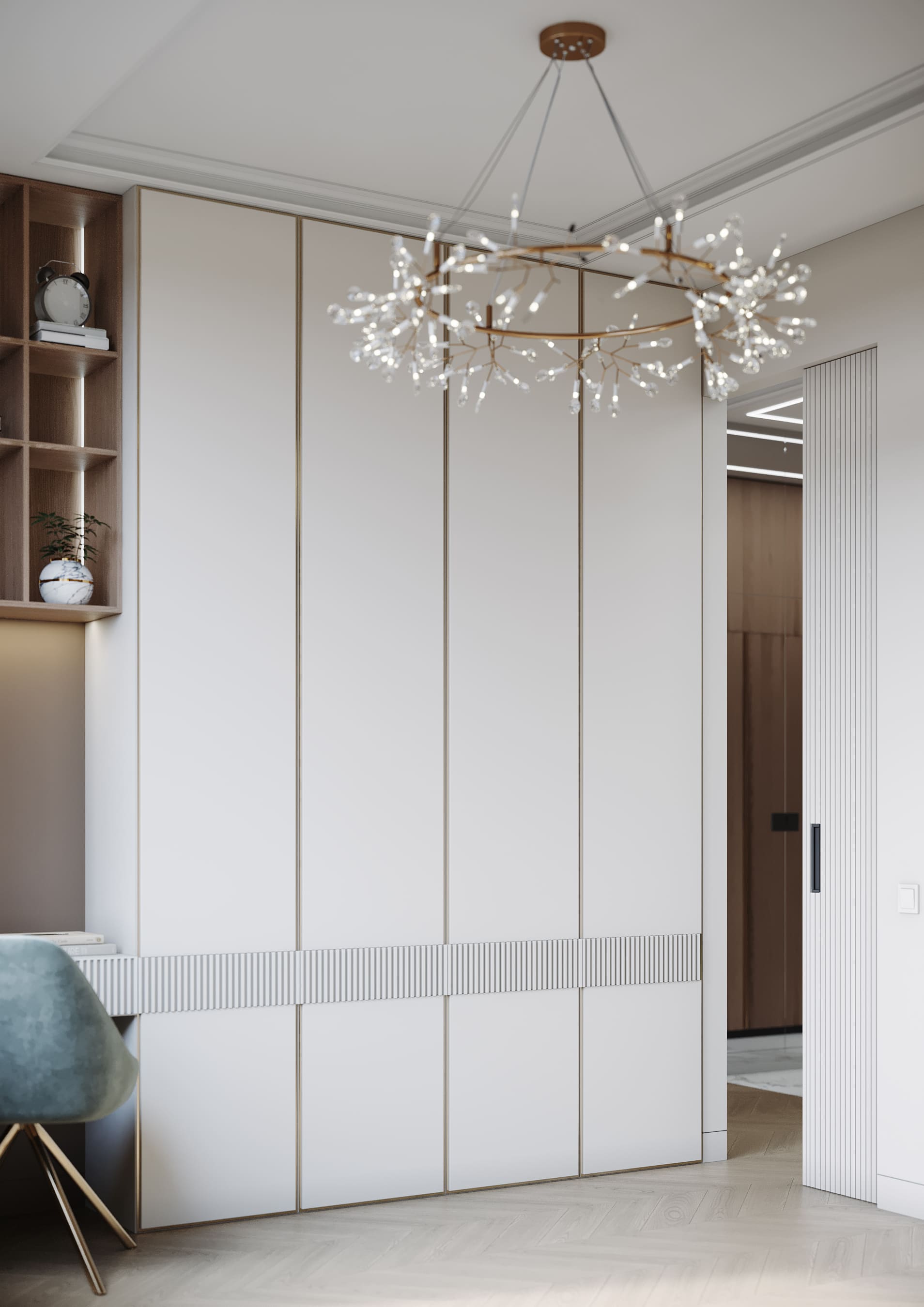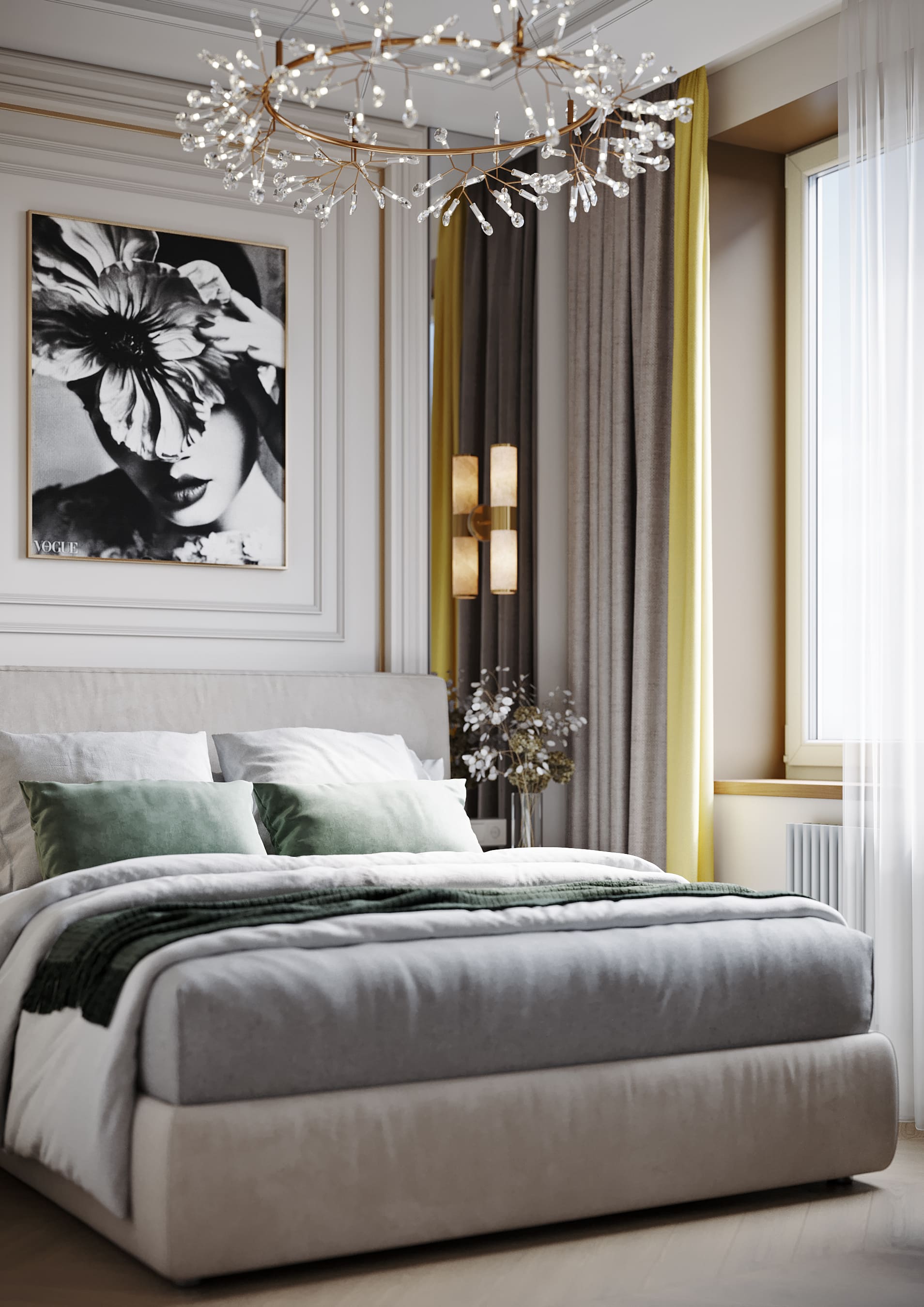 В спальне стена с изголовьем украшена рельефными и латунными молдингами, зеркала зрительно расширяют пространство, бра с алебастром в отражении дает больше света.