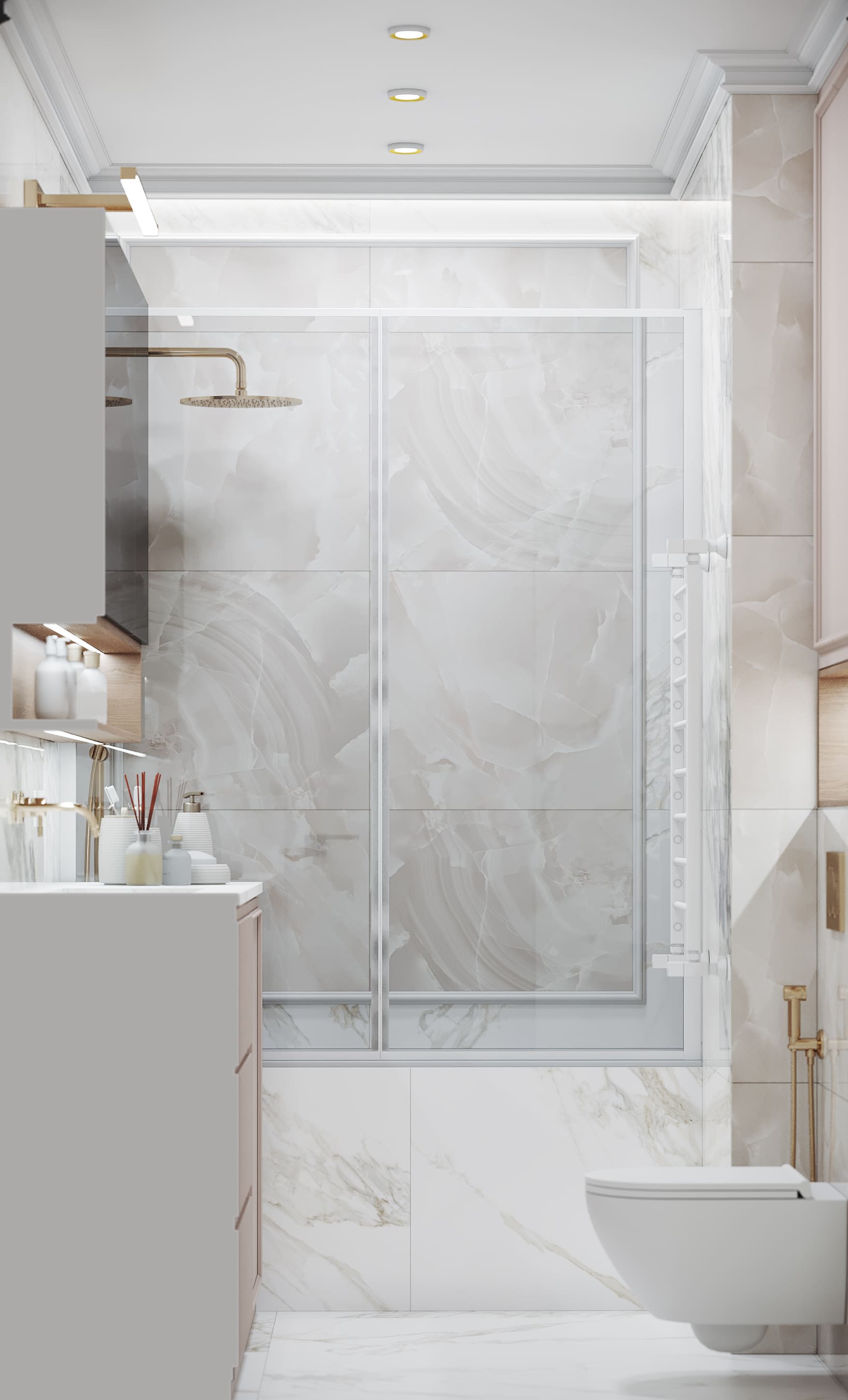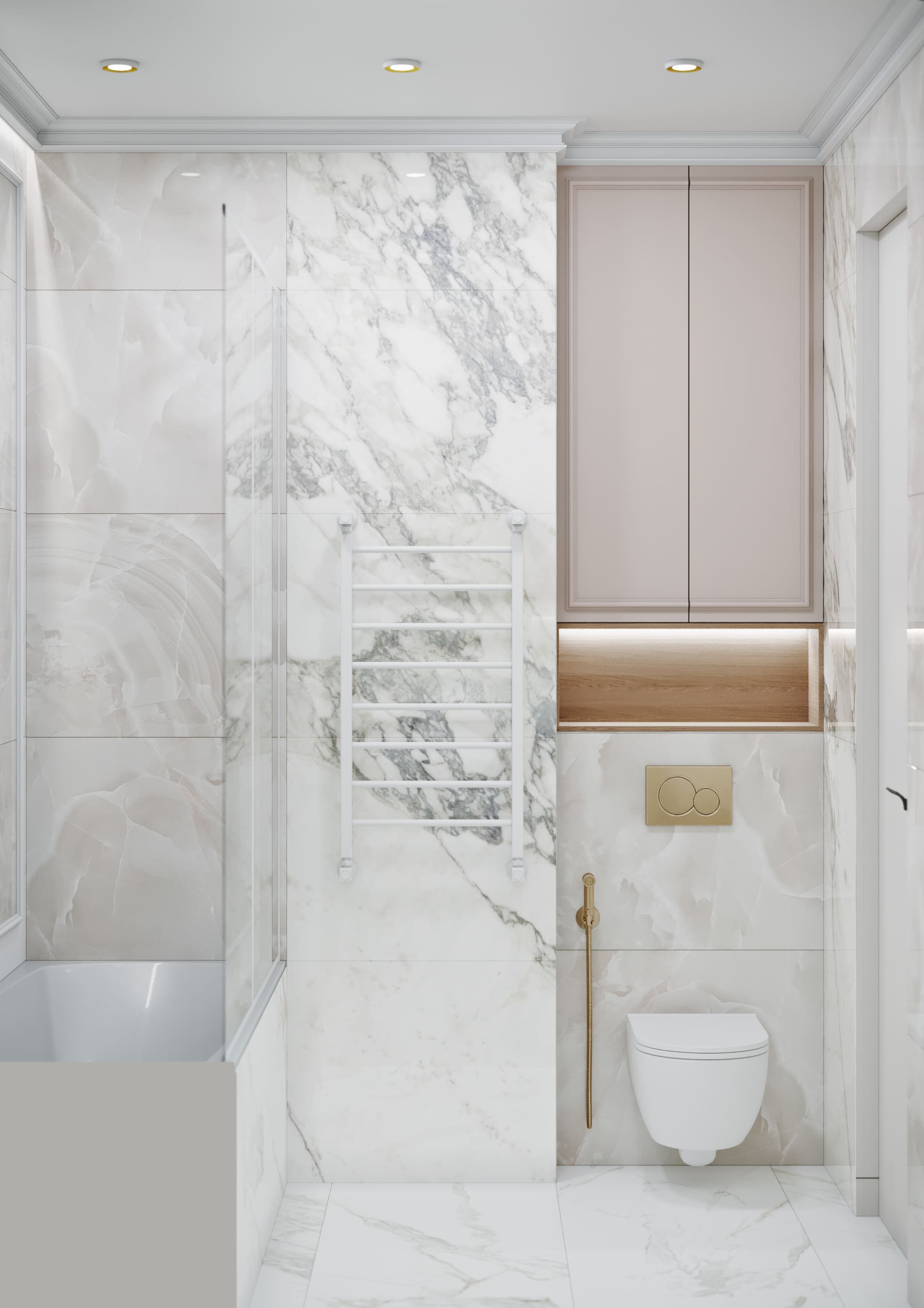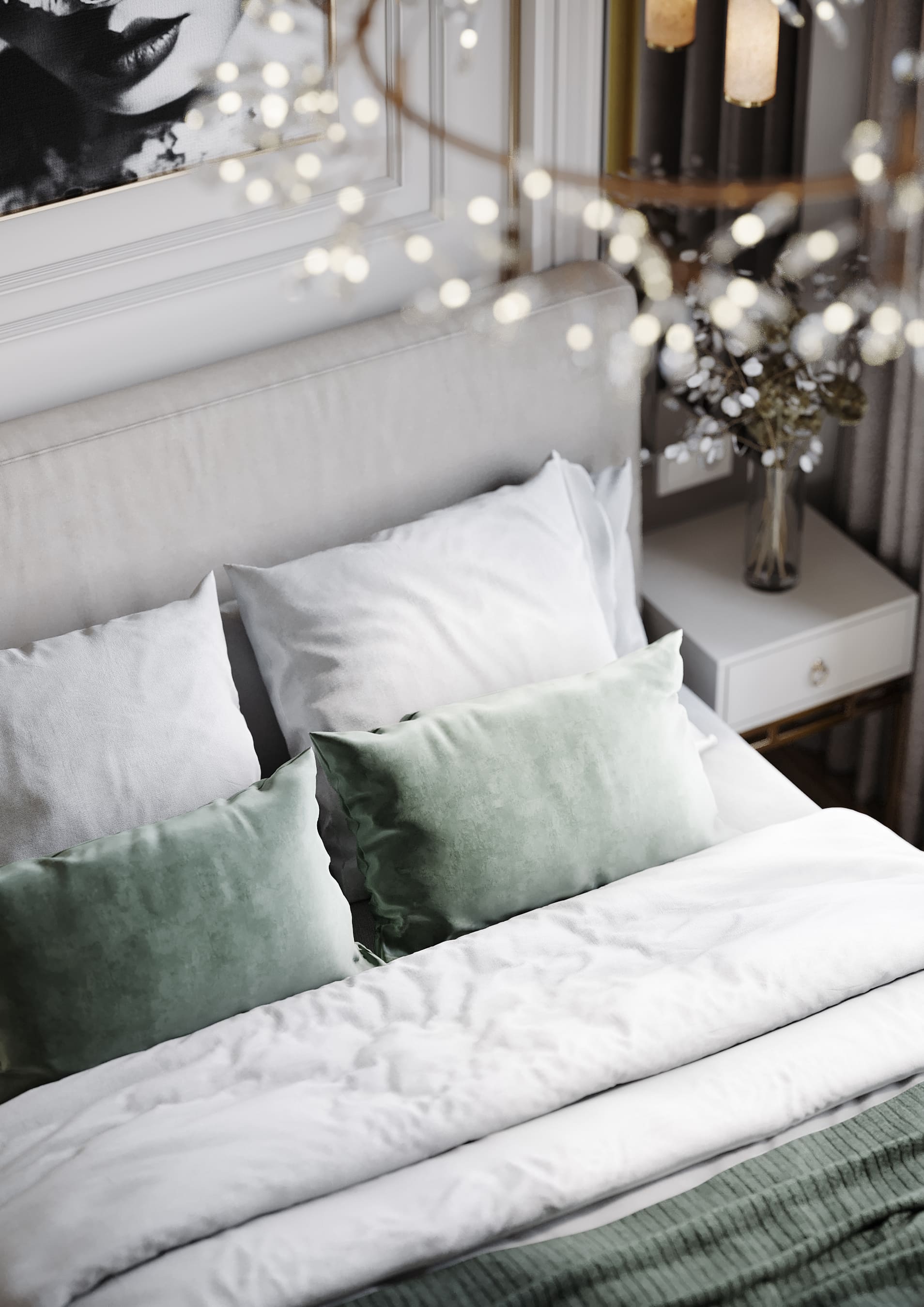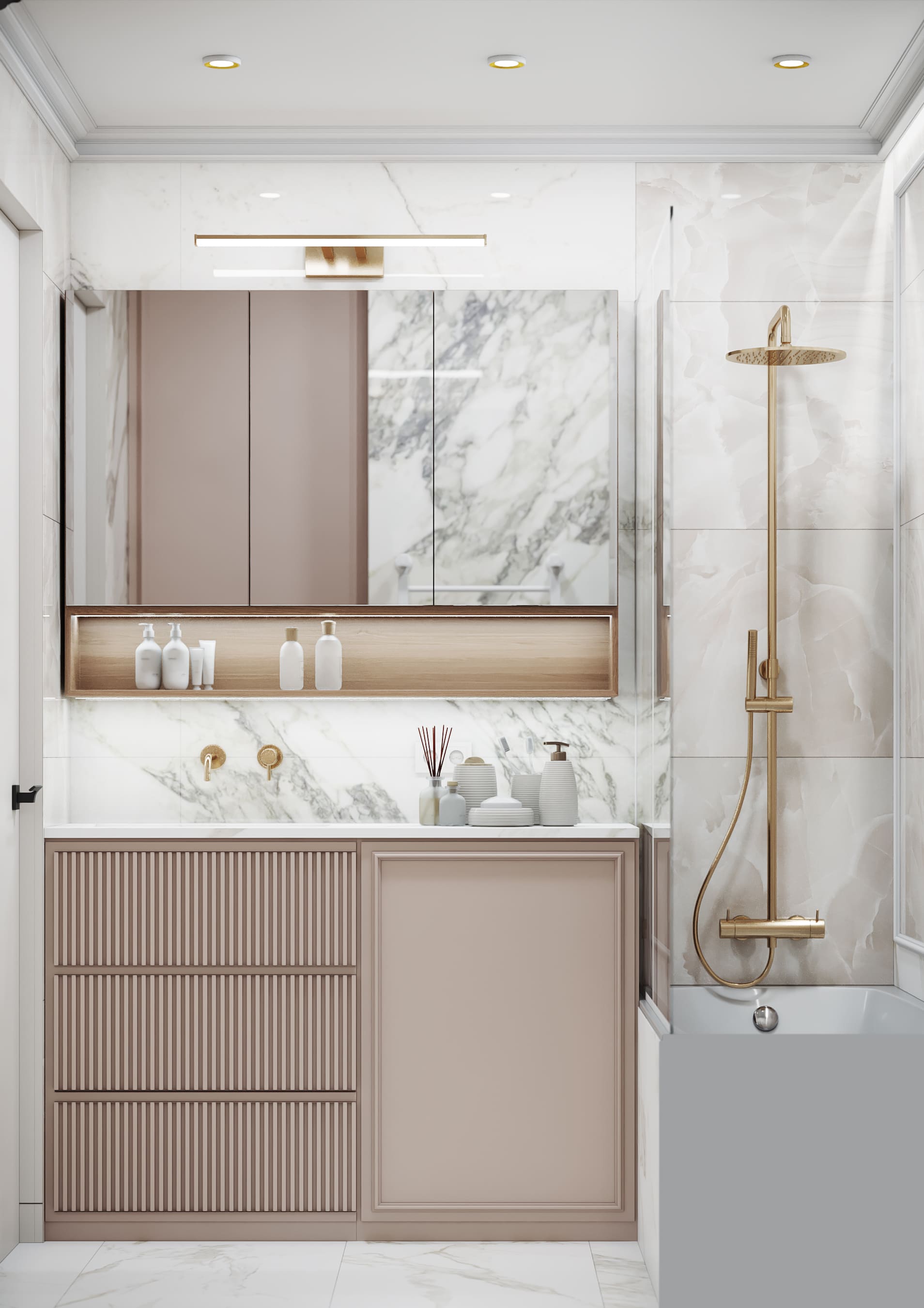 В спальне стена с изголовьем украшена рельефными и латунными молдингами, зеркала зрительно расширяют пространство, бра с алебастром в отражении дает больше света.