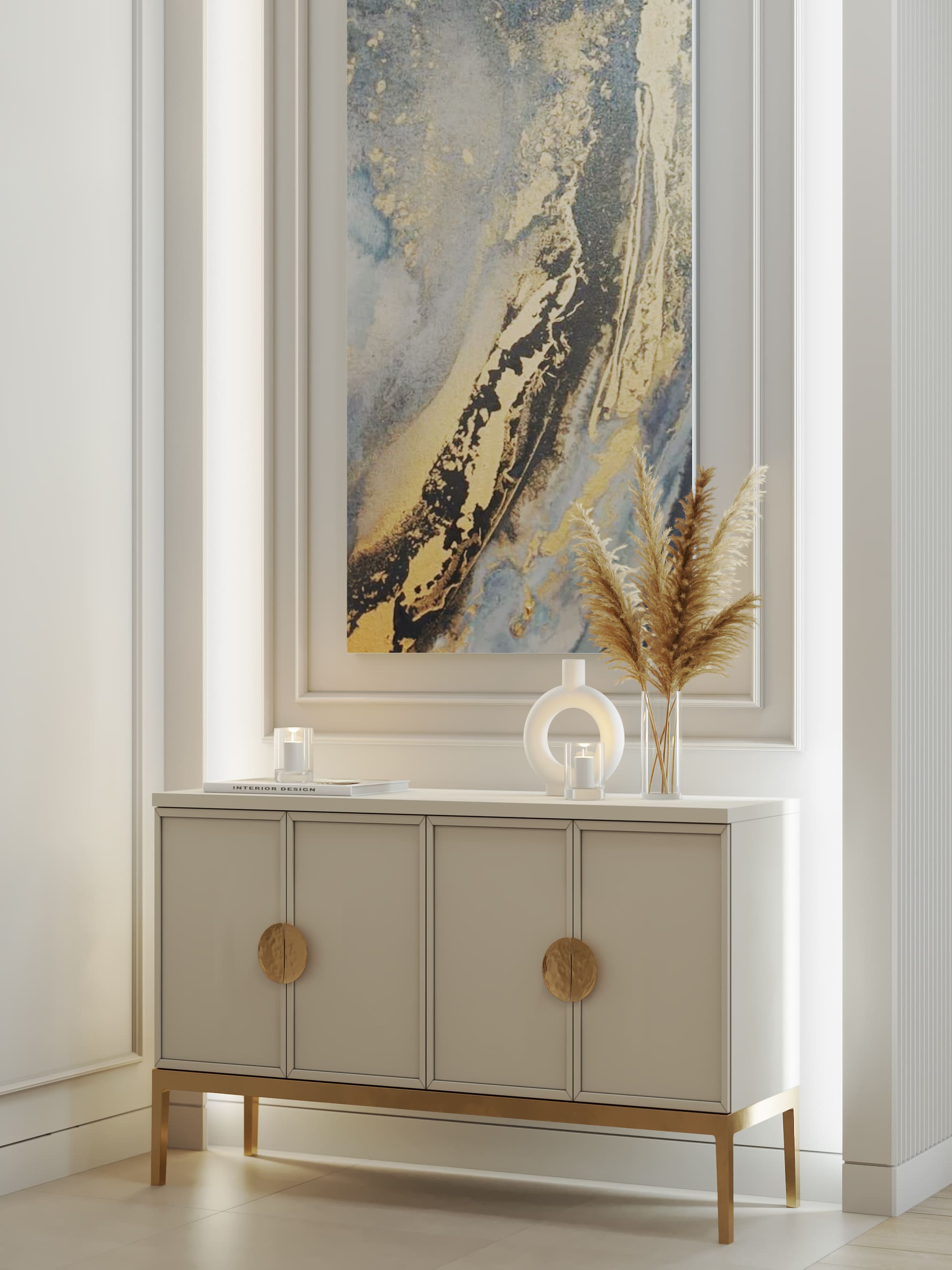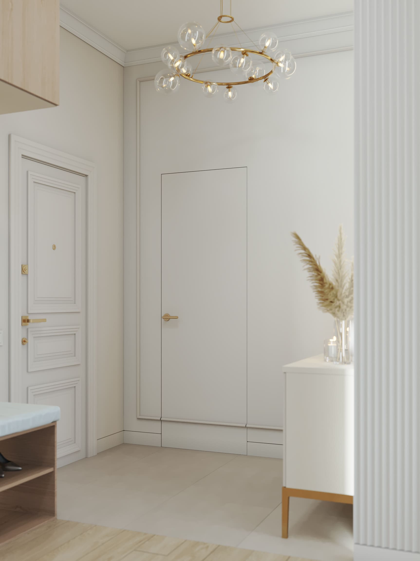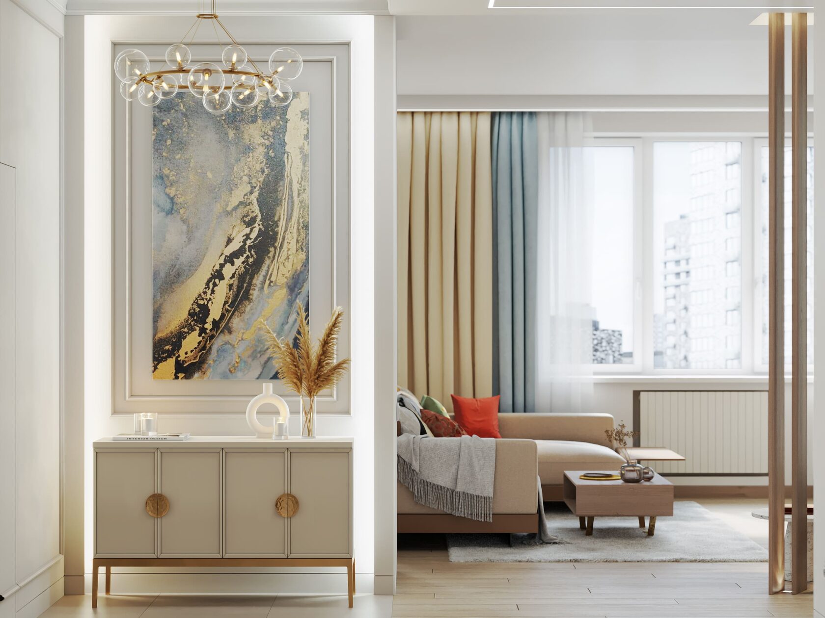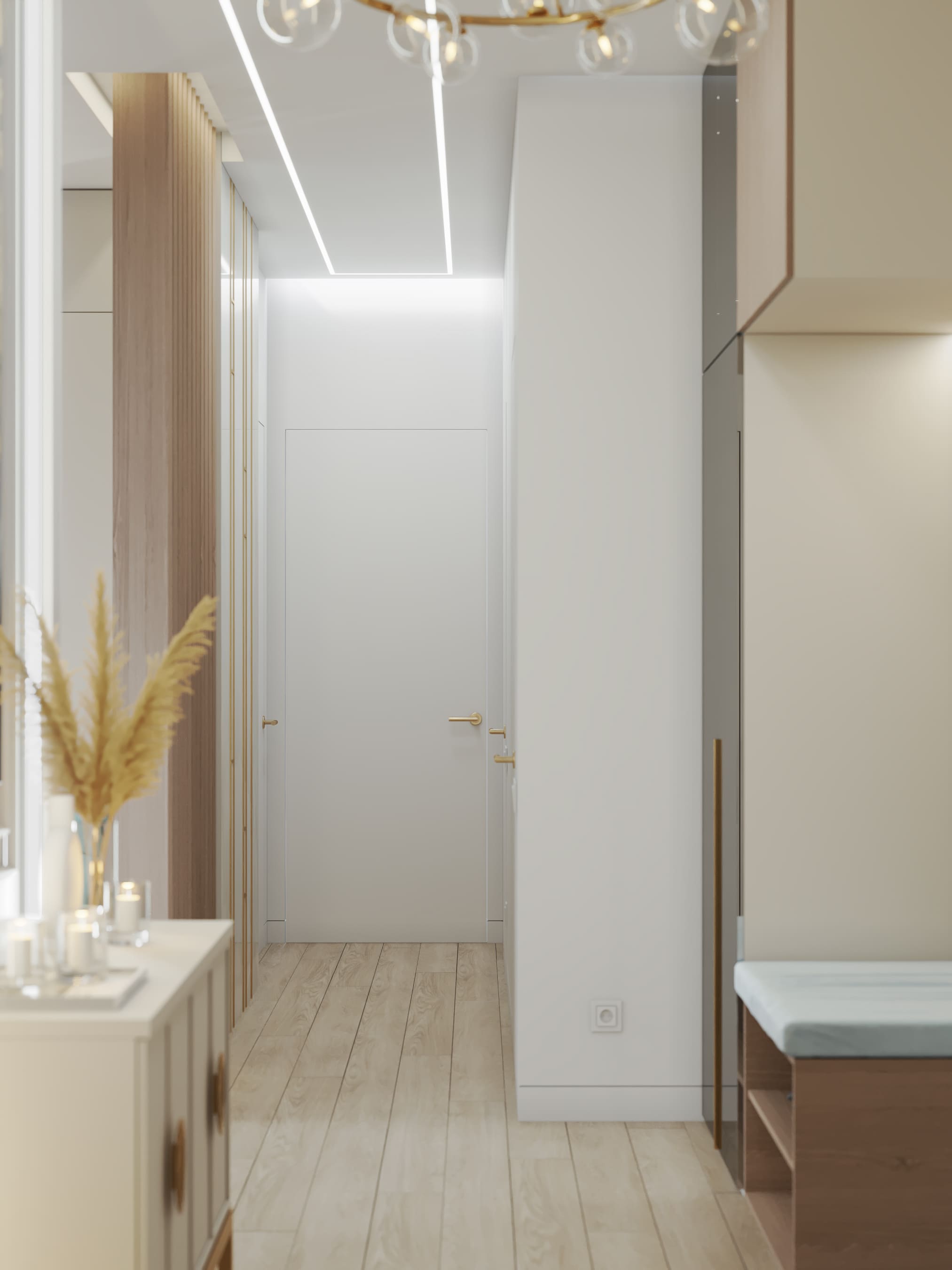 Вокруг бурлящей городской суеты по просьбе семьи из трёх человек мы постарались сформировать оазис тишины, согласия и умиротворенности. Всё пространство квартиры буквально пронизано светом. При этом тепло солнечного света стильно компенсируют, оттеняют вкрапления золотых деталей, а также применение полированной латуни в мраморе, ручках, светильниках и фурнитуре.