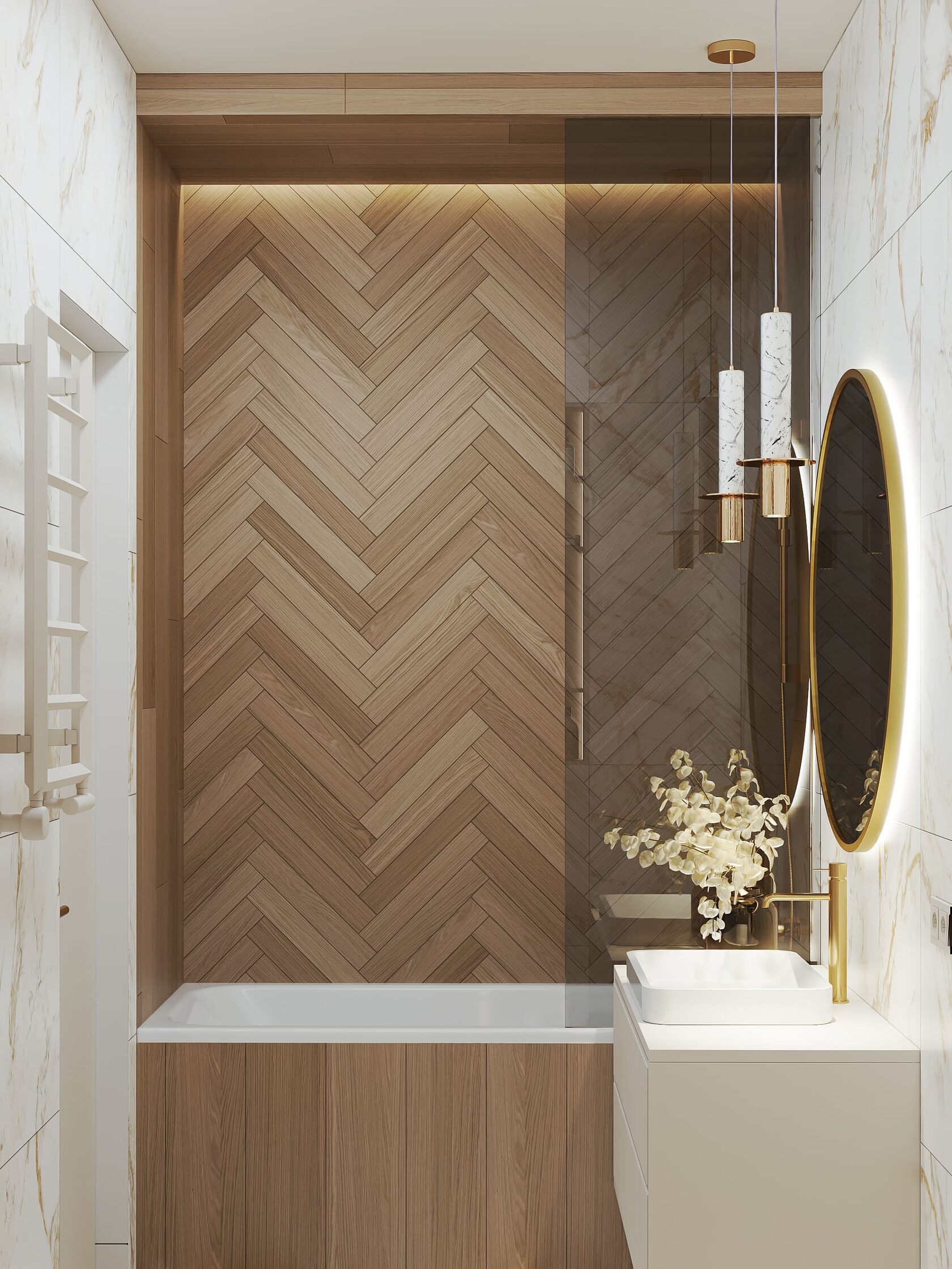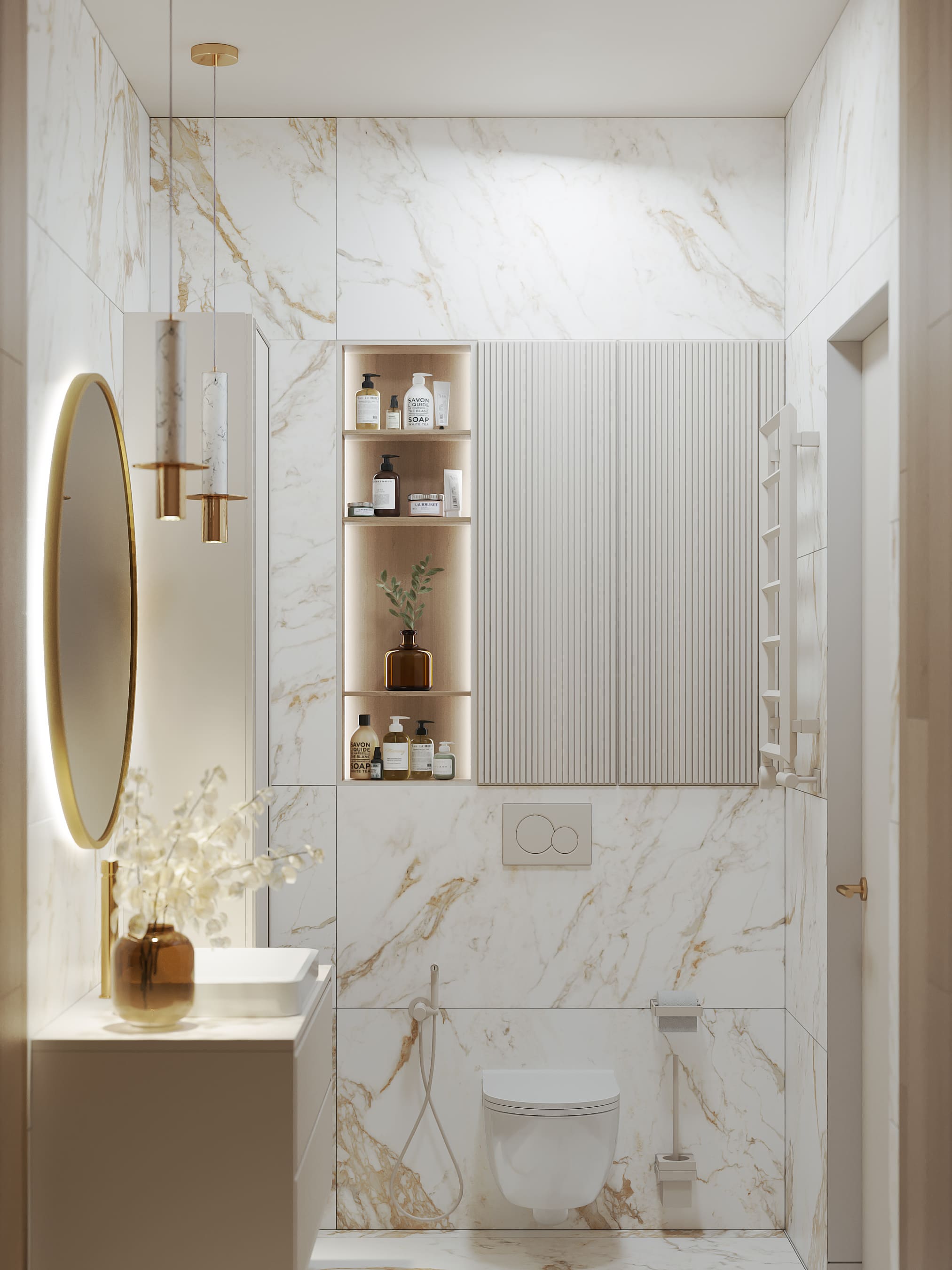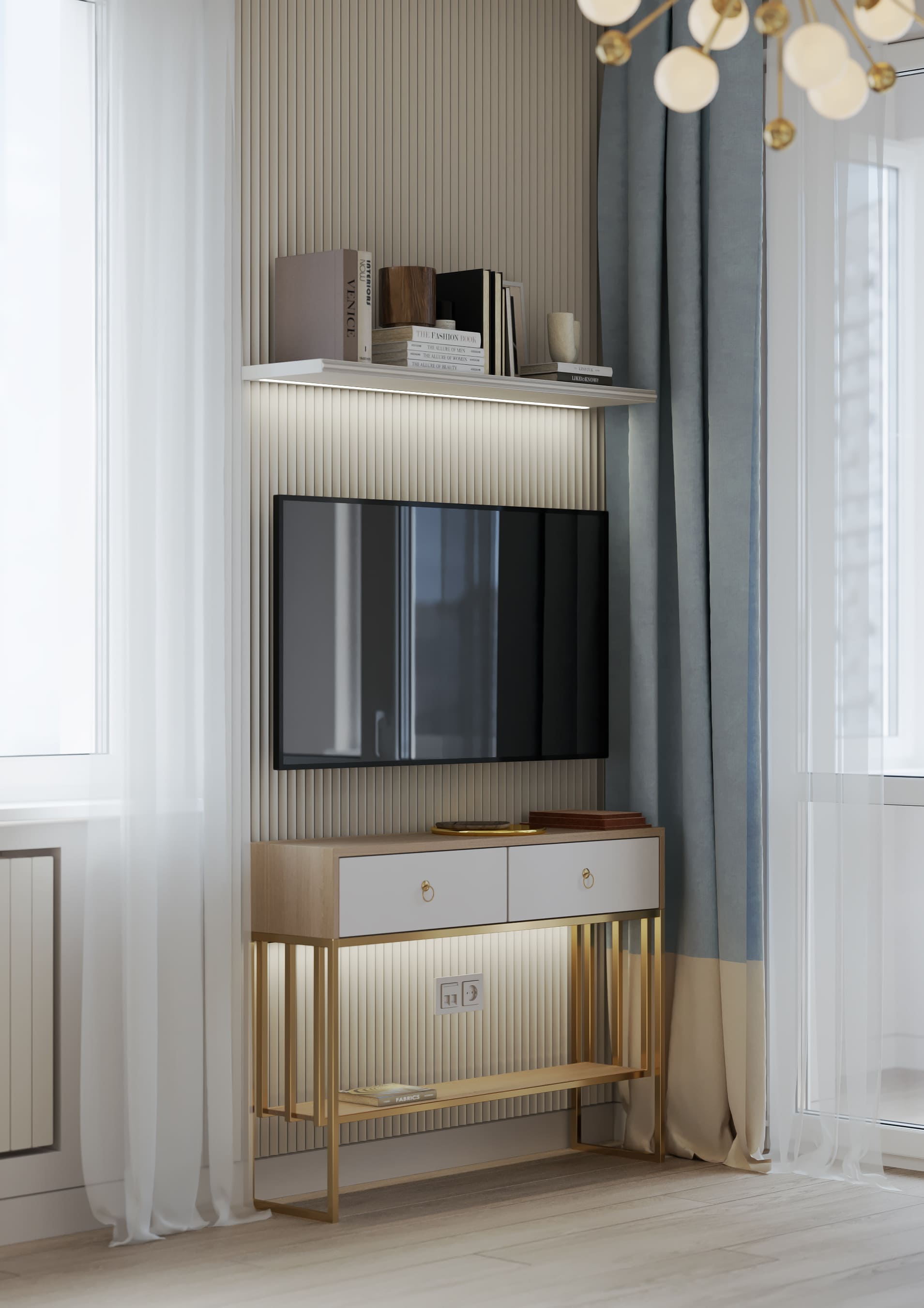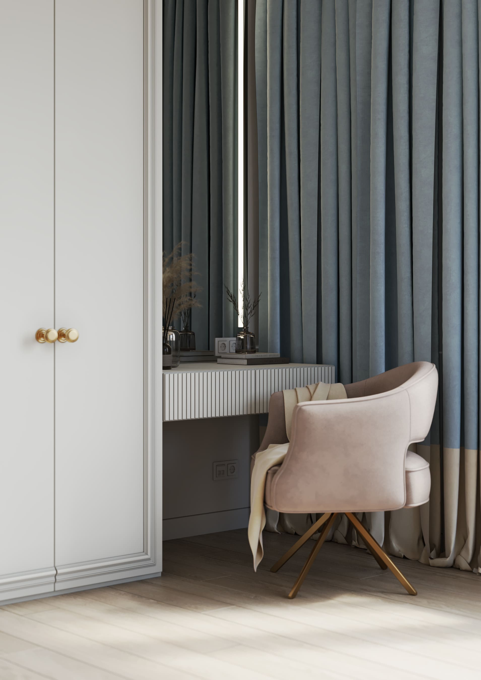 Вокруг бурлящей городской суеты по просьбе семьи из трёх человек мы постарались сформировать оазис тишины, согласия и умиротворенности. Всё пространство квартиры буквально пронизано светом. При этом тепло солнечного света стильно компенсируют, оттеняют вкрапления золотых деталей, а также применение полированной латуни в мраморе, ручках, светильниках и фурнитуре.