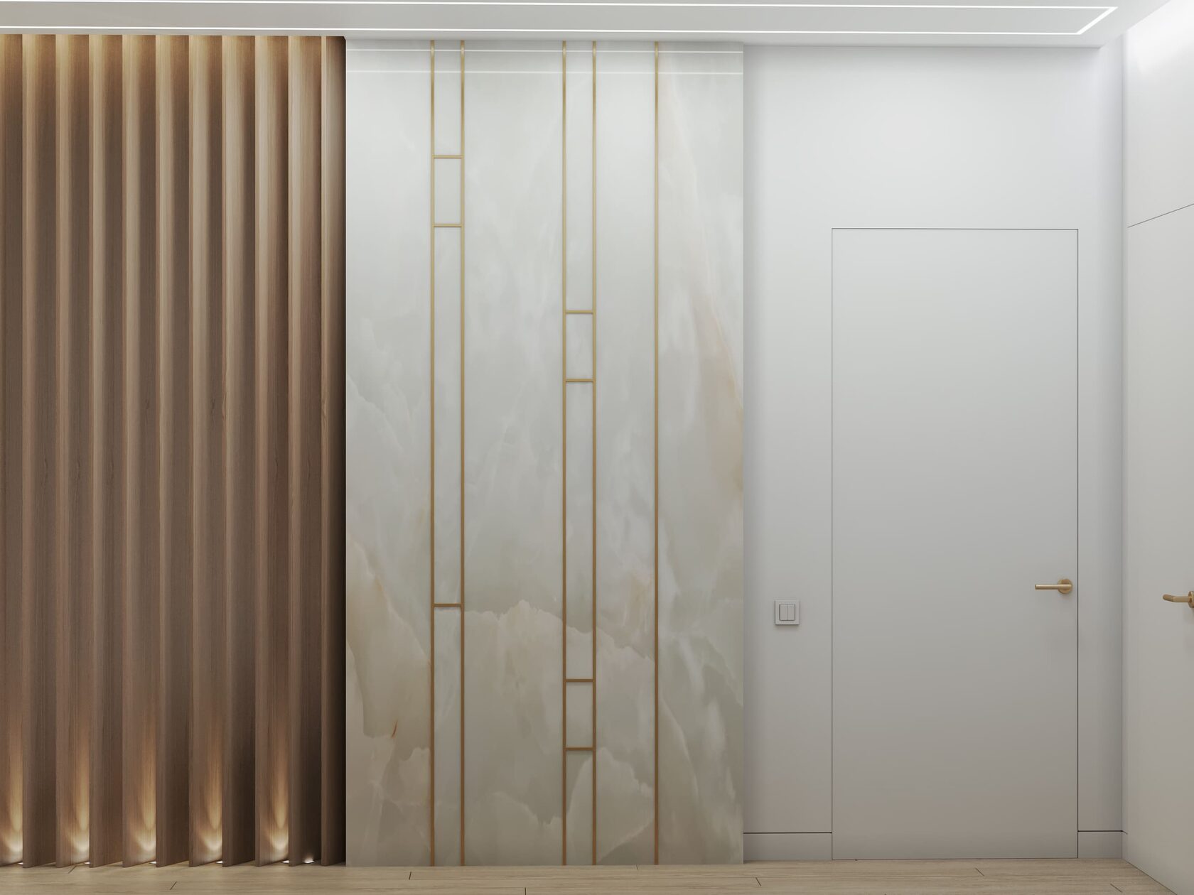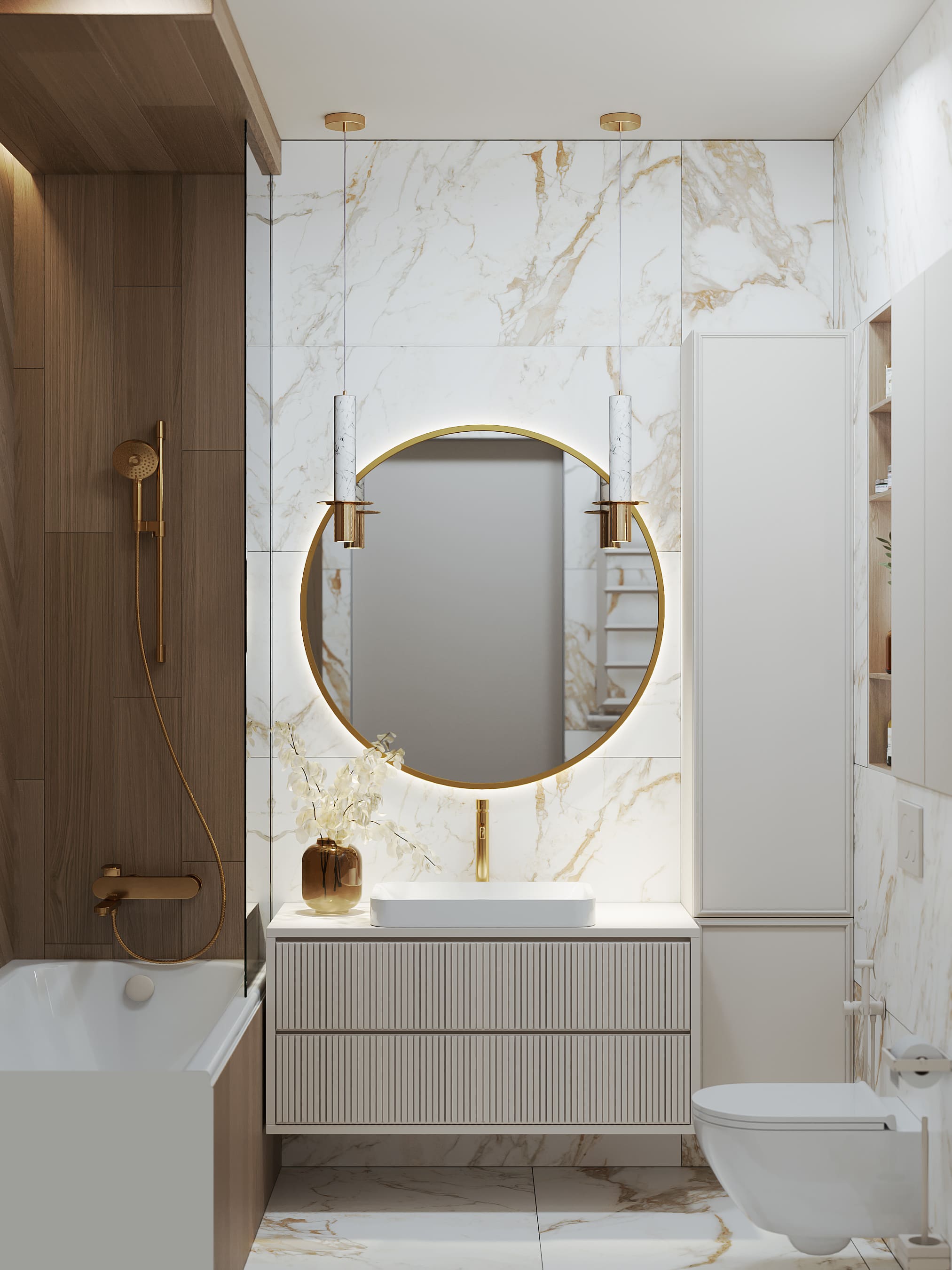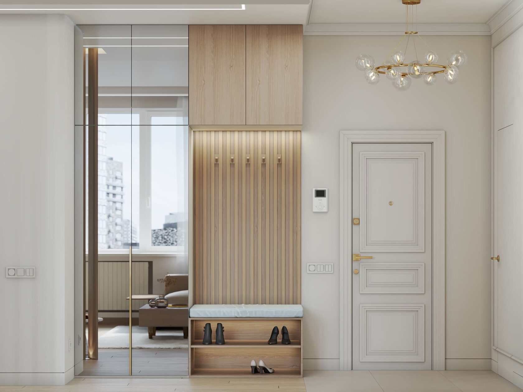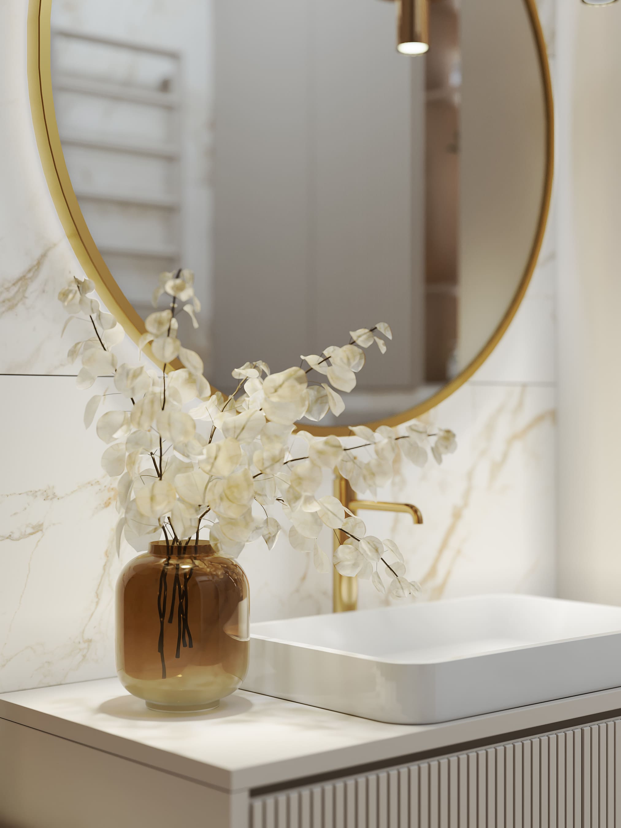 Вокруг бурлящей городской суеты по просьбе семьи из трёх человек мы постарались сформировать оазис тишины, согласия и умиротворенности. Всё пространство квартиры буквально пронизано светом. При этом тепло солнечного света стильно компенсируют, оттеняют вкрапления золотых деталей, а также применение полированной латуни в мраморе, ручках, светильниках и фурнитуре.