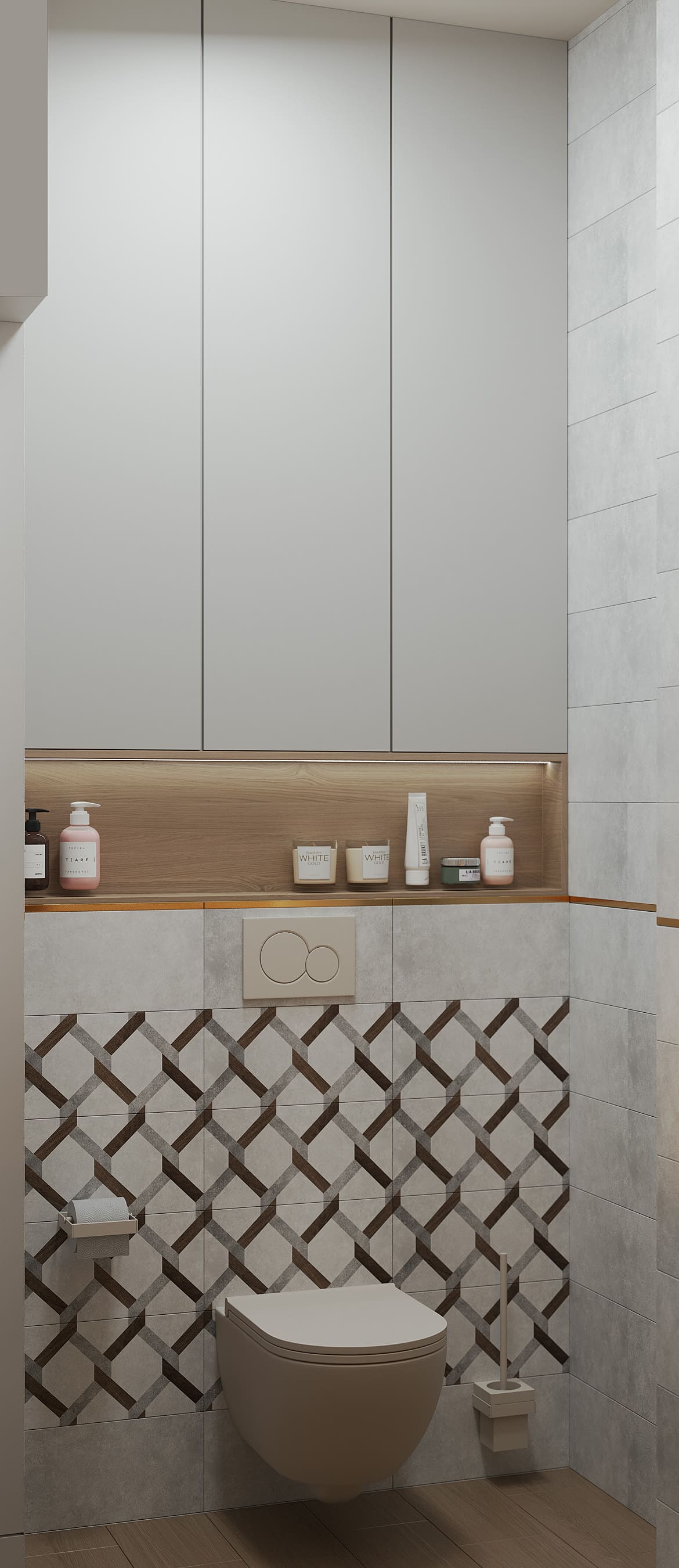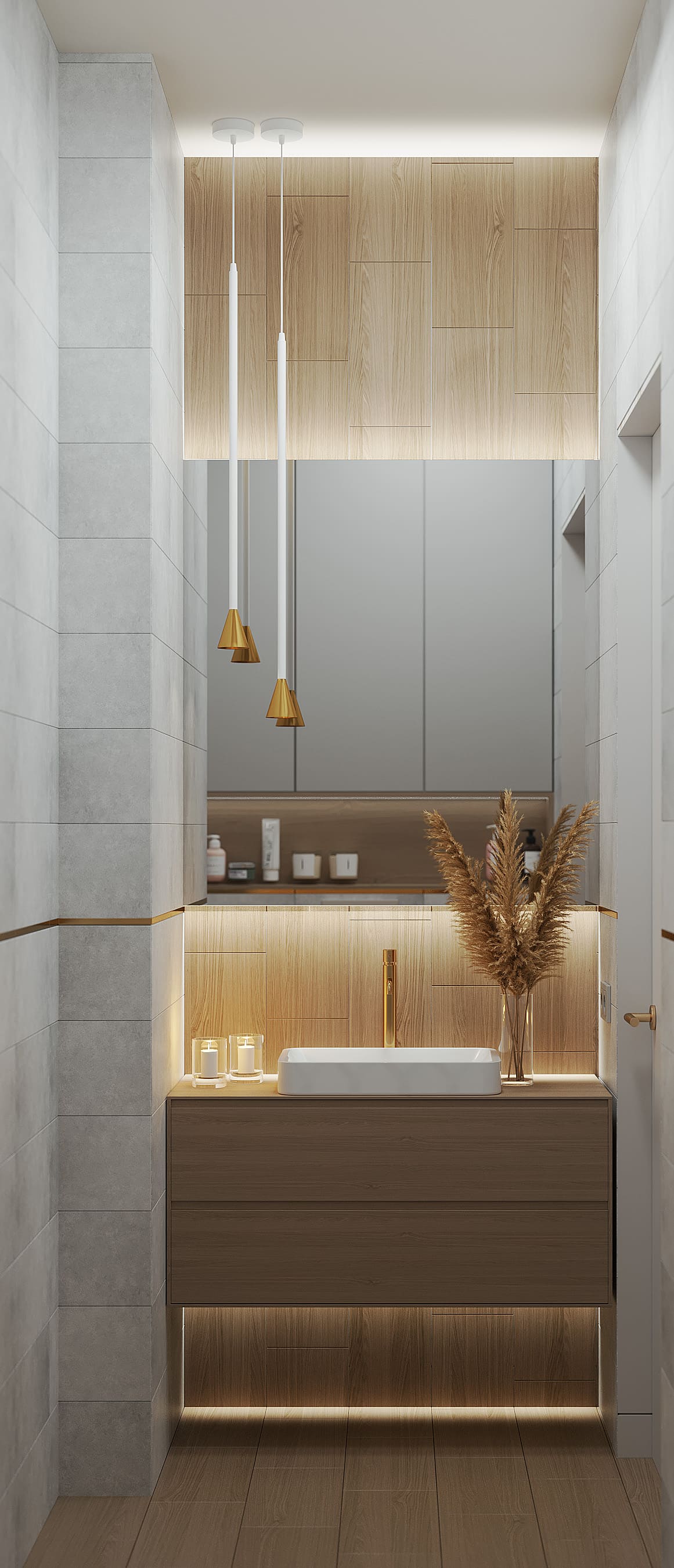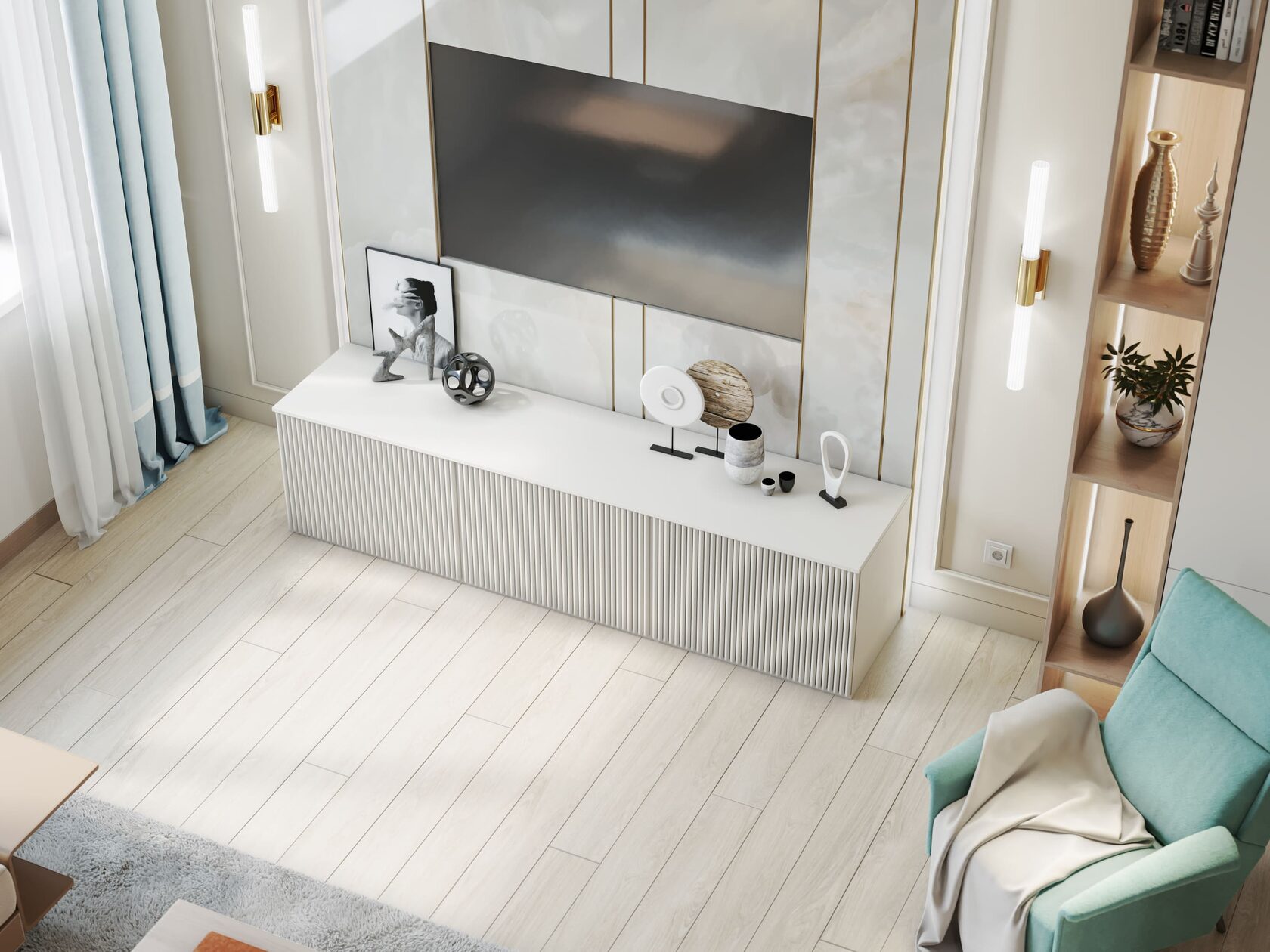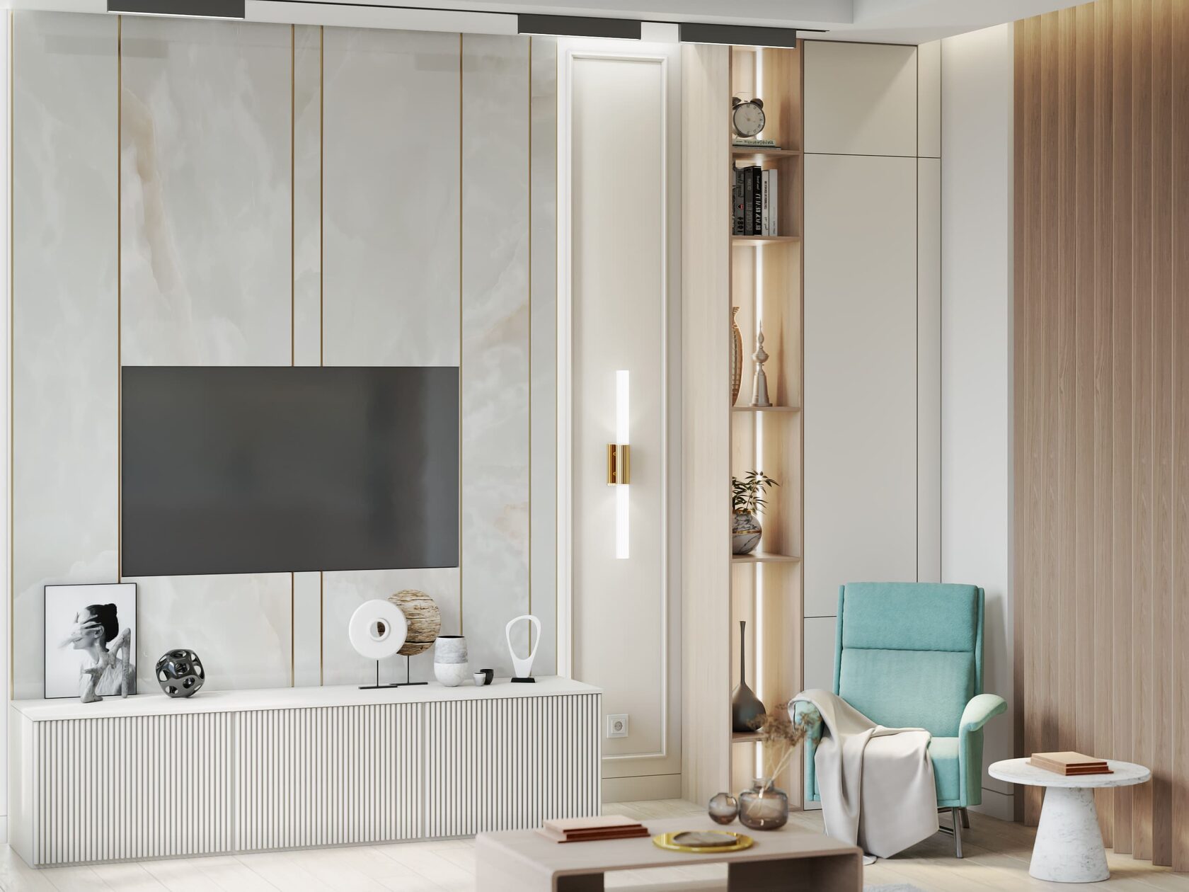 Вокруг бурлящей городской суеты по просьбе семьи из трёх человек мы постарались сформировать оазис тишины, согласия и умиротворенности. Всё пространство квартиры буквально пронизано светом. При этом тепло солнечного света стильно компенсируют, оттеняют вкрапления золотых деталей, а также применение полированной латуни в мраморе, ручках, светильниках и фурнитуре.