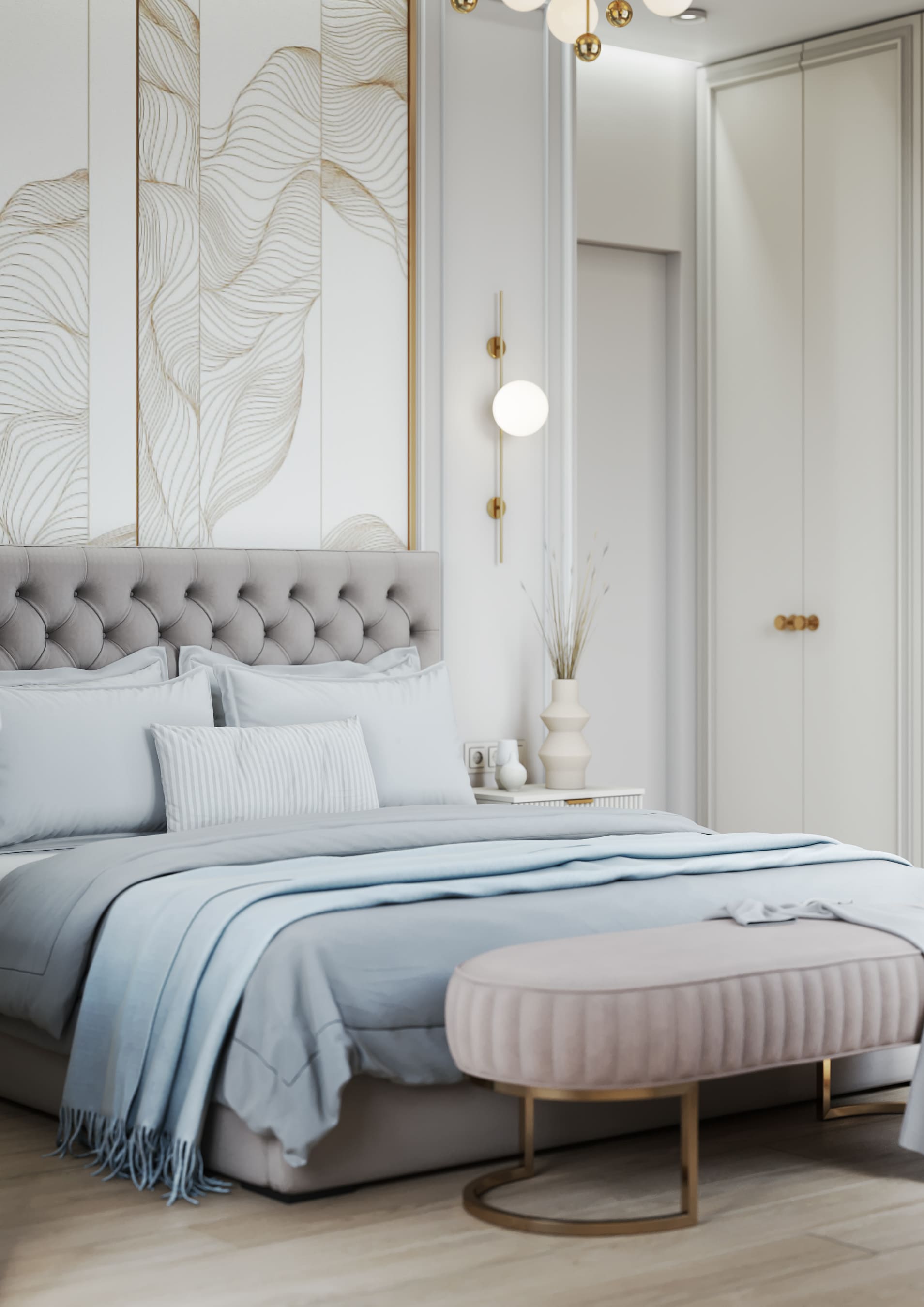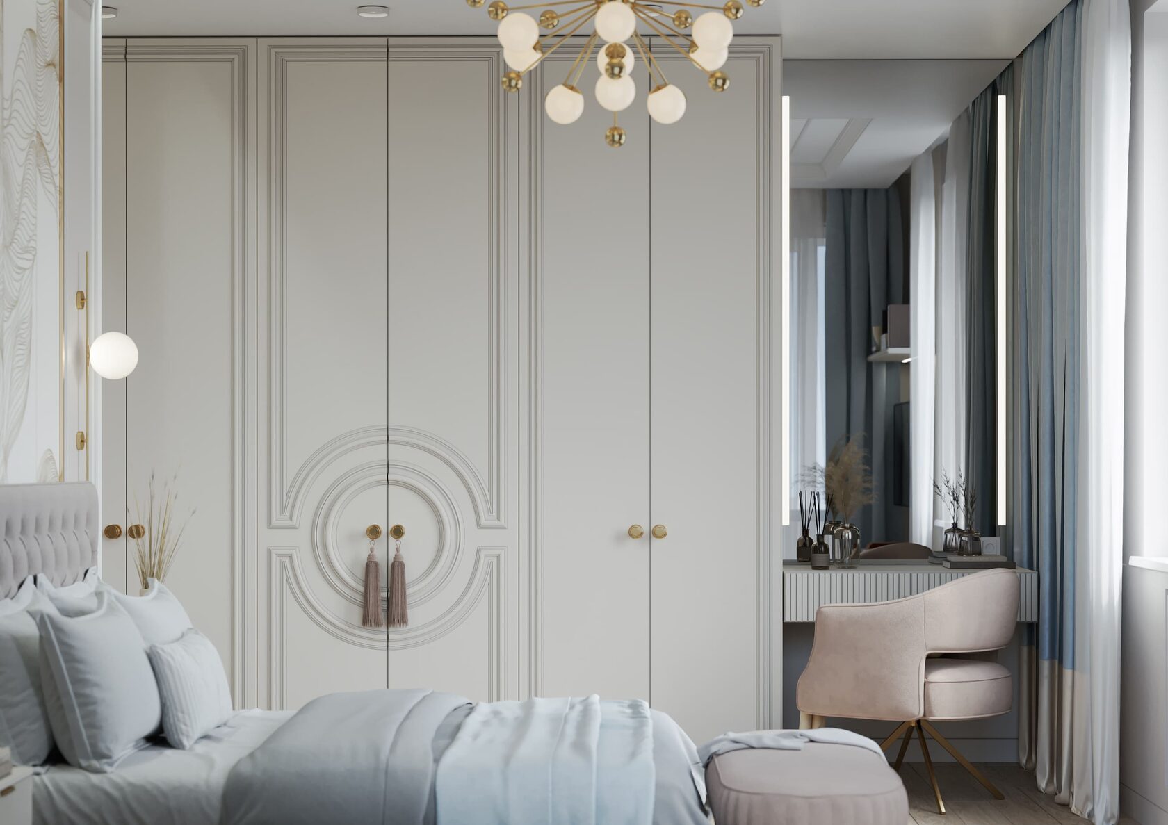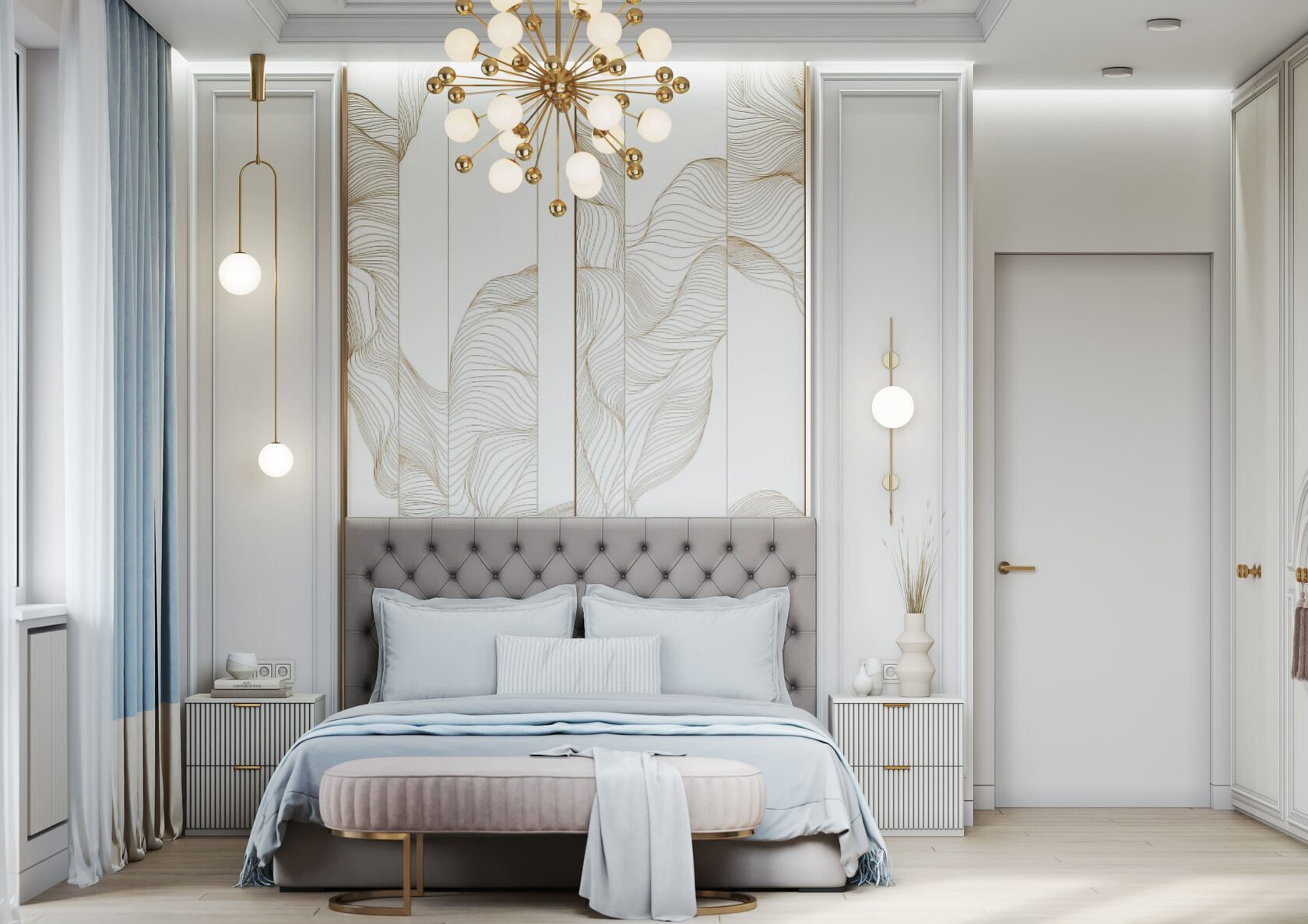 В спальне были использованы голубые, бежевые, нюдовые и пепельные оттенки. На стене — фотообои с золотым покрытием рисунка Fresq. Над шикарной кроватью аккуратно расположилась ещё одна любопытная люстра из латуни и стекла, чем-то напоминающая едва распушившийся одуванчик.