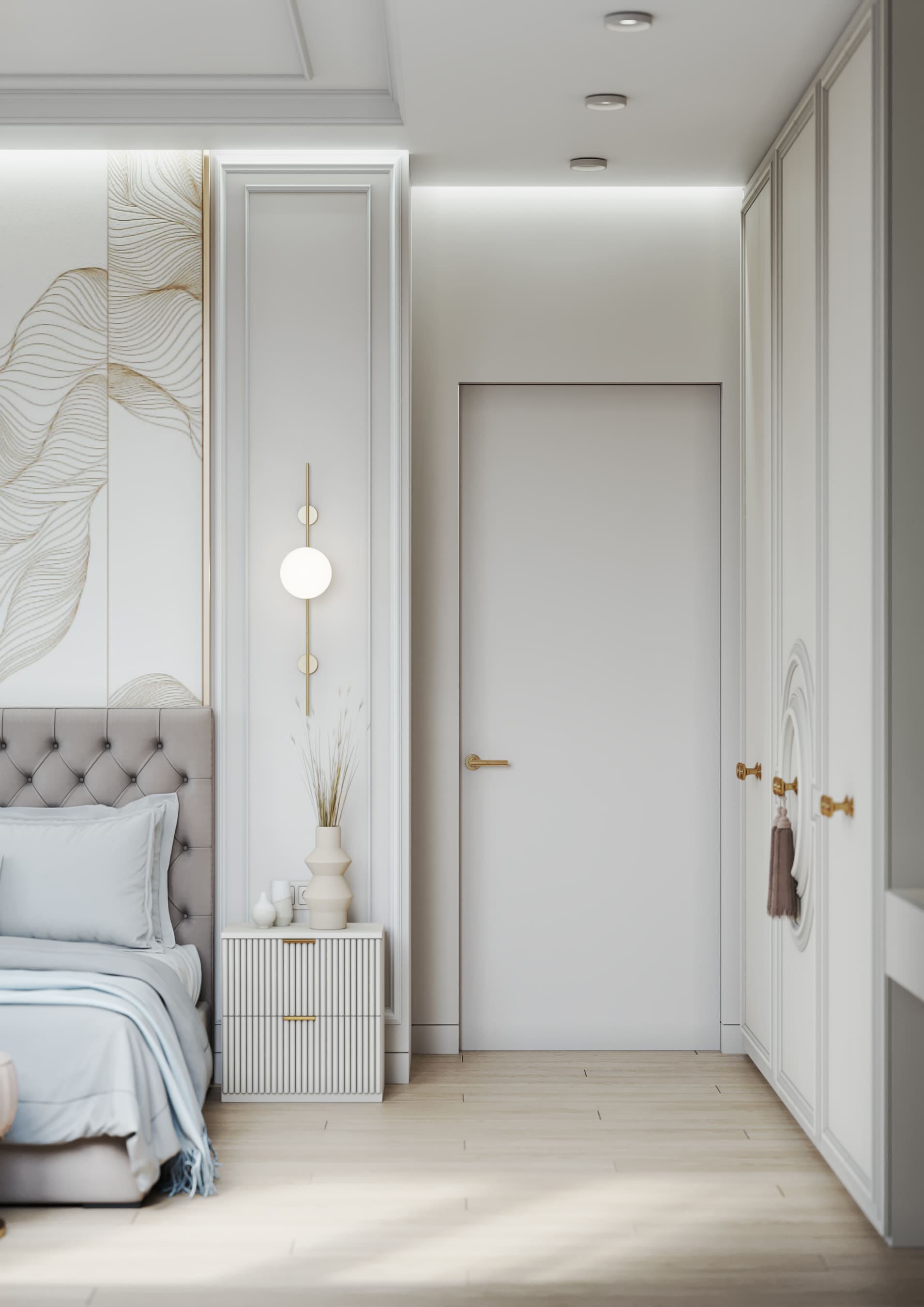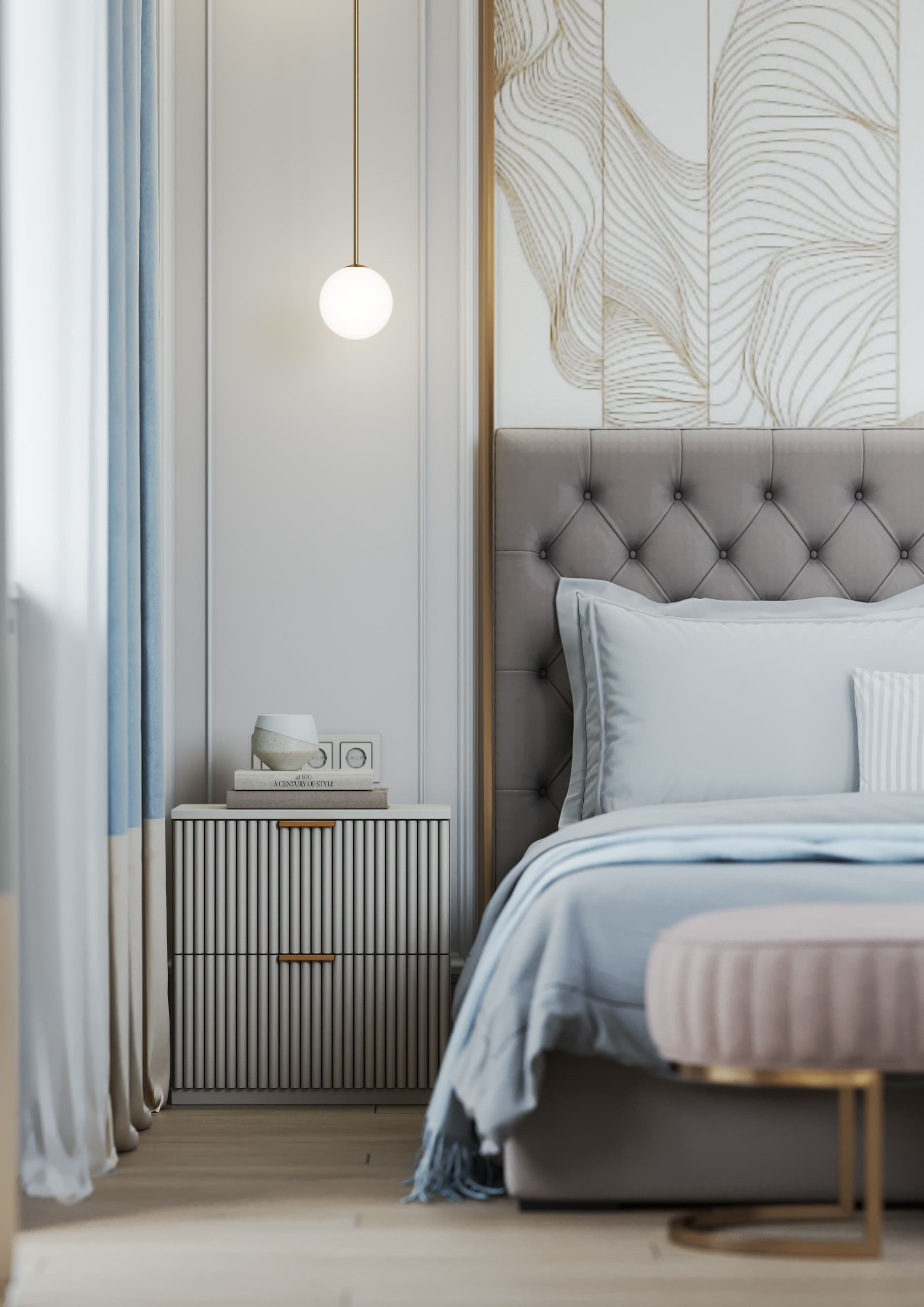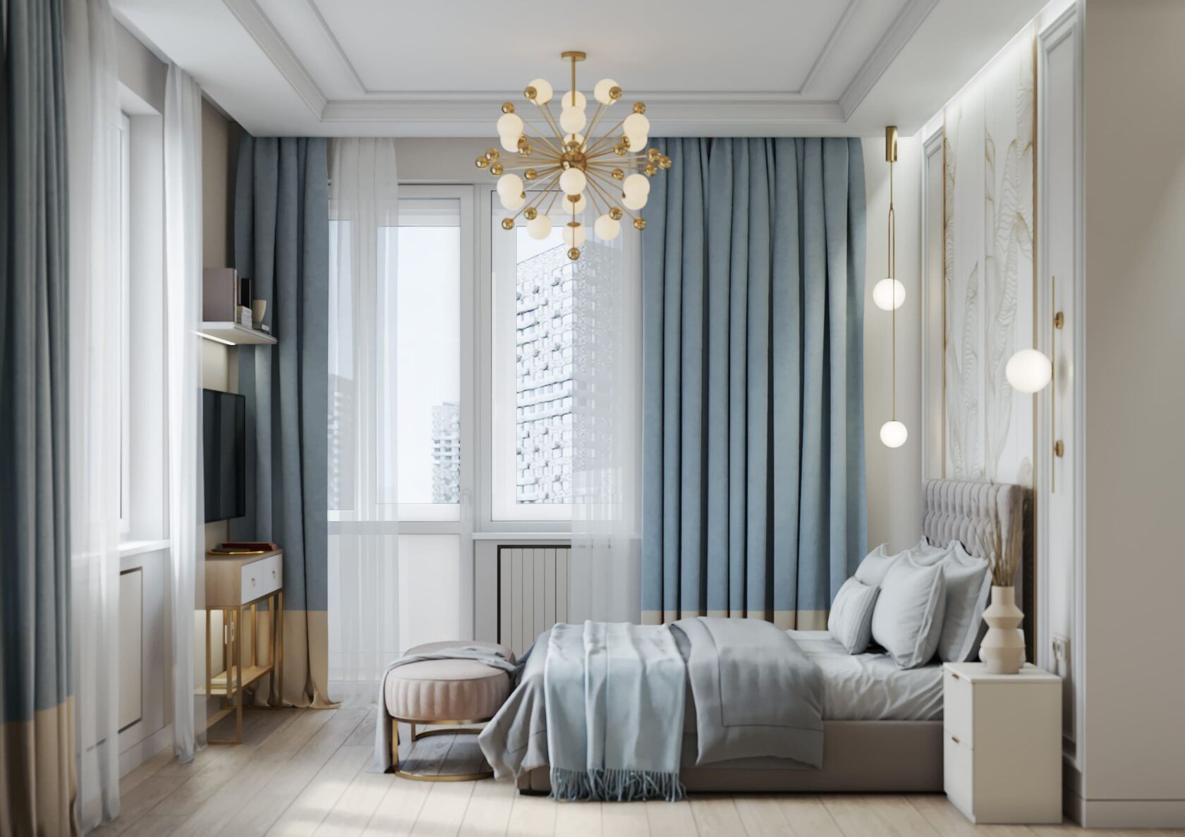 В спальне были использованы голубые, бежевые, нюдовые и пепельные оттенки. На стене — фотообои с золотым покрытием рисунка Fresq. Над шикарной кроватью аккуратно расположилась ещё одна любопытная люстра из латуни и стекла, чем-то напоминающая едва распушившийся одуванчик.