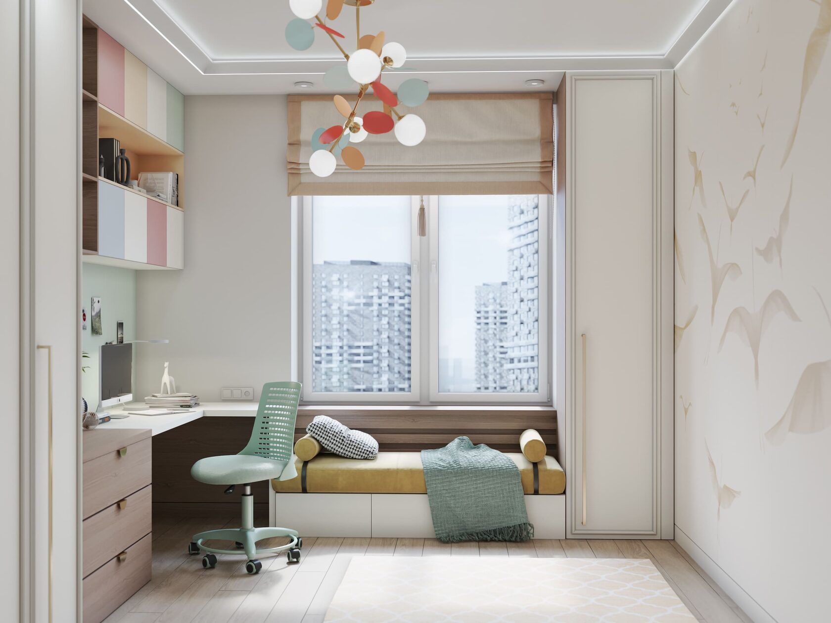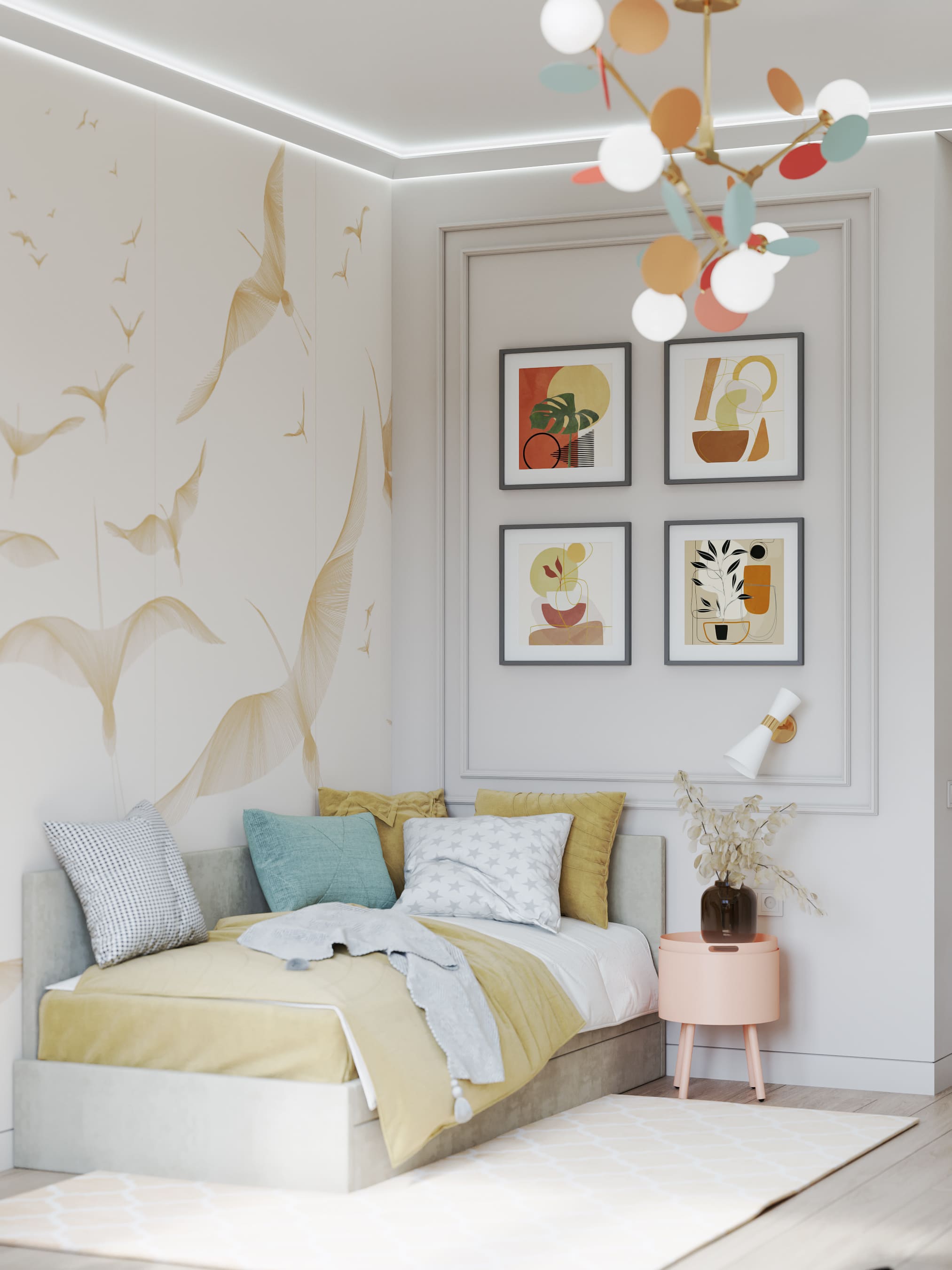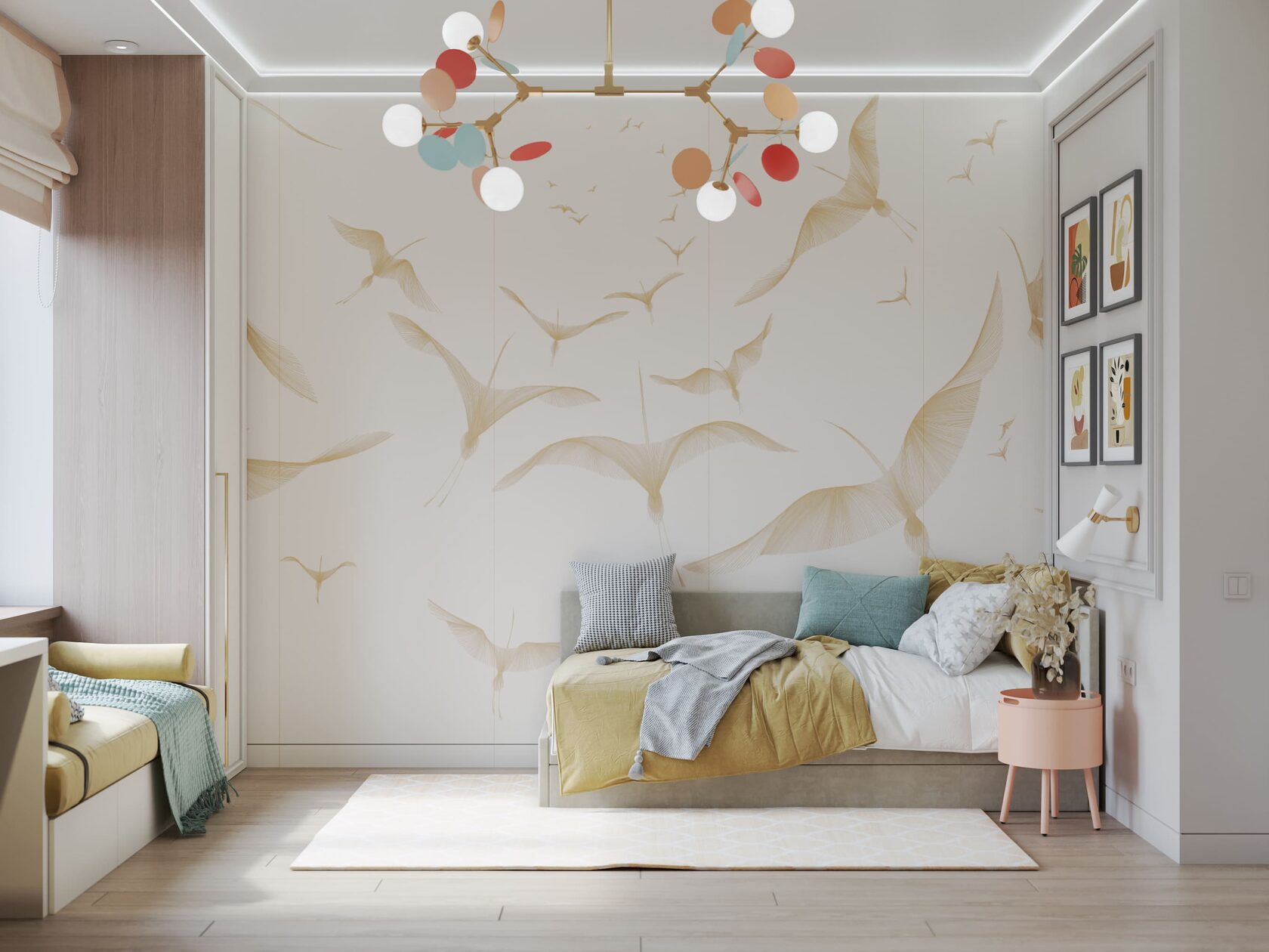 Детская комната выполнена в похожих тонах, однако в мебельном декоре использован также нежно-алый. На стене — композиция из парящих журавлей. Этот завораживающий вид будет вдохновлять ребёнка на новые творческие свершения. Нельзя не упомянуть и яркий светильник по мотивам легендарных произведений художника Матисса.
