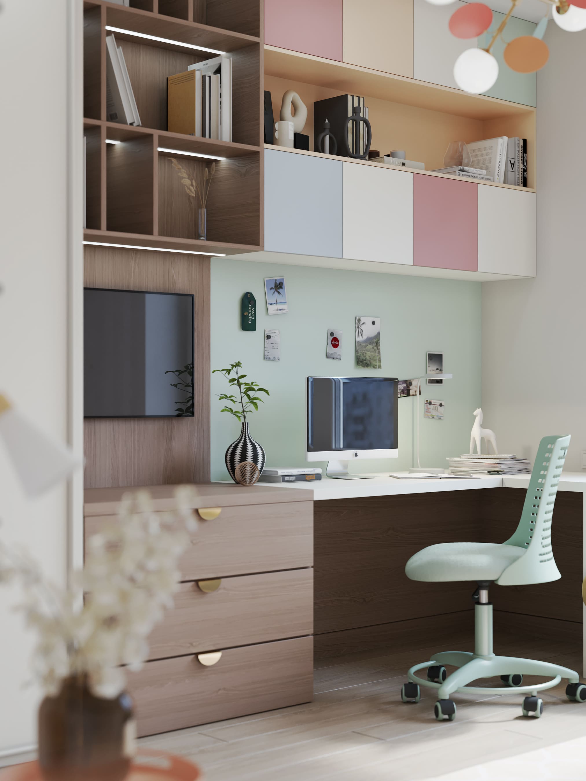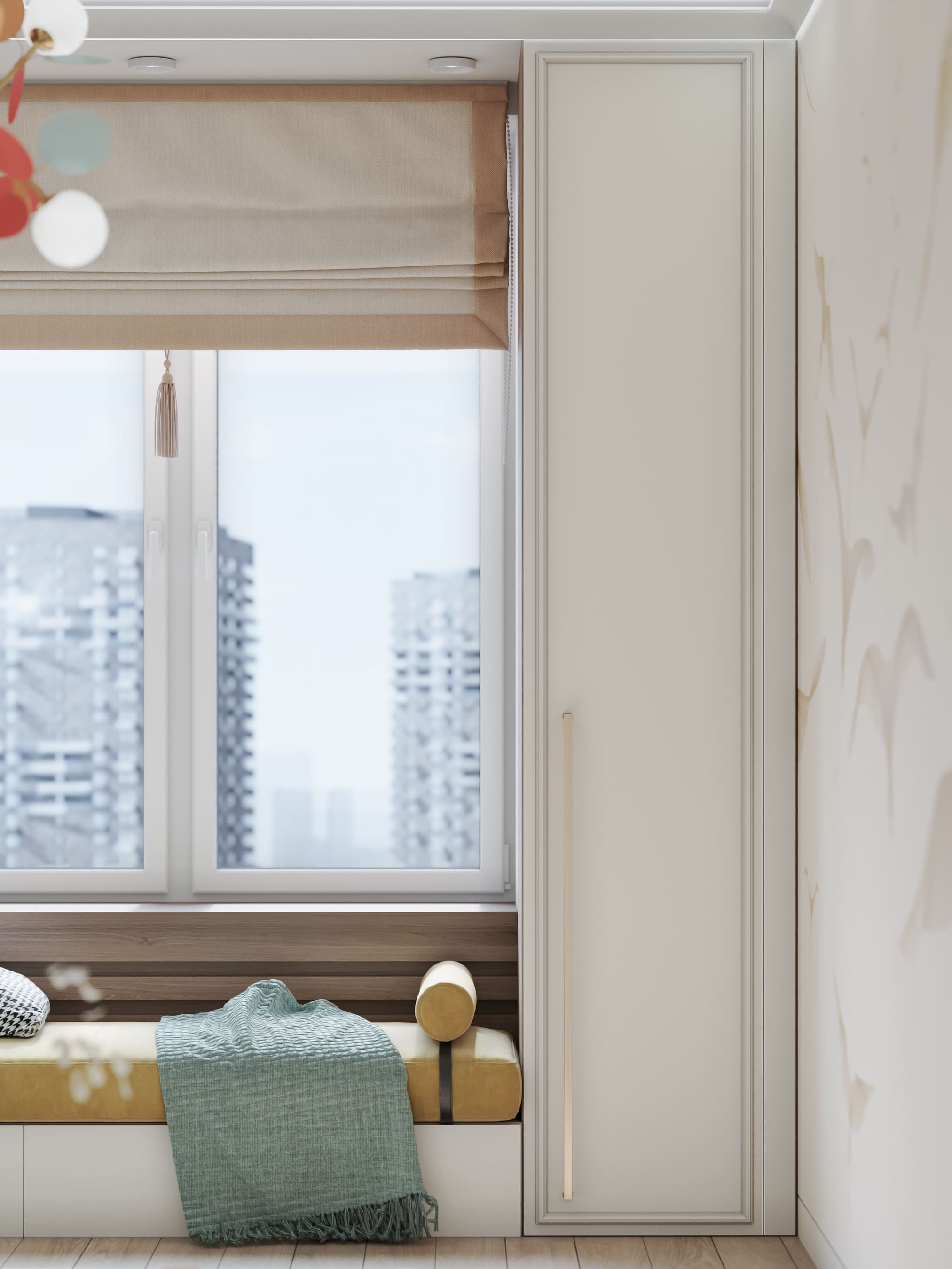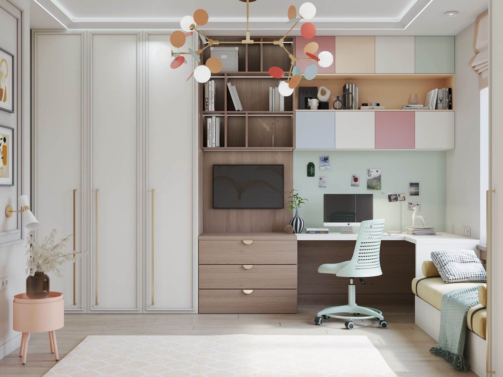 Детская комната выполнена в похожих тонах, однако в мебельном декоре использован также нежно-алый. На стене — композиция из парящих журавлей. Этот завораживающий вид будет вдохновлять ребёнка на новые творческие свершения. Нельзя не упомянуть и яркий светильник по мотивам легендарных произведений художника Матисса.