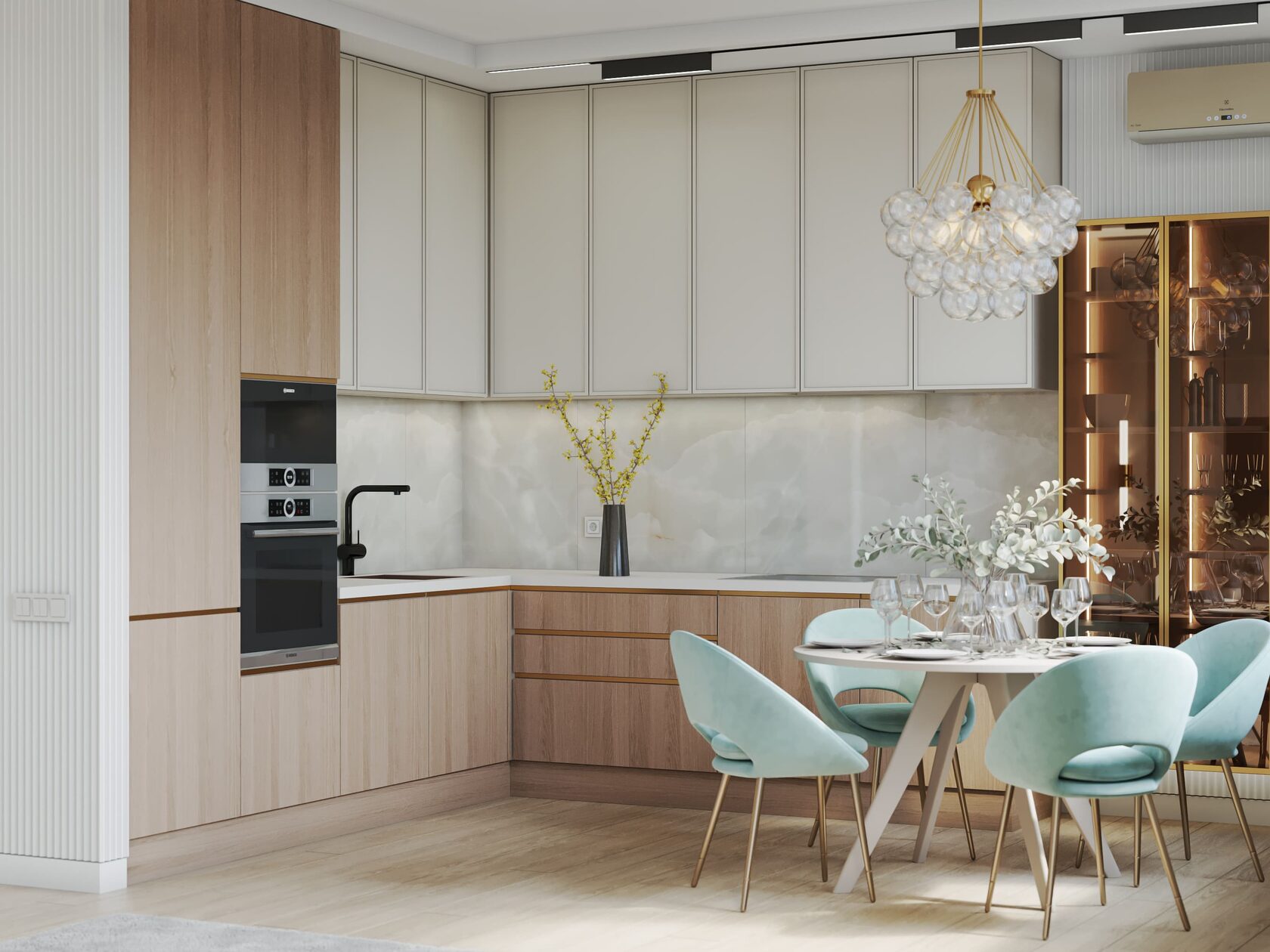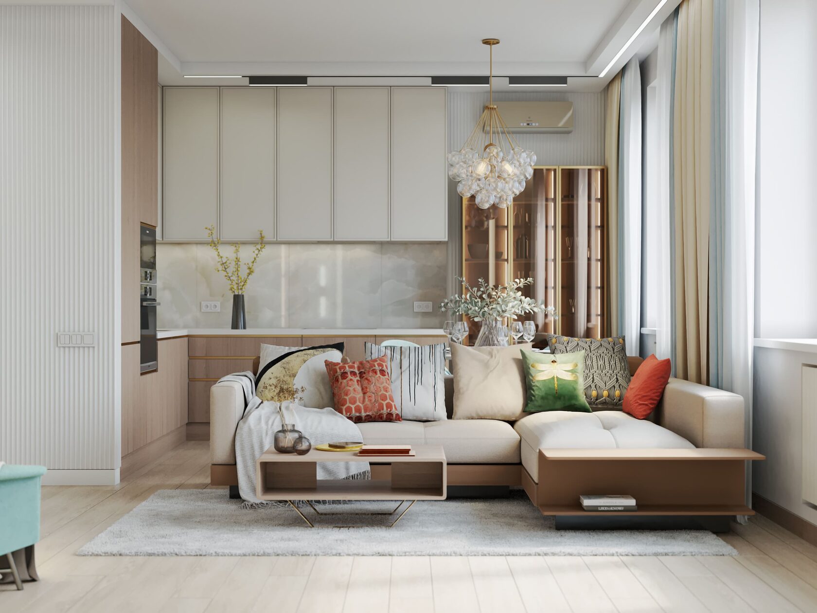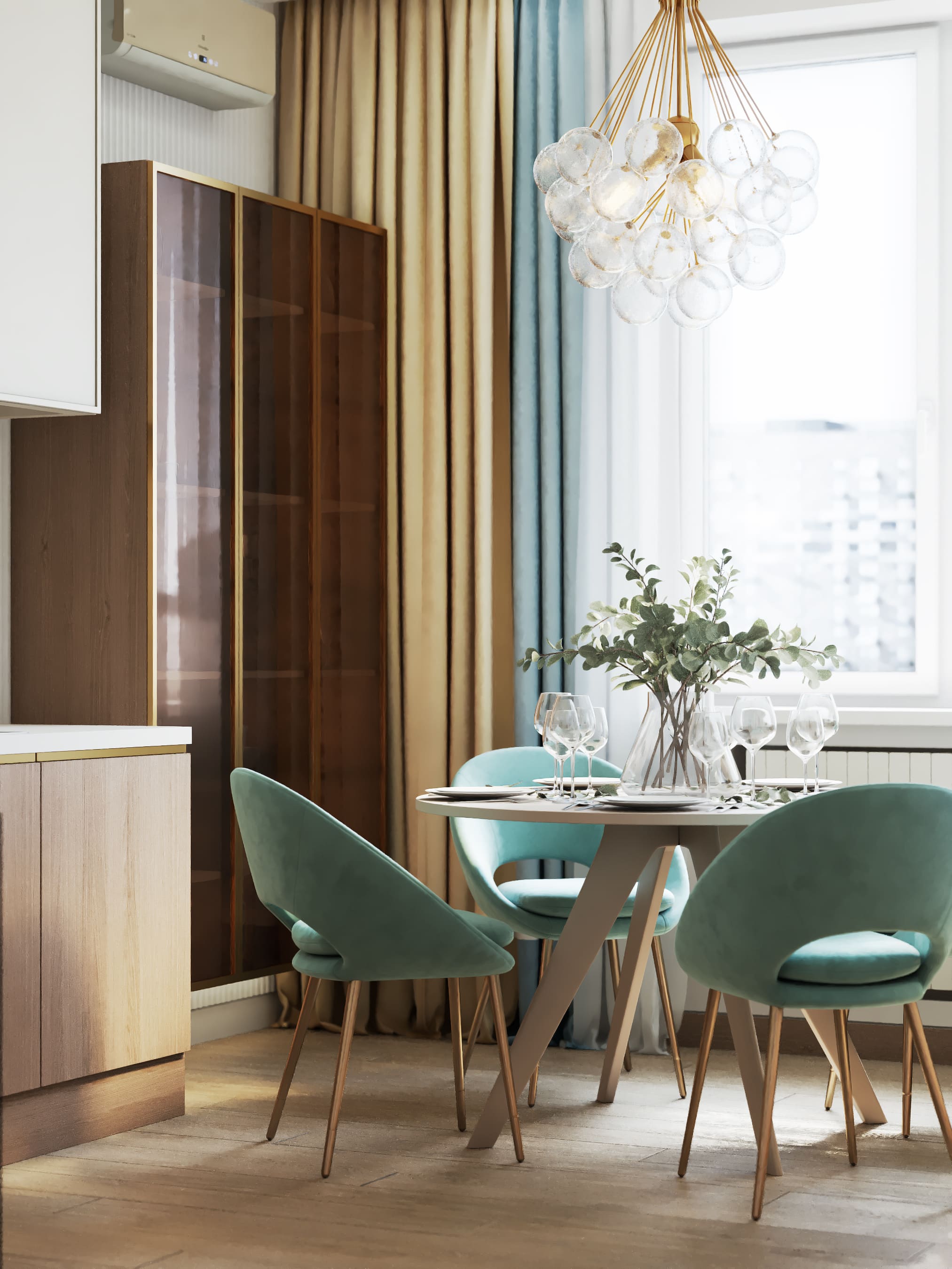 Доминирующий мятный, бирюзовый цвет придает прохладу и свежесть морского бриза. Симпатичным дополнением является люстра в гостиной, которая напоминает скопление воздушных шаров, улетающих ввысь.