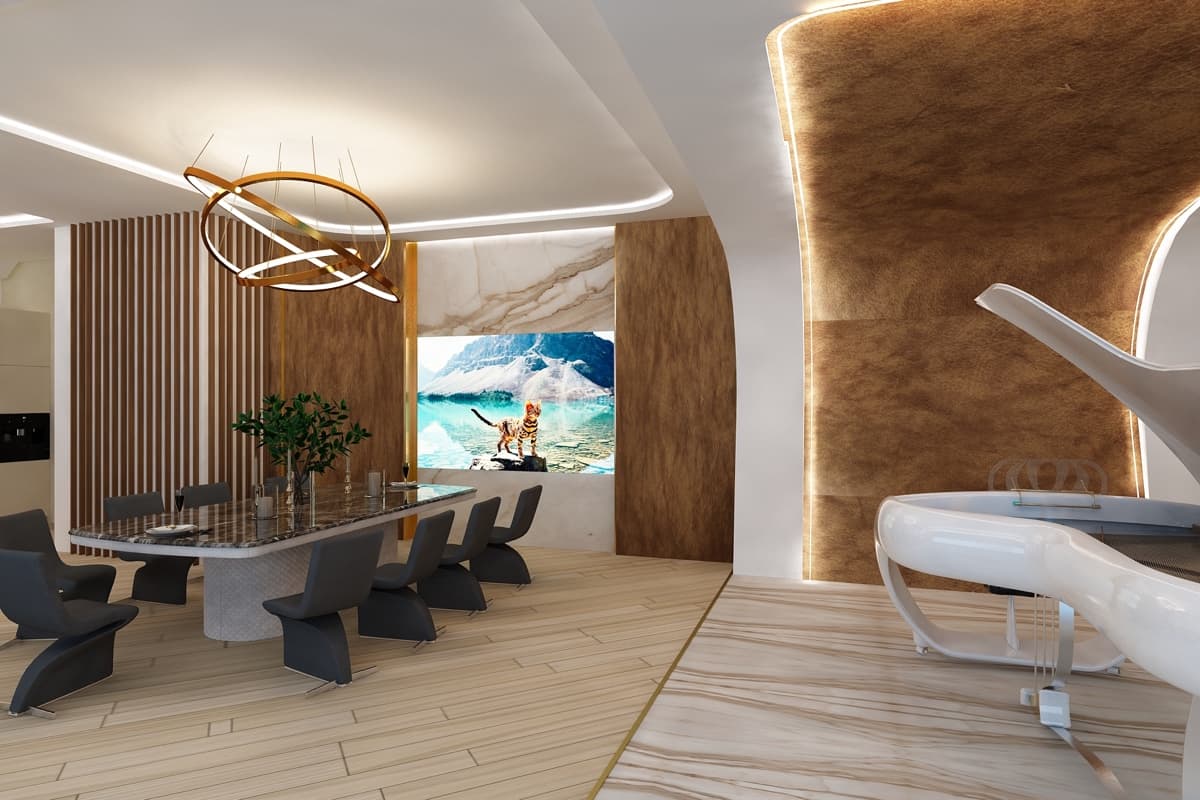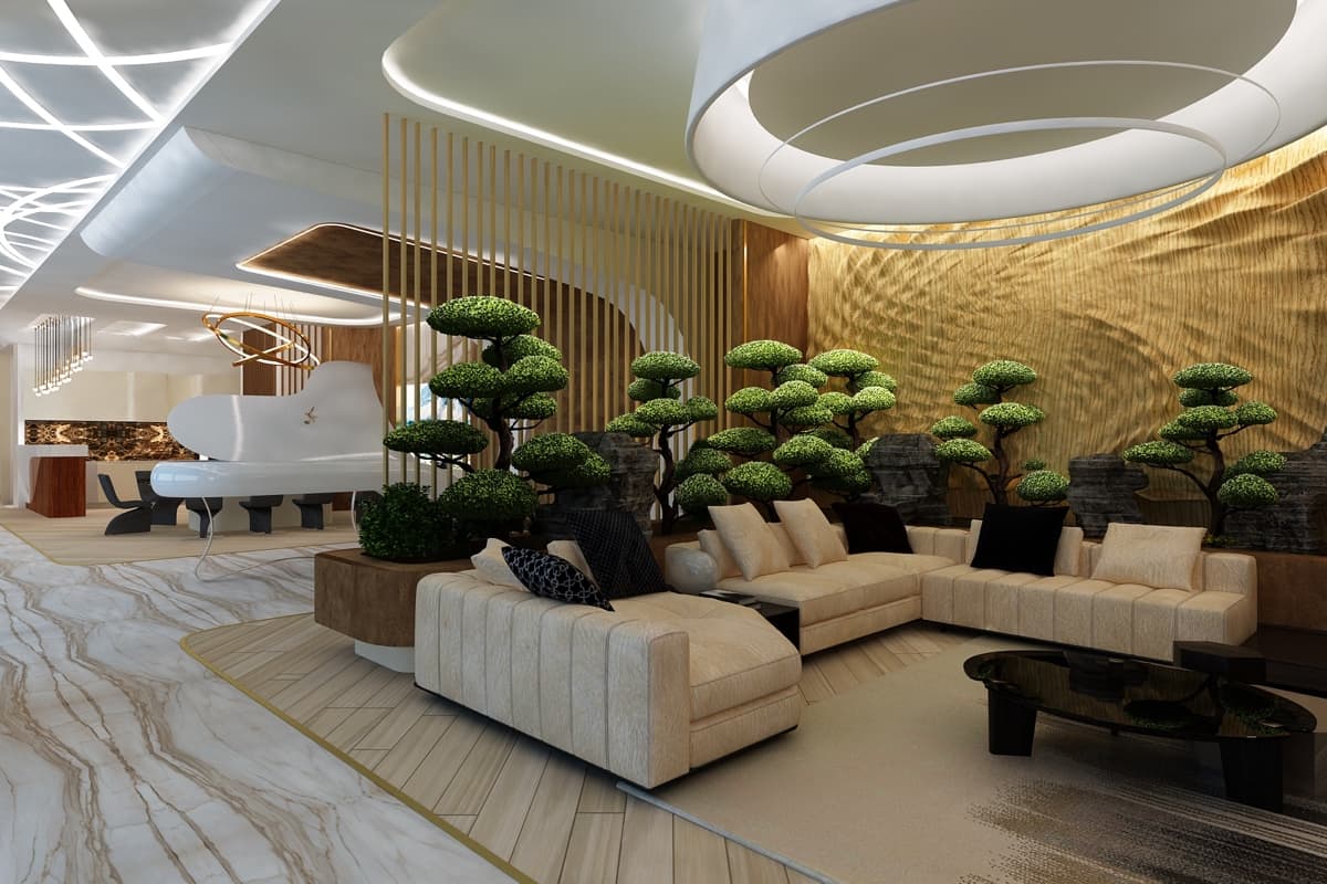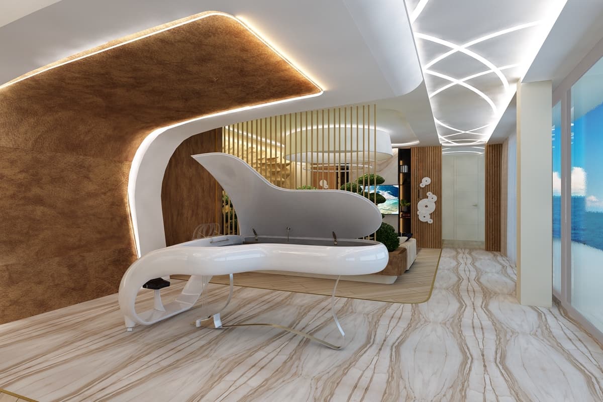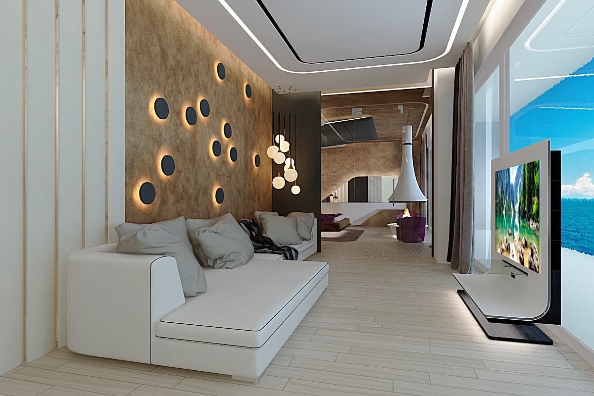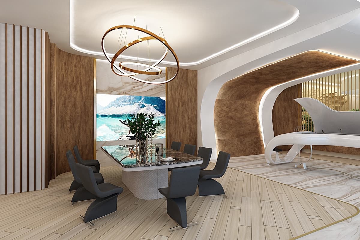 Летящие парящие формы дизайна интерьера виллы создают ощущение космического корабля. В проекте использованы: лаконичные формы, встроенная подсветка, натуральные материалы такие как дерево, мрамор, кожа. Предметы искусства, уникальные светильники, восточные мотивы вписаны в зону гостиной. Основной цвет гостиной — белый. Этот цвет создает воздух, пространство, чтобы ничего не отвлекало от панорамного вида на море из окна.
