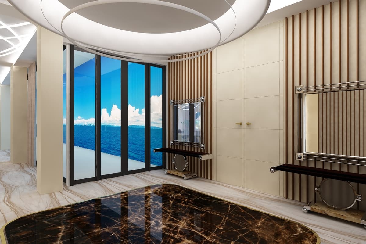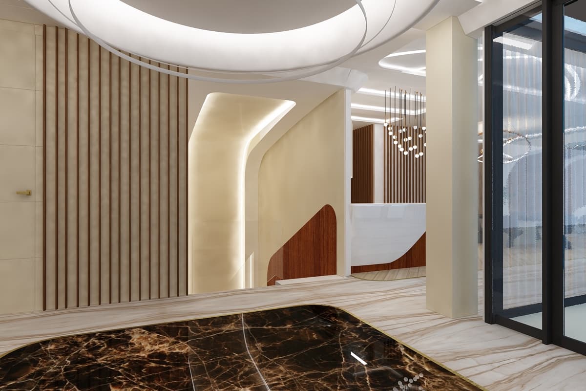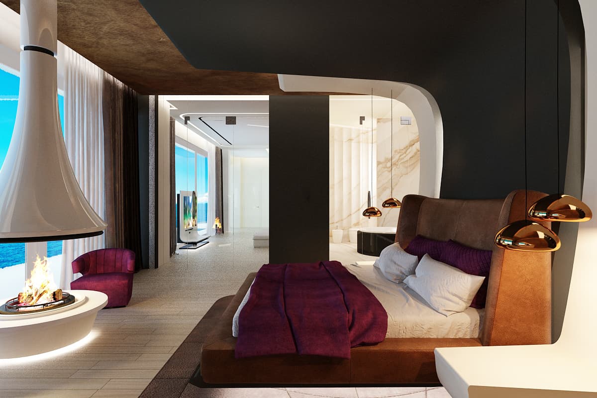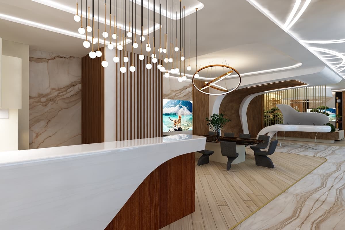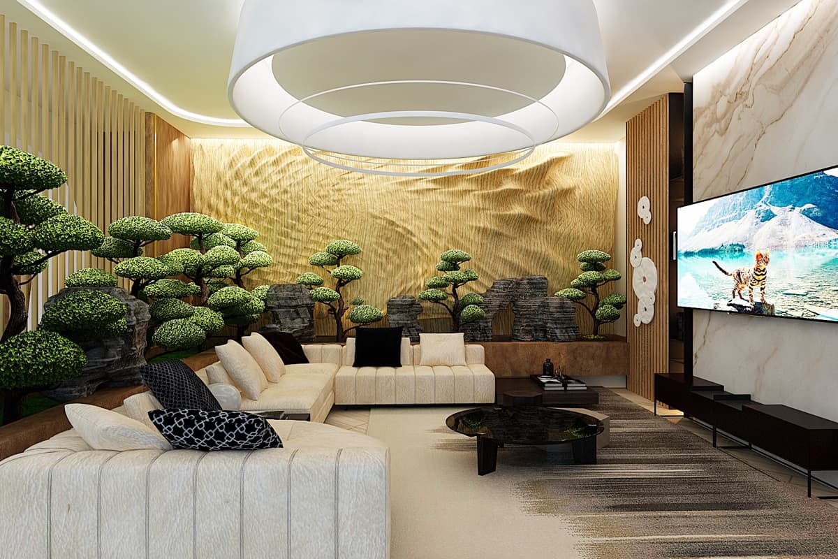 Летящие парящие формы дизайна интерьера виллы создают ощущение космического корабля. В проекте использованы: лаконичные формы, встроенная подсветка, натуральные материалы такие как дерево, мрамор, кожа. Предметы искусства, уникальные светильники, восточные мотивы вписаны в зону гостиной. Основной цвет гостиной — белый. Этот цвет создает воздух, пространство, чтобы ничего не отвлекало от панорамного вида на море из окна.