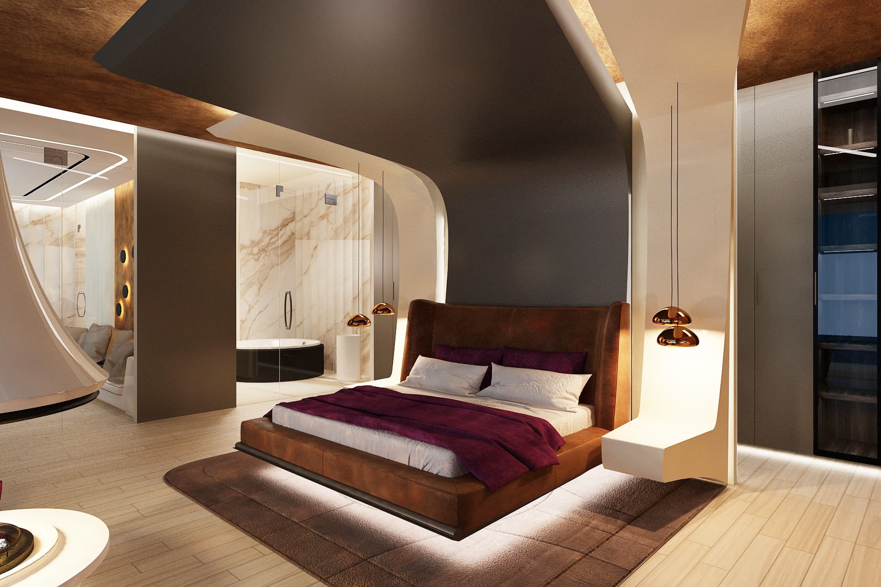 В спальне фигурное изголовье кровати парит в воздухе благодаря встроенной подсветке, за изголовьем расположена большая гардеробная с прозрачной перегородкой в ванную комнату.