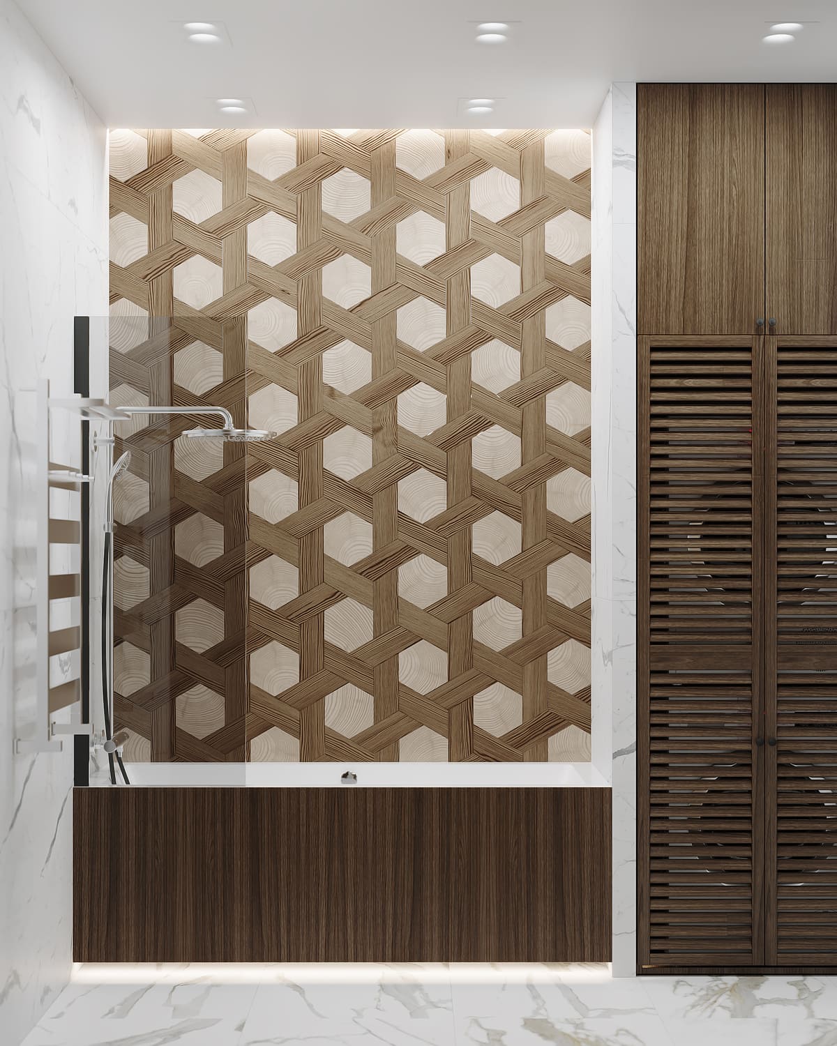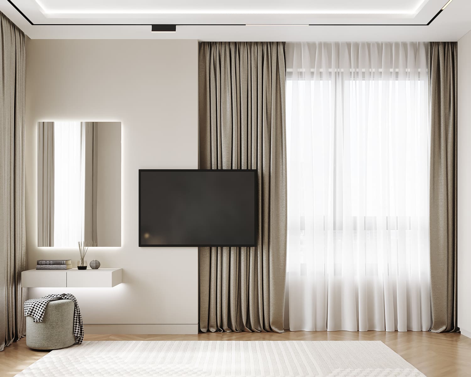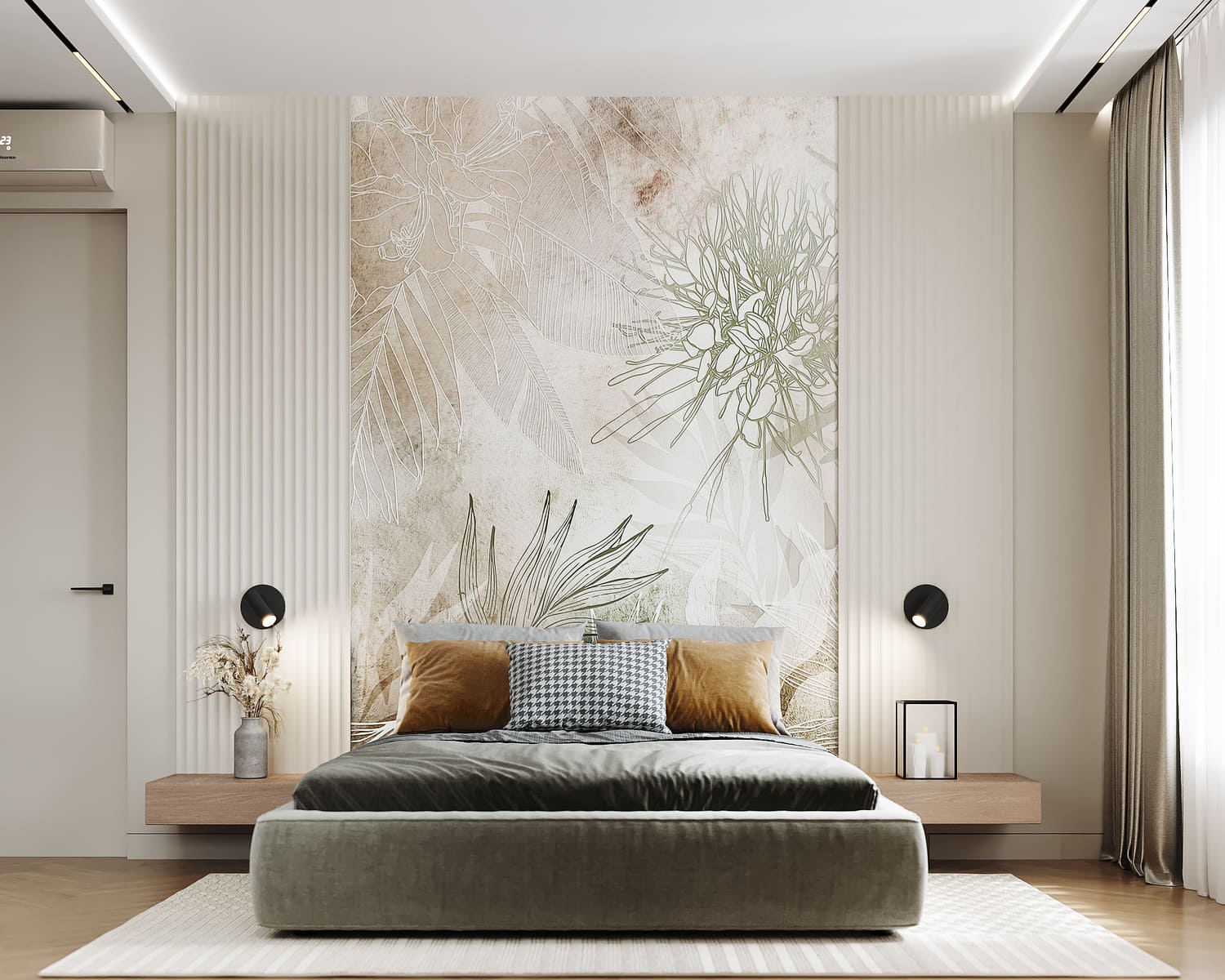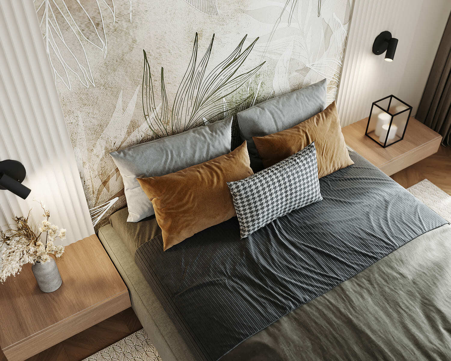 В спальне — более светлые цветовые решения. Бежевый, светло-серый, молочный и песчаный тона настраивают на спокойный удовлетворенный лад, уравновешивают колебания настроения. А в стене за изголовьем кровати — оригинальные пальмовые мотивы, которые тоже дарят ощущение гармонии.